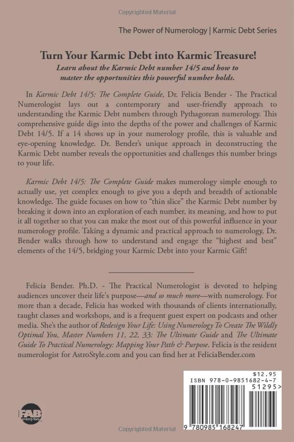 Turn your Karmic Debt into Karmic Treasure! Learn about the Karmic Debt number 14/5 and how to master the opportunities this powerful number holds. In Karmic Debt 14/5: The Complete Guide, Dr. Felicia Bender - The Practical Numerologist lays out a contemporary and user-friendly approach to understanding the Karmic Debt numbers through Pythagorean numerology. This comprehensive guide digs into the depths of the power and challenges of Karmic Debt 14/5. If a 14 shows up in your numerology profile, this is valuable and eye-opening knowledge. Dr. Bender’s unique approach in deconstructing the Karmic Debt number reveals the opportunities and challenges this number brings to your life. Karmic Debt 14/5: The Complete Guide makes numerology simple enough to actually use, yet complex enough to give you a depth and breadth of actionable knowledge. The guide focuses on how to “thin slice” the Karmic Debt number by breaking it down into an exploration of each number, its meaning, and how to put it all together so that you can make the most out of this powerful influence in your numerology profile. Taking a dynamic and practical approach to numerology, Dr. Bender walks through how to understand and engage the “highest and best” elements of the 14/5, bridging your Karmic Debt into your Karmic Gift!