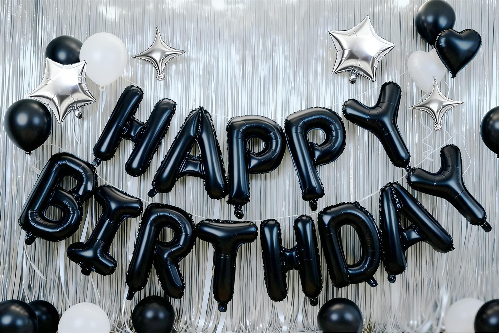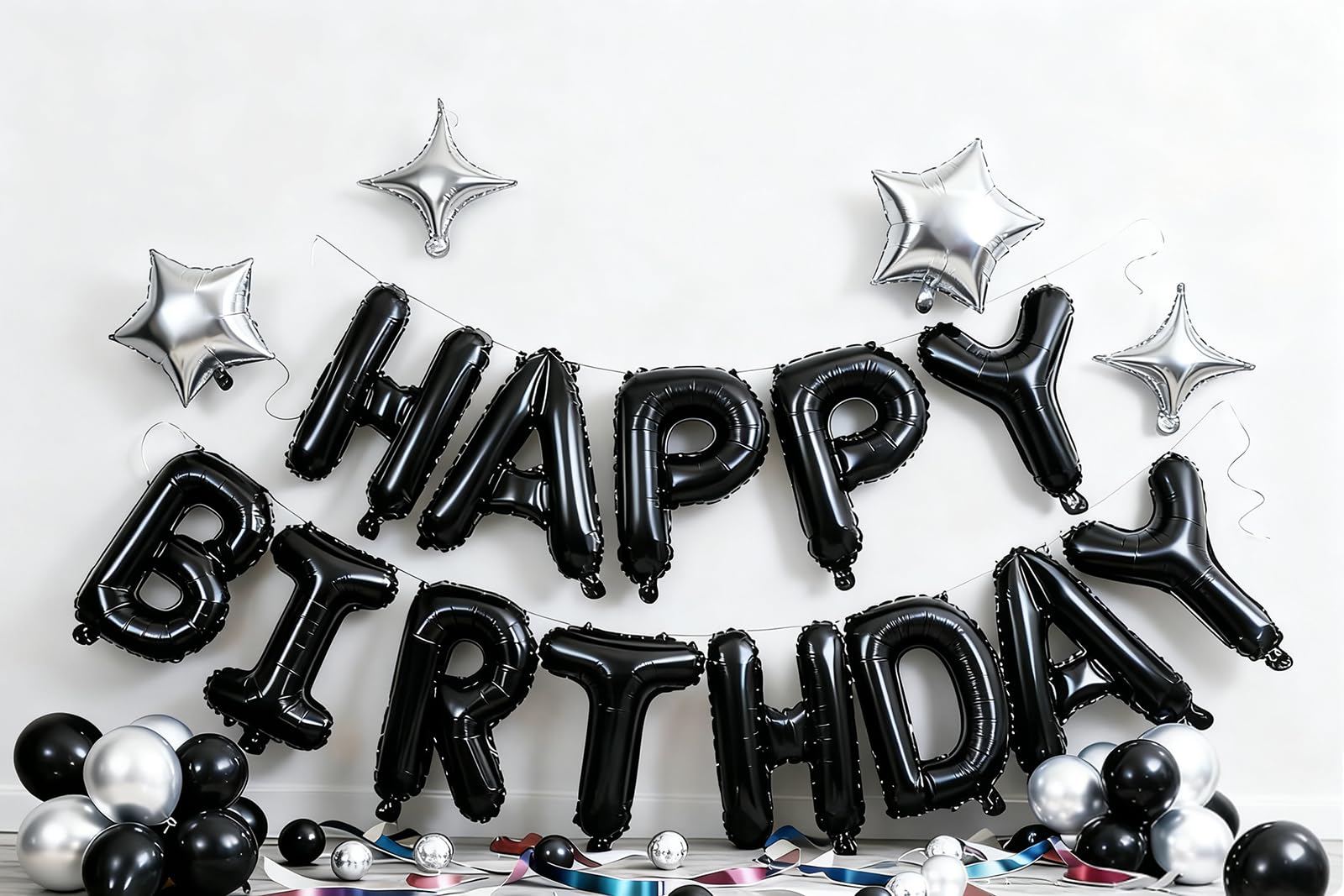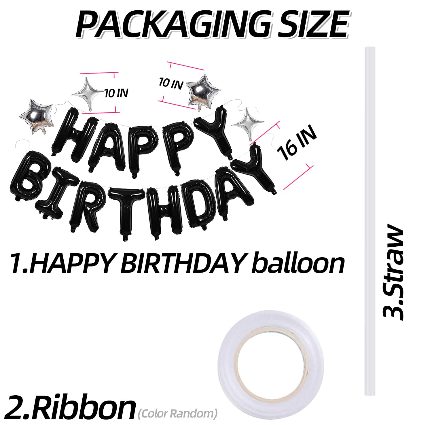 【Packaging content】16 Inch “HAPPY BIRTHDAY” Aluminum Foil Balloon * 1, 10 Inch Five Pointed Star Balloon * 2, 10 Inch Four Pointed Star Balloon * 2,Ribbon *1,Straw *1.