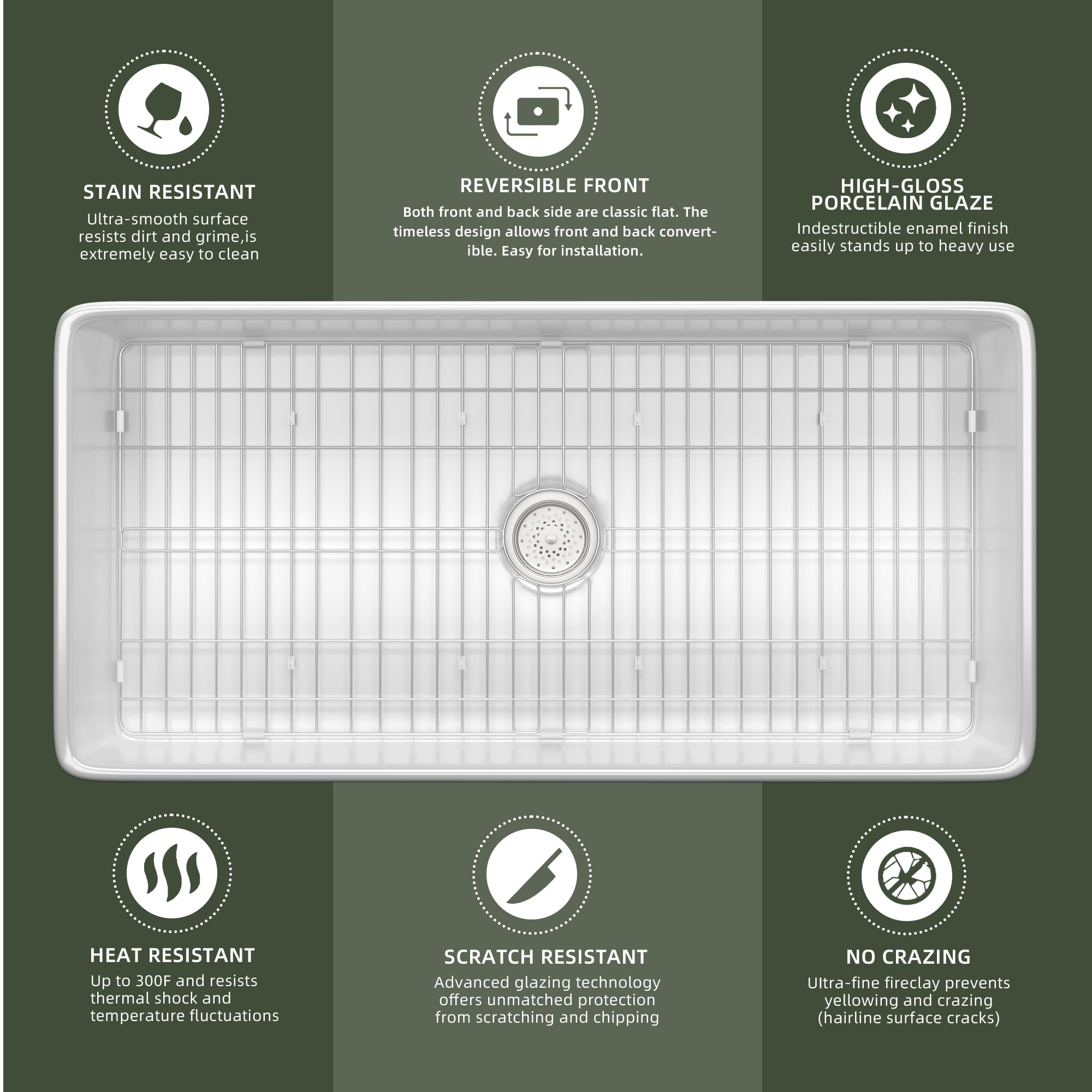 WHAT'S INCLUDED: TUKTUK white kitchen sink 33 inch has high-end tailored stainless steel protective bottom grid and sink strainer. The protective bottom grid inside the undermount farmhouse kitchen sink prevents any risk of scratches or discoloration on your fireclay farm sink's surface, and it also keeps dishes elevated for faster drying. The kitchen sink basket strainer helps filter waste food and prevent clogs.