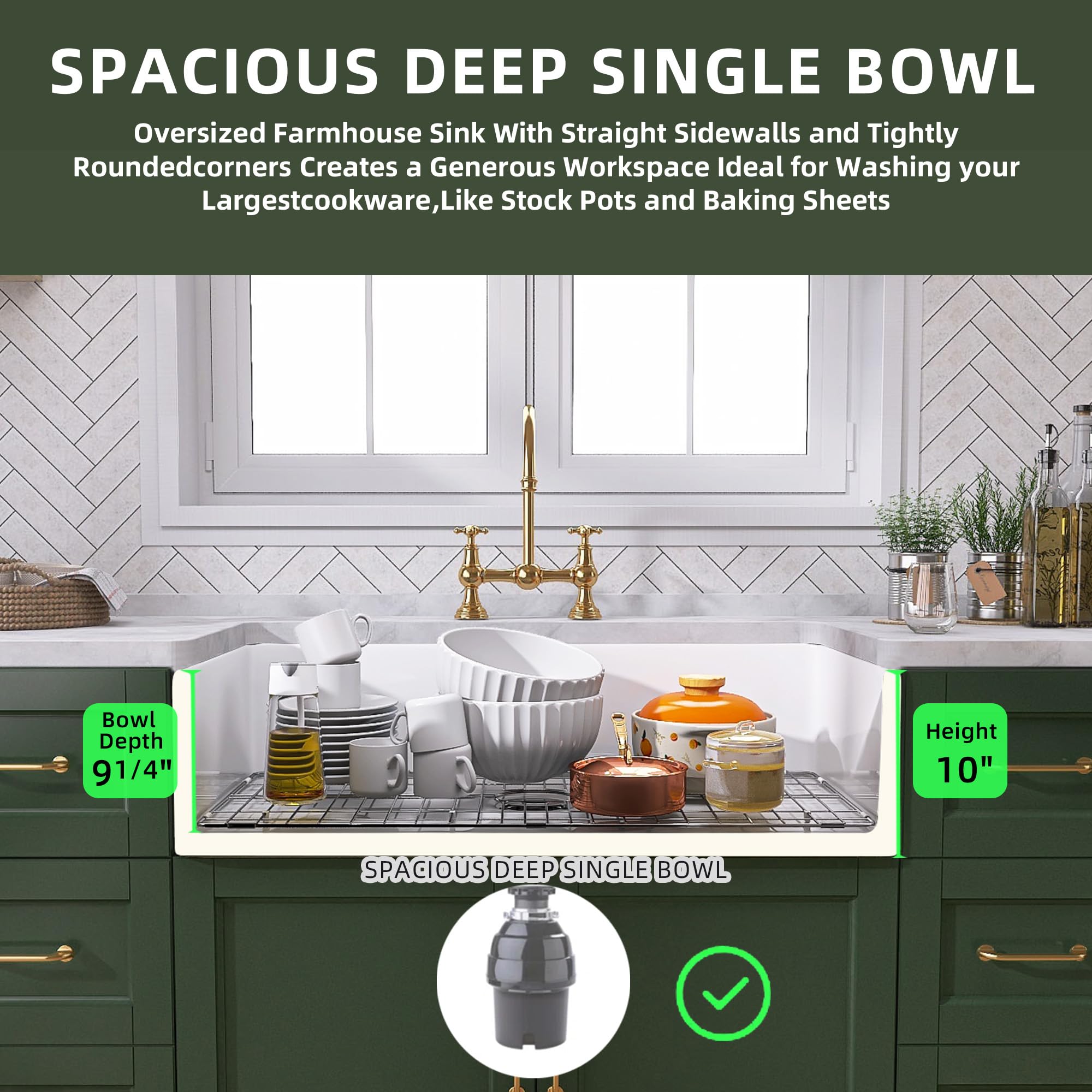 LARGE DEEP SPACIOUS FARM SINK: Our apron front farmhouse sink 33 in. with a large and spacious single bowl basin in size 33" L x 18" W x 10" H. This apron sink are designed to accommodate large and bulky cookware such as baking sheets, roasting pans, and oversized pots. 10-inch extra deep bowl kitchen sink makes it easier to clean and wash these items effectively. The spacious basin allows for easy maneuvering and multitasking in the white farm sink. TUKTUK fireclay white sink is a practical and stylish addition to your kitchen design.