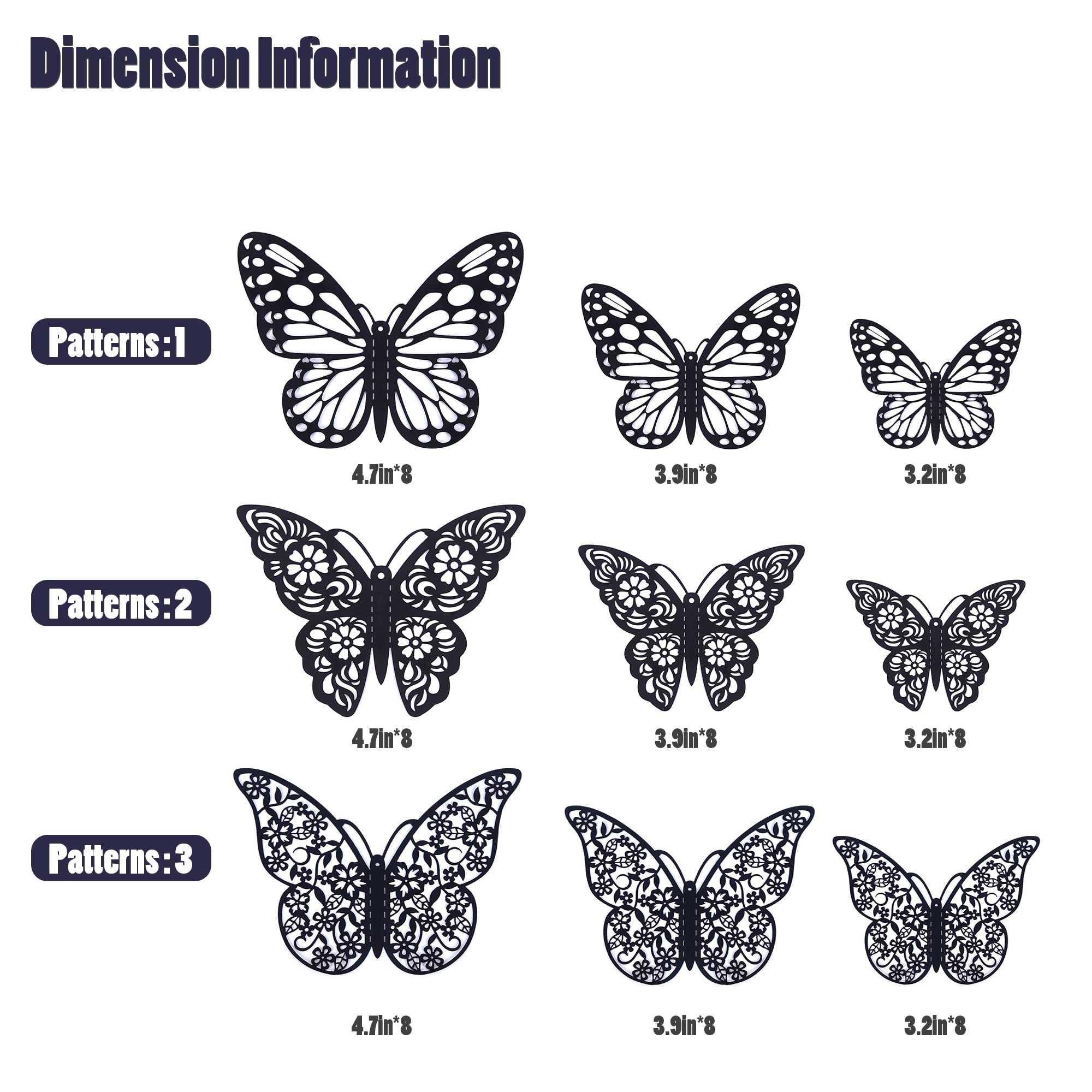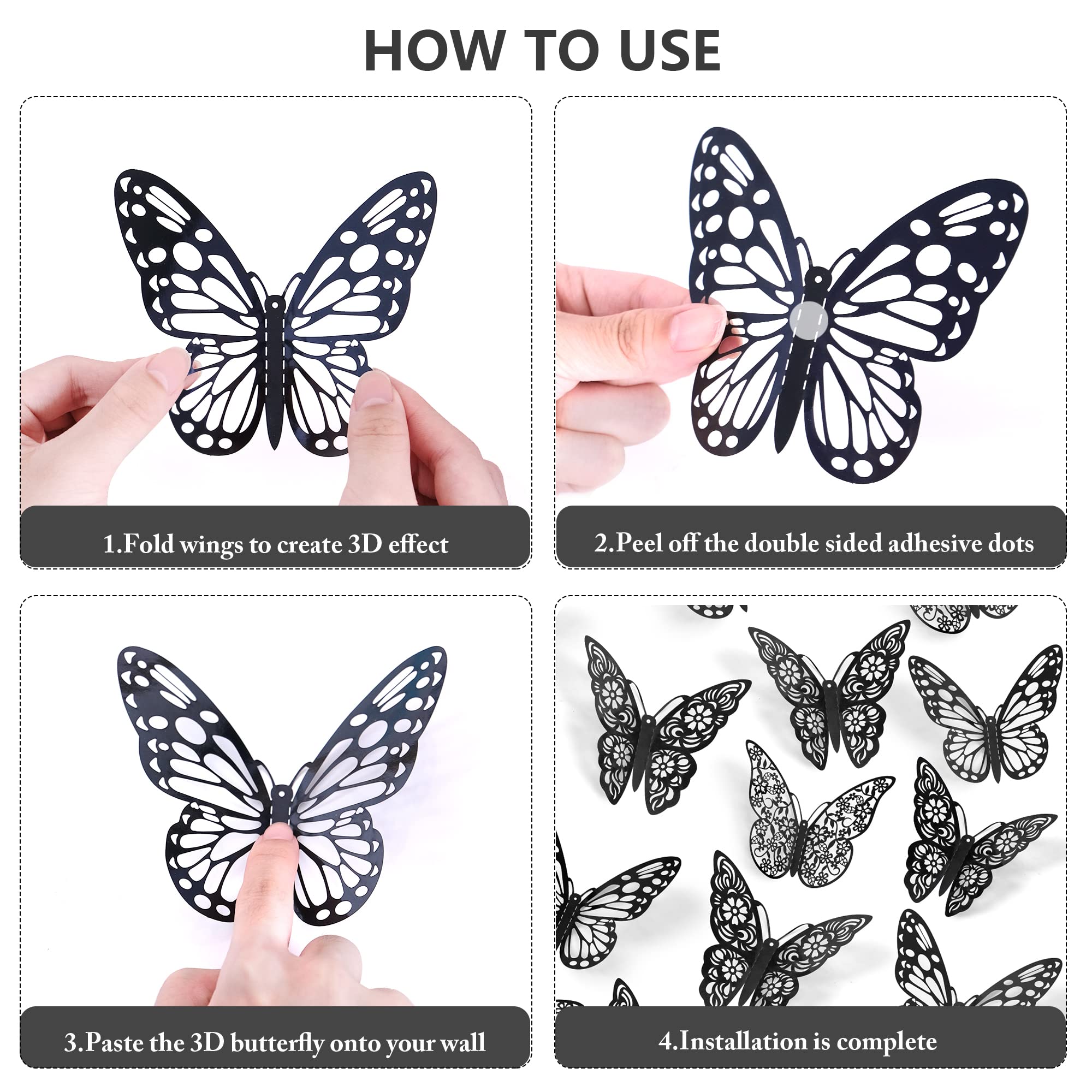 【Package Included】72pcs butterfly wall stickers: 24 pcs Style 1, 24 pcs Style 2, 24 pcs Style 3, each style has 3 sizes(3", 4", 5") and each size has 4pcs. Coming with 72pcs double sided adhesive dots.