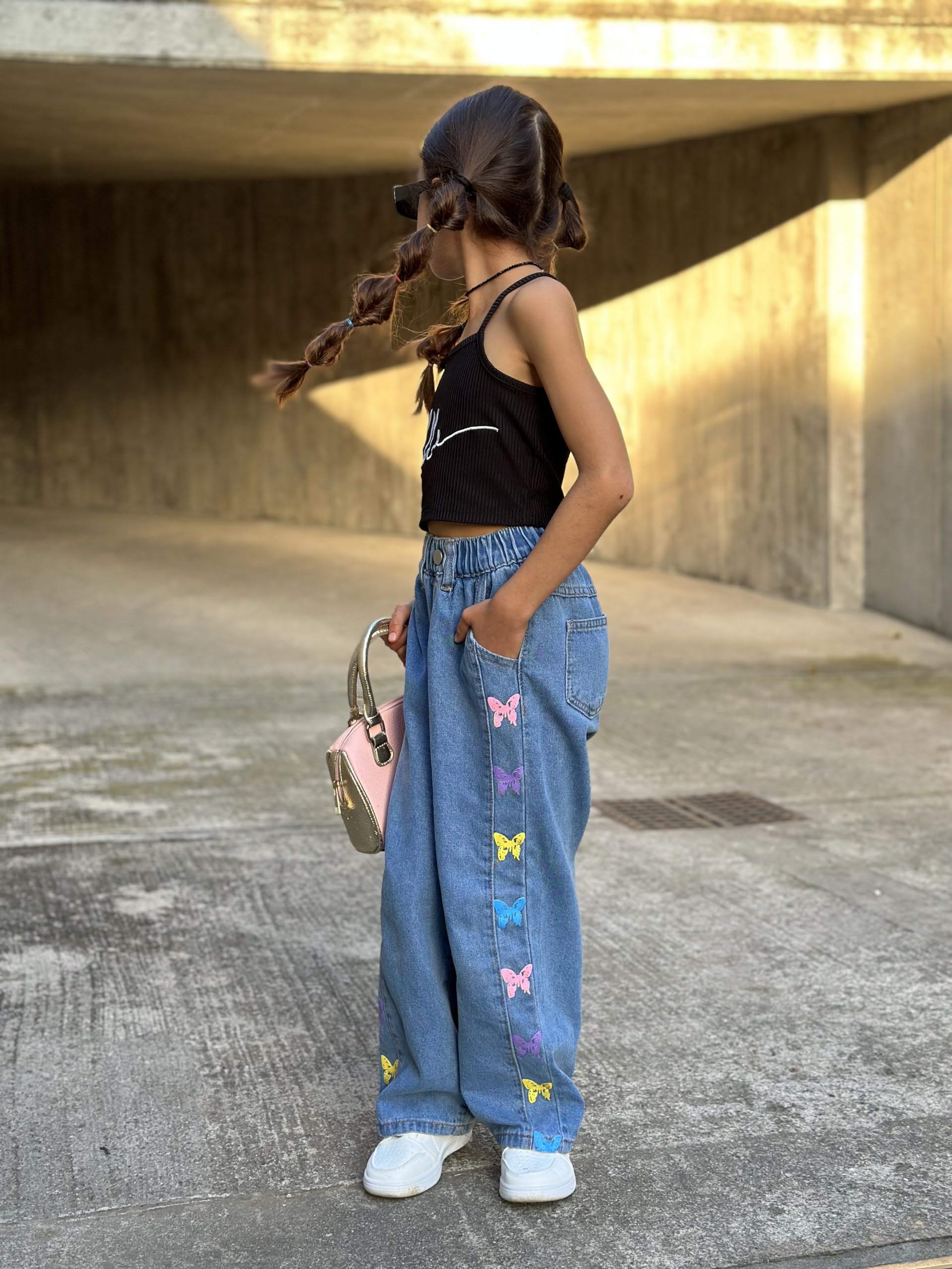 Features: Girls blue baggy Jeans with trendy colorful butterfly print, 2 pockets on front offer functional flair. Elastic waistband expands for a perfect fit and easy to wear, NO pilling.