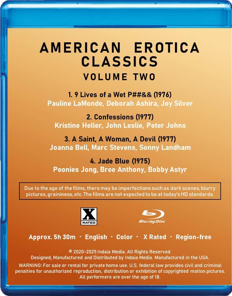 Film titles: 1. 9 Lives of a Wet P##&& (1976) 2. Confessions (1977) 3. A Saint, A Woman, A Devil (1977) 4. Jade Blue (1975) -- X-rated -- Approx 5 hrs 30 mins -- 1 blu-ray disc -- Region-free -- 7 mm blu-ray slim case 2025 Copyright Indaia Media. All rights reserved.
