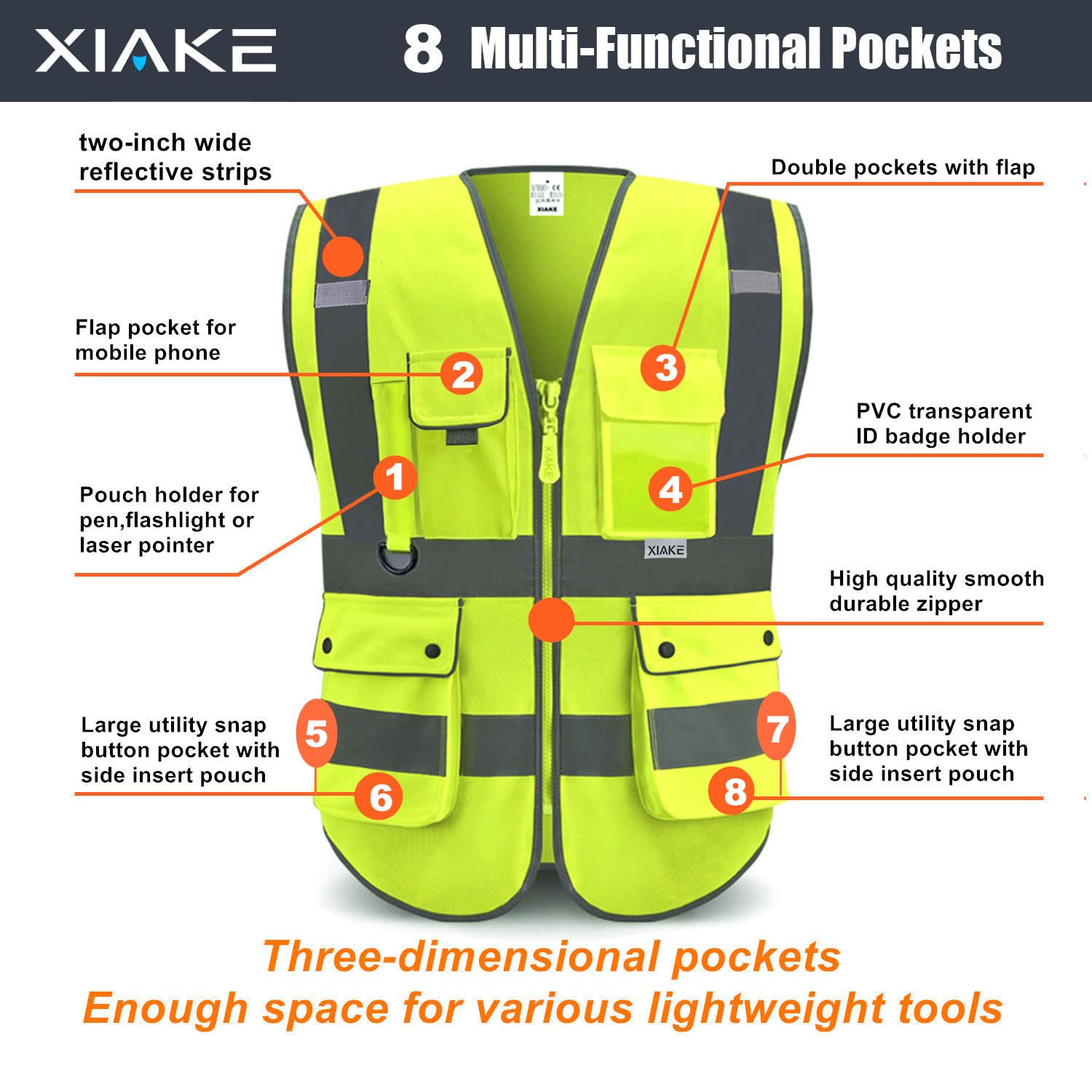 8 Multi-function Pockets Designed: This XIAKE Safety Vest comes with 8 front pockets with zipper velcro clamshell closure for easy categorization and easy access that bring you great onvenience. Enough space for various tools and equipment, such as mobile phone,flashlight,laser pointer,business card and other items