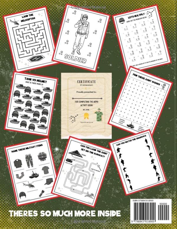 *** CALLING ALL MILITARY LOVING KIDS** AND A SPECIAL BONUS CERTIFICATE PAGE ON COMPLETION Is your child mad about the Army? if so then this Army themed activity book is just for them. This is a great book for boys and girls who love the military and want an Army themed activity book to keep themselves entertained and happy for hours. The book is perfect for car journeys, weekend activities or general entertainment. This is a highly addictive army activity book will keep kids busy, happy and entertained with a wide variety of military themed fun! Activities include: Coloring pages Different shaped mazes ( triangle, circle, square. hexagon) Word searches Complete the picture Story themed mazes (unique) Odd one out Find and search *BONUS ARMY CERTIFICATE PAGE ON COMPLETION* Each activity is designed to bring out your child’s creative side and aims to educate them along the way AND there are no repeats *CHECK OUT OUR BACK PAGE FOR EXAMPLES! Suitable for taking on holiday, car journeys or on the plane or for fun at home. Solutions to the activities can be found in the book Great Army gift idea for boys and girls. Makes a great Christmas, birthday or kids parties Book details 50+ pages of activities for hours of fun ( Plus Bonus certificate page) Premium glossy cover 8.5x11 book size Single sided pages where applicable ( stop bleed through or simply use to sketch anything) Perfect for Boys and Girls ages 4-8, 6-12 Parents can join in too! If you are looking for something to keep your child/children occupied and happy for hours, then this activity book is for them. Enjoy