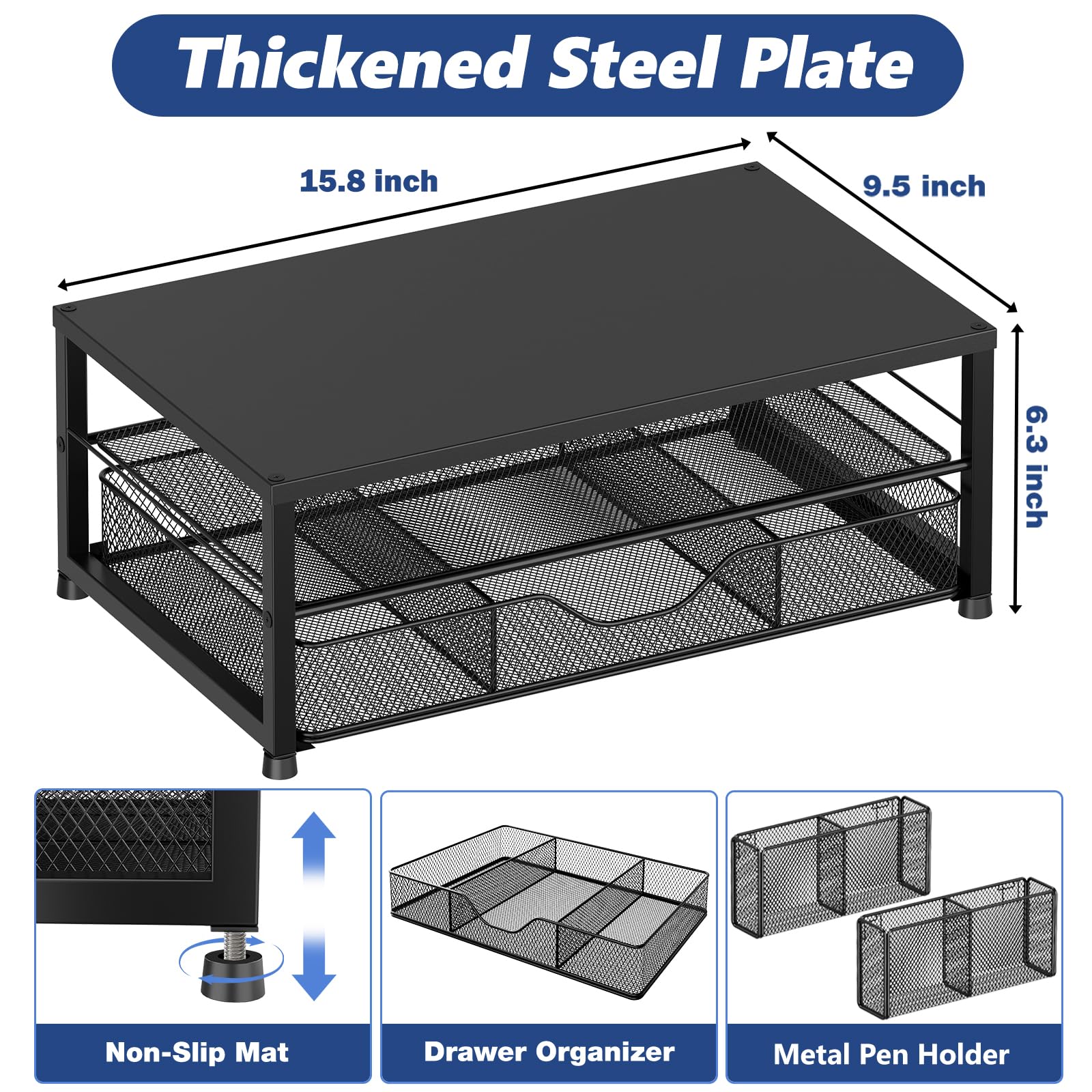 【Save Space】:This 2-Tier monitor stand with drawer and 2 hanging pen holders provides ample storage space to keep your office supplies and office desk accessories neatly organized and easily accessible, keeping your workspace tidy and improving your sense of well-being