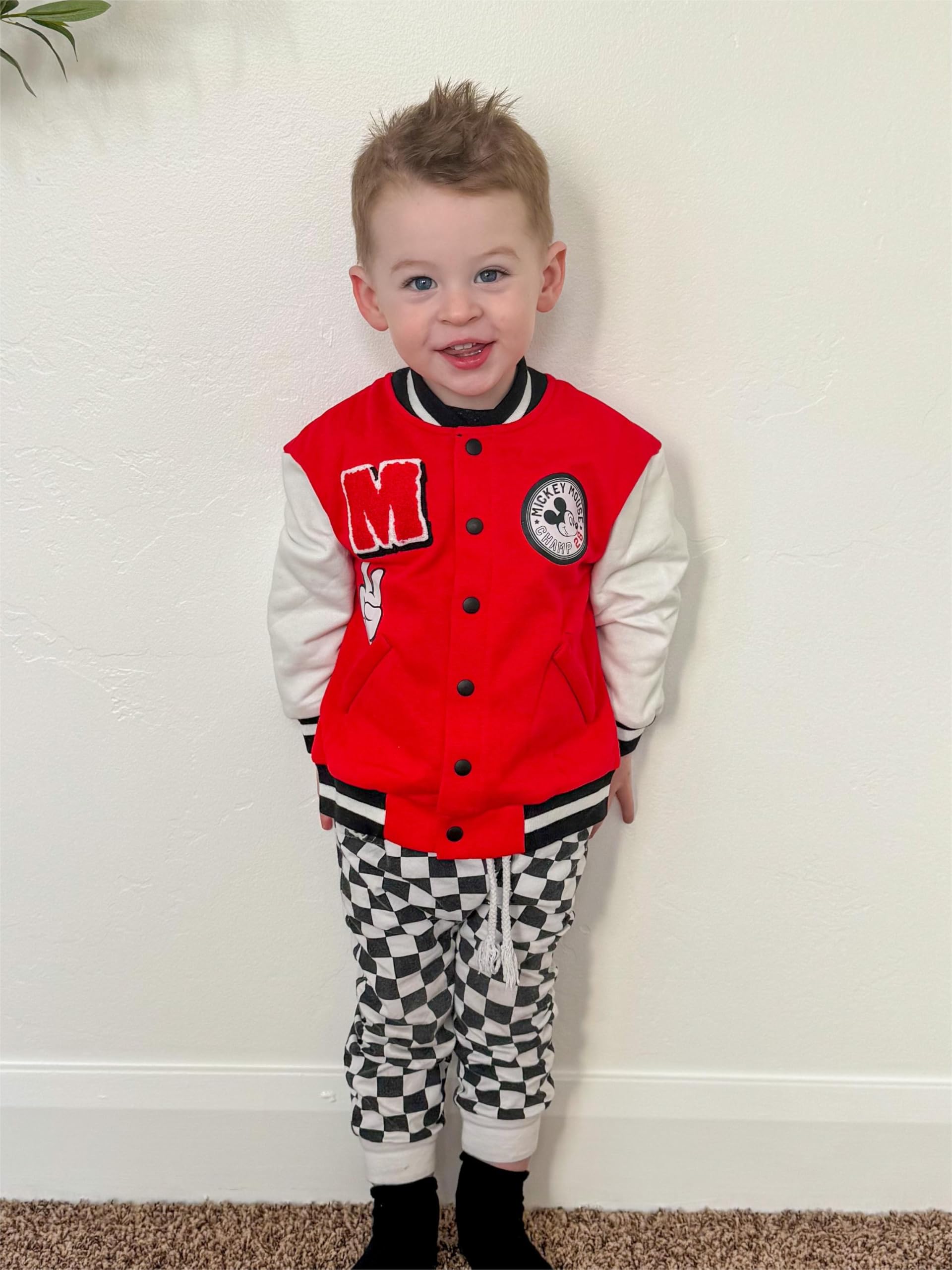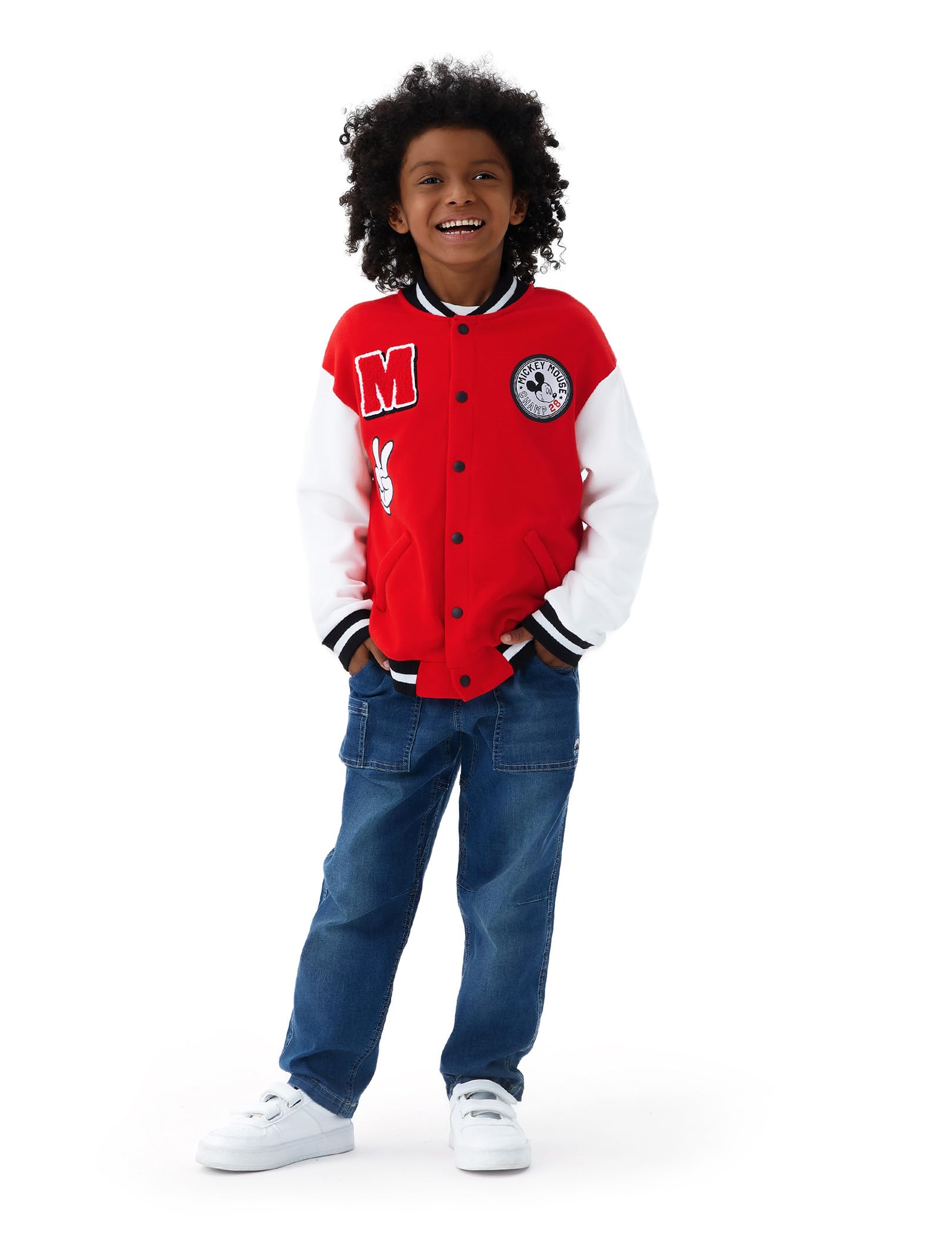 Charming & Bold Design: Let your little one show off their Disney style with this Mickey Mouse varsity jacket! Featuring bold patches, including an "M" for Mickey and a playful peace sign, this red jacket with white sleeves offers a sporty, fun look. The "Mickey Mouse Champ" patch adds extra flair. Perfect for kids aged 3-10, this jacket is ideal for casual outings, school, or any Mickey Mouse fan event, offering both style and comfort