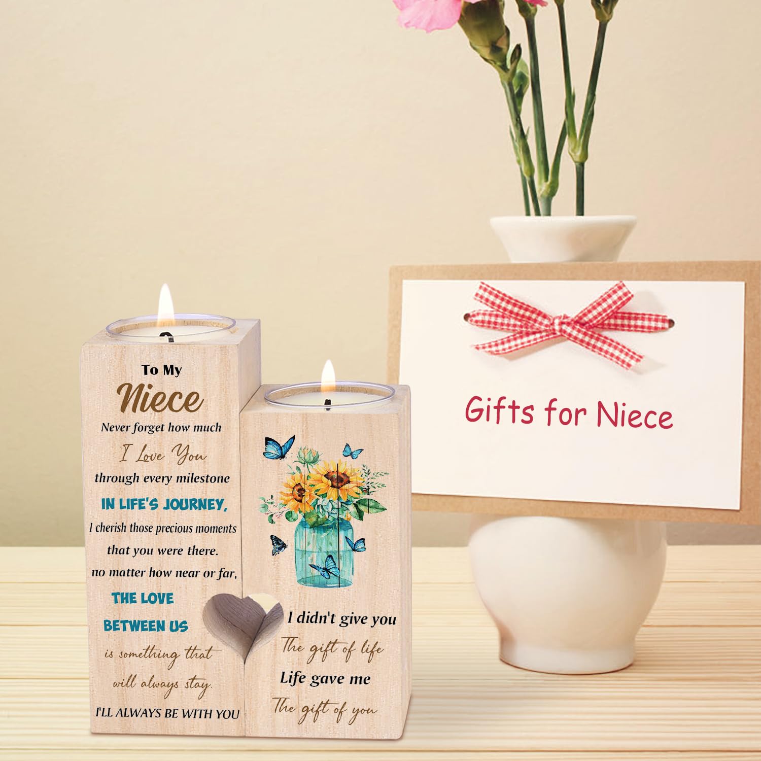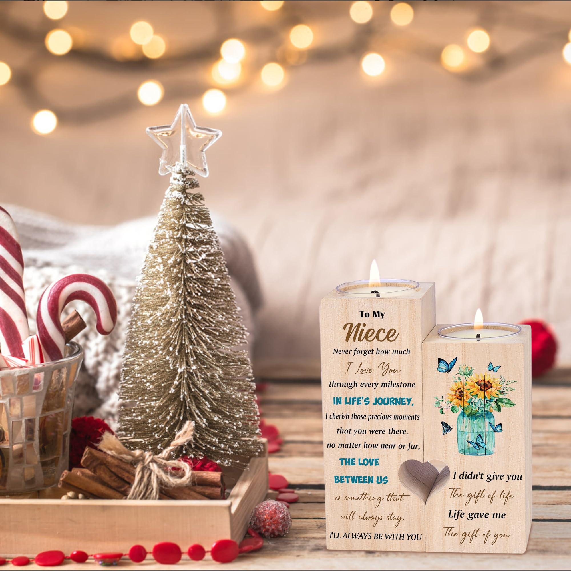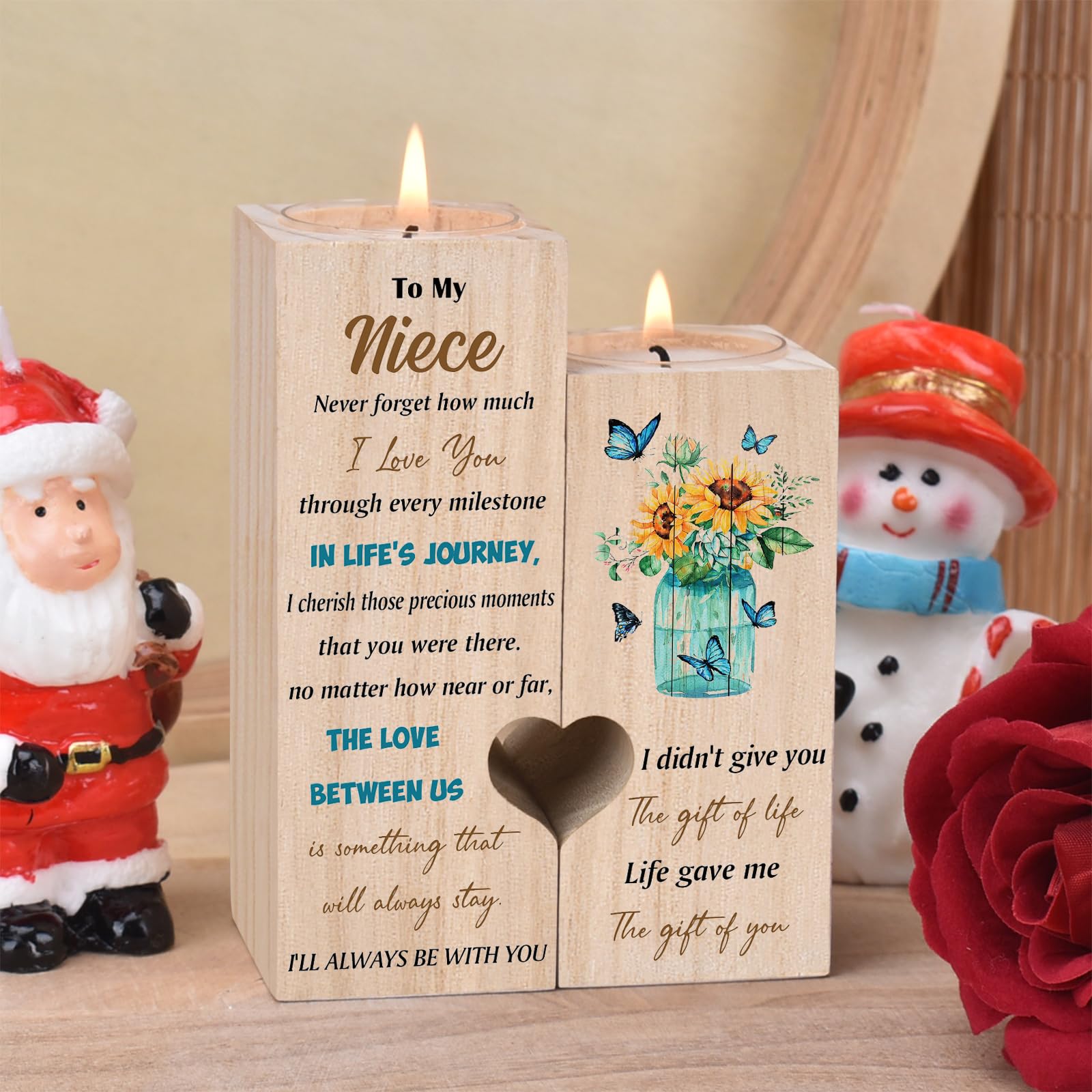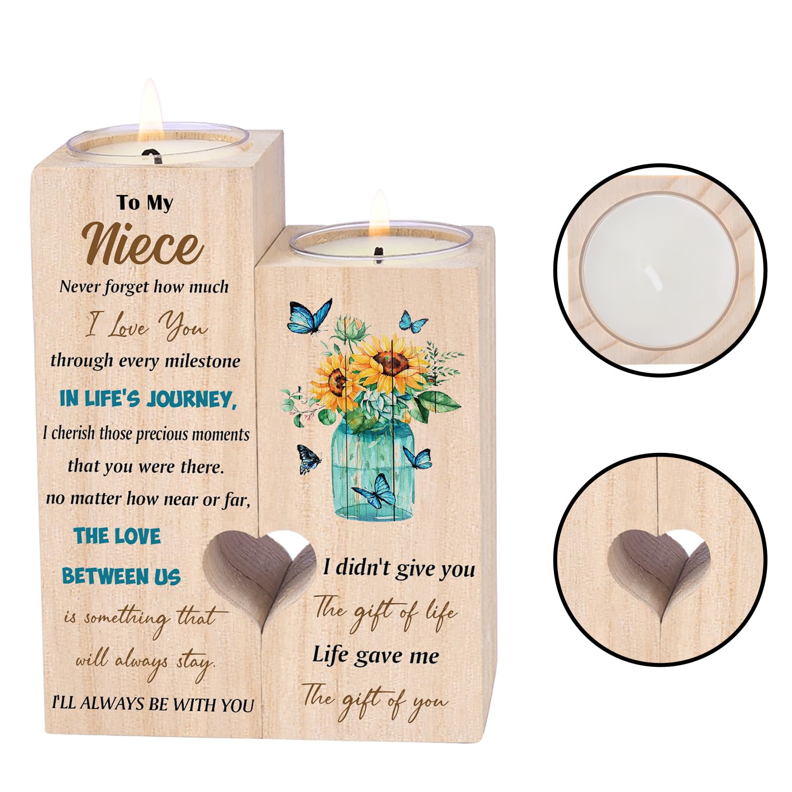 To My Niece - Never Forget That I Love You. Surprise Your Niece With This Gift and Melt Her Heart! Product Details: Material: Wood (include candles) Height: 4 .78inch/12.15 cm Width: 3.5 inch/ 9 cm Candle Size: 1.5in/3.8cm Includes: 2 x candle holders, 2 x candles, 1 x box Due to the nature of the wood grain, the colors may not be the same as in the picture.