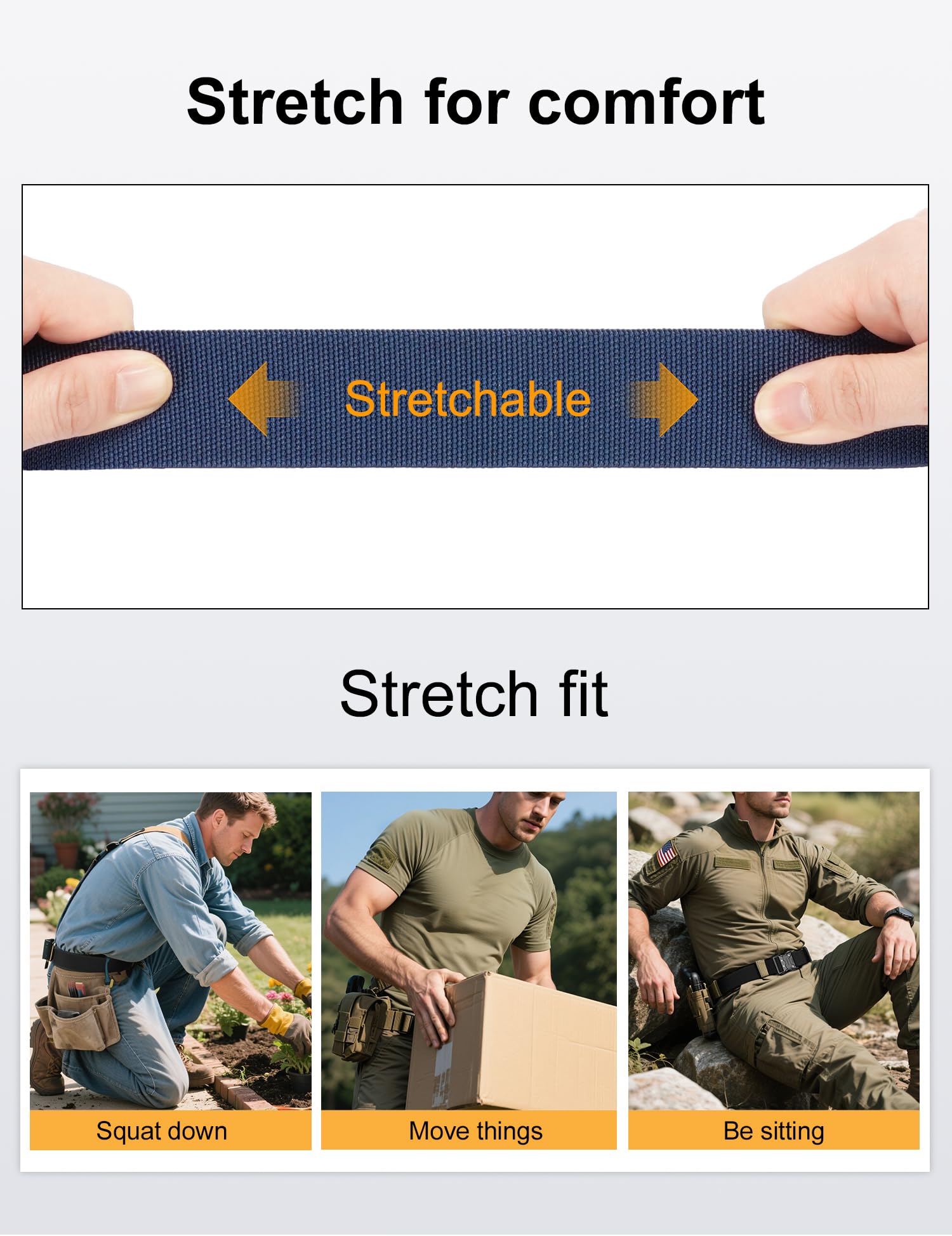 HIGH QULITY STRETCH NYLON:We intent to make the strap be stretch. The strap is made by special stretch material which is more solid than regular belt. More than that, it is very sturdy as well as stretch, which make your waist be more comfortable as well as stay tight, when you take large range of activities. Anyone who do physical activities for a long period of hours will get a great use out of the tactical belt