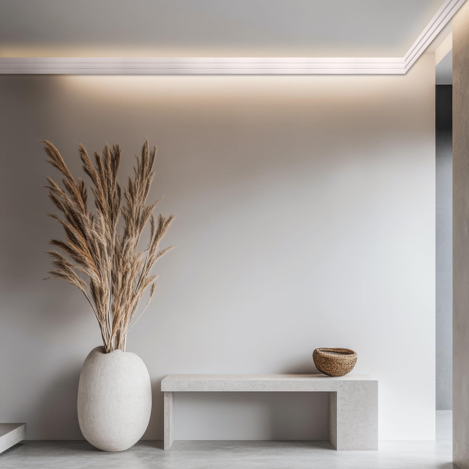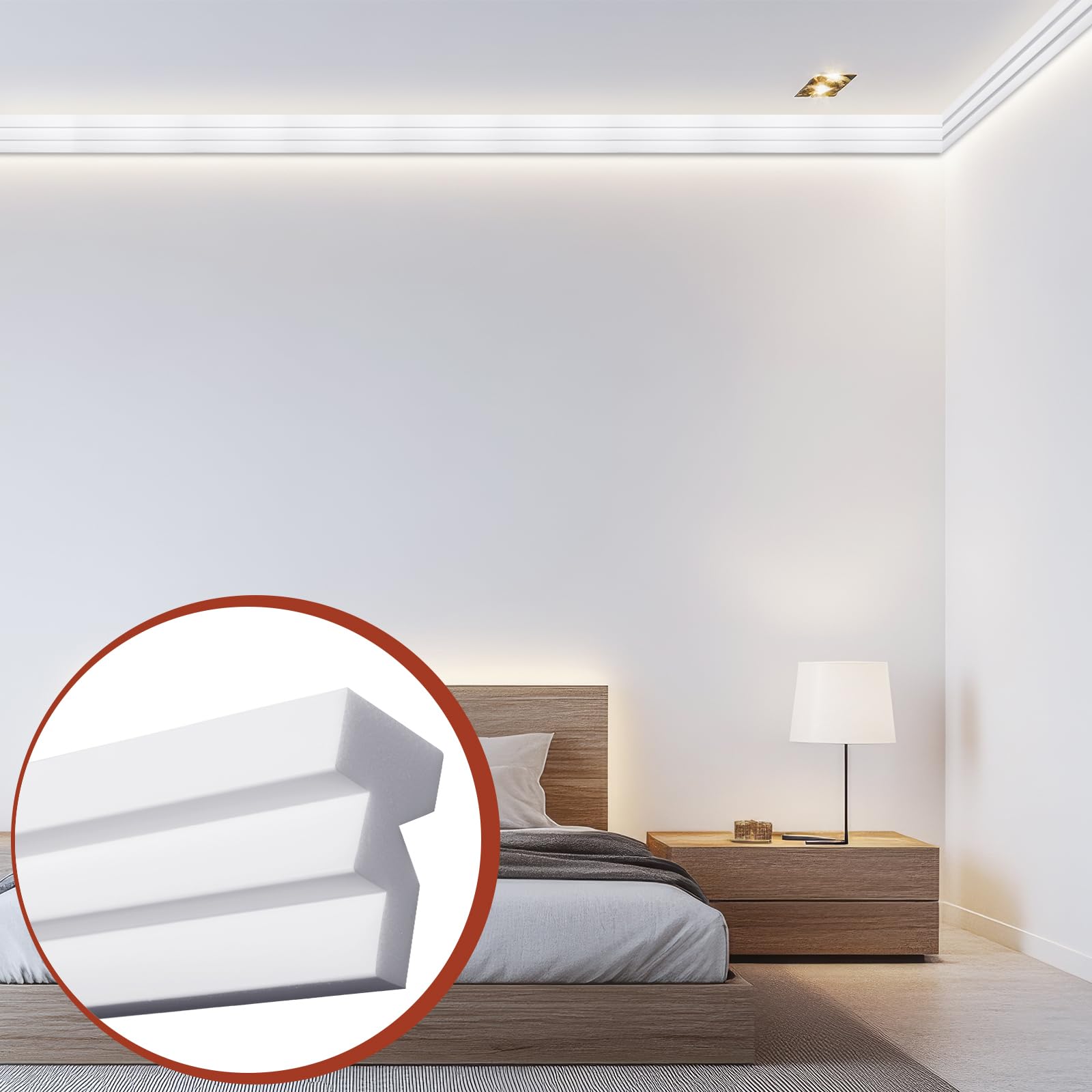 Polystyrene Crown Moulding: quality LED crown moulding with integrated light channels; Lightweight, sturdy, and easy to install; Its versatile design is suitable for adding soft ambient lighting and a modern aesthetic to any room