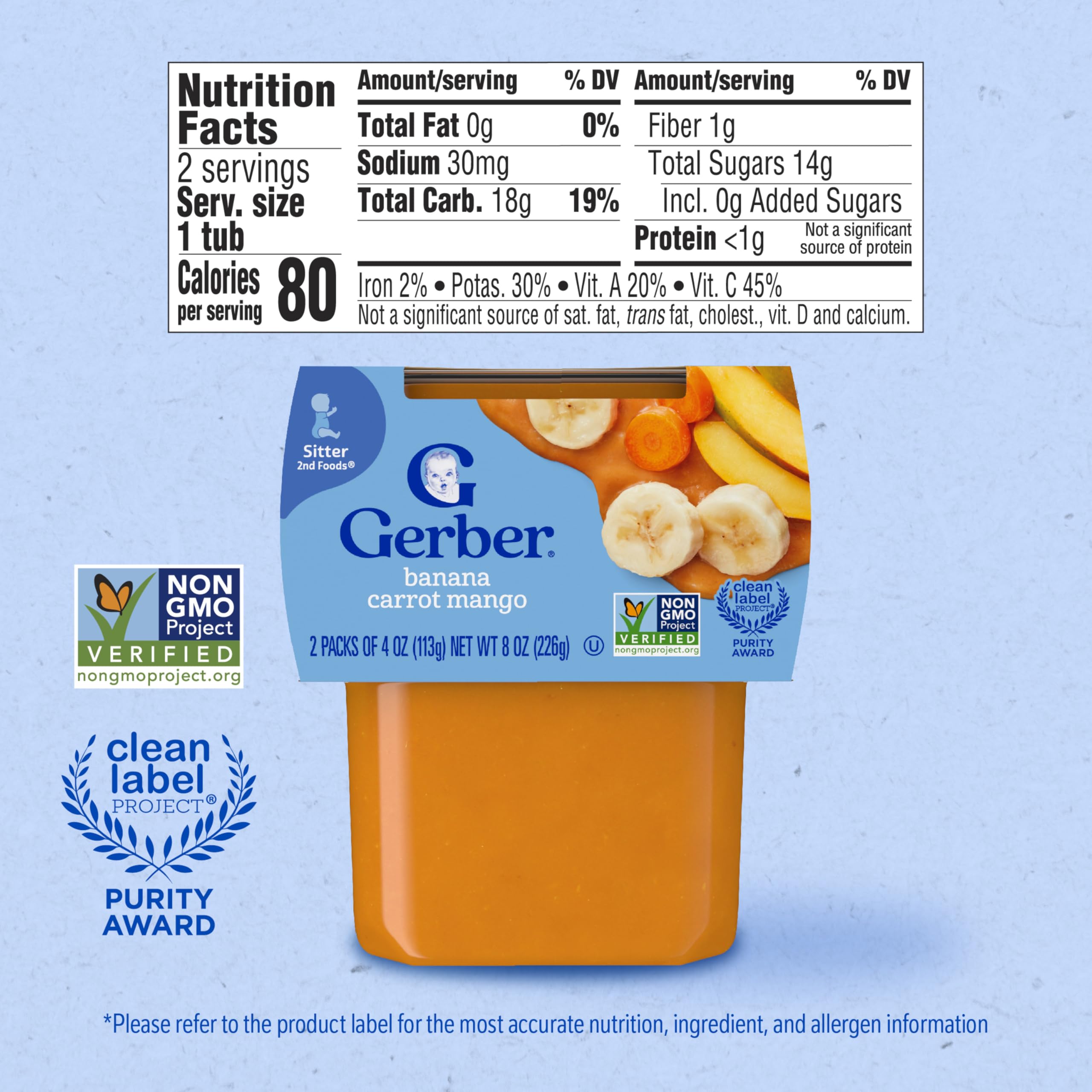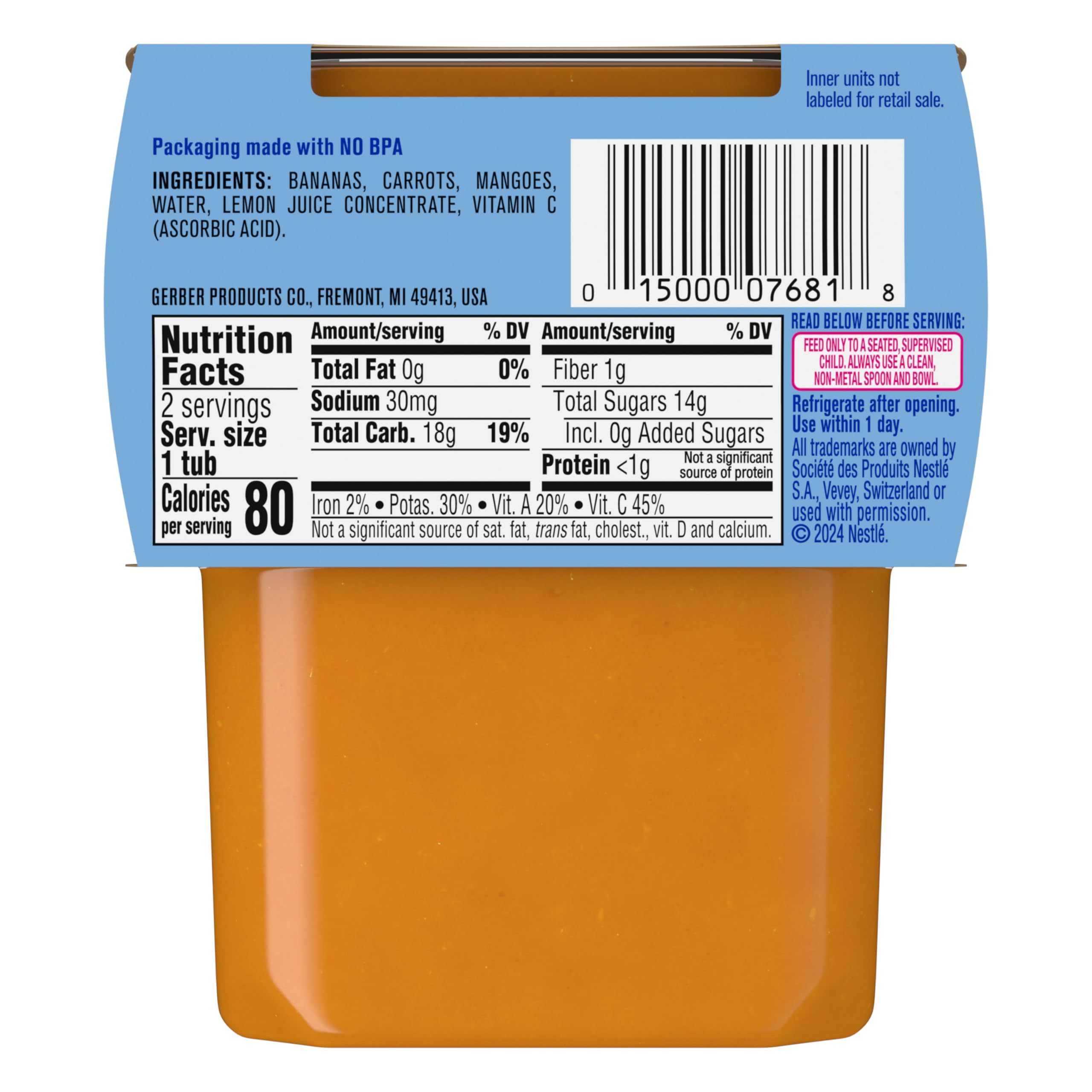 Gerber Stage 2 Baby Food, Banana Carrot Mango Puree Tubs are a premium choice for your child’s early stages. Crafted to help support their nutritional needs, along with meeting the busy lifestyle needs of caretakers and parents. Each baby puree tub comes in a portable, easy-to-store format – making it perfect for life’s busy moments. This stage 2 baby food puree is designed for babies who are 6 months + and are ready to explore new textures and flavors. Gerber understands the importance of providing wholesome ingredients during the crucial developmental stages of your child's life -- that’s why our baby puree is Non-GMO Project Verified. Gerber baby puree is ideal for parents who seek a convenient and high-quality option in their baby's diet. These tubs need to be refrigerated after opening and must be used after 1 day.