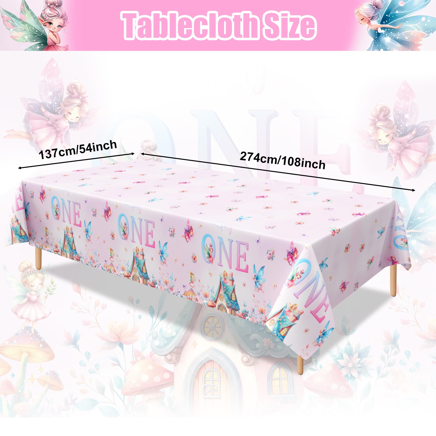 Package Includes:3 x Fairy first tablecloths Features: 1. Tabletop protection 2. Party decoration 3. Easy cleanup Size: 54 x 108 inches Material: Plastic Remarks: 1. Please allow slight deviation in size. 2. Colors may vary slightly due to different screen displays. 3. Plastic odor may exist, please ventilate upon receipt.