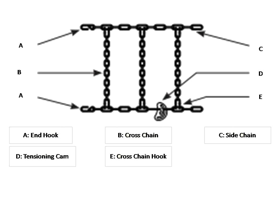 Cam Tire Chains - The four outside tensioning cams contribute to a secure & snug fit around the tires. This ensures that the wheel chains for snow remain properly aligned & in place, minimizing the risk of slippage or disengagement during operation.