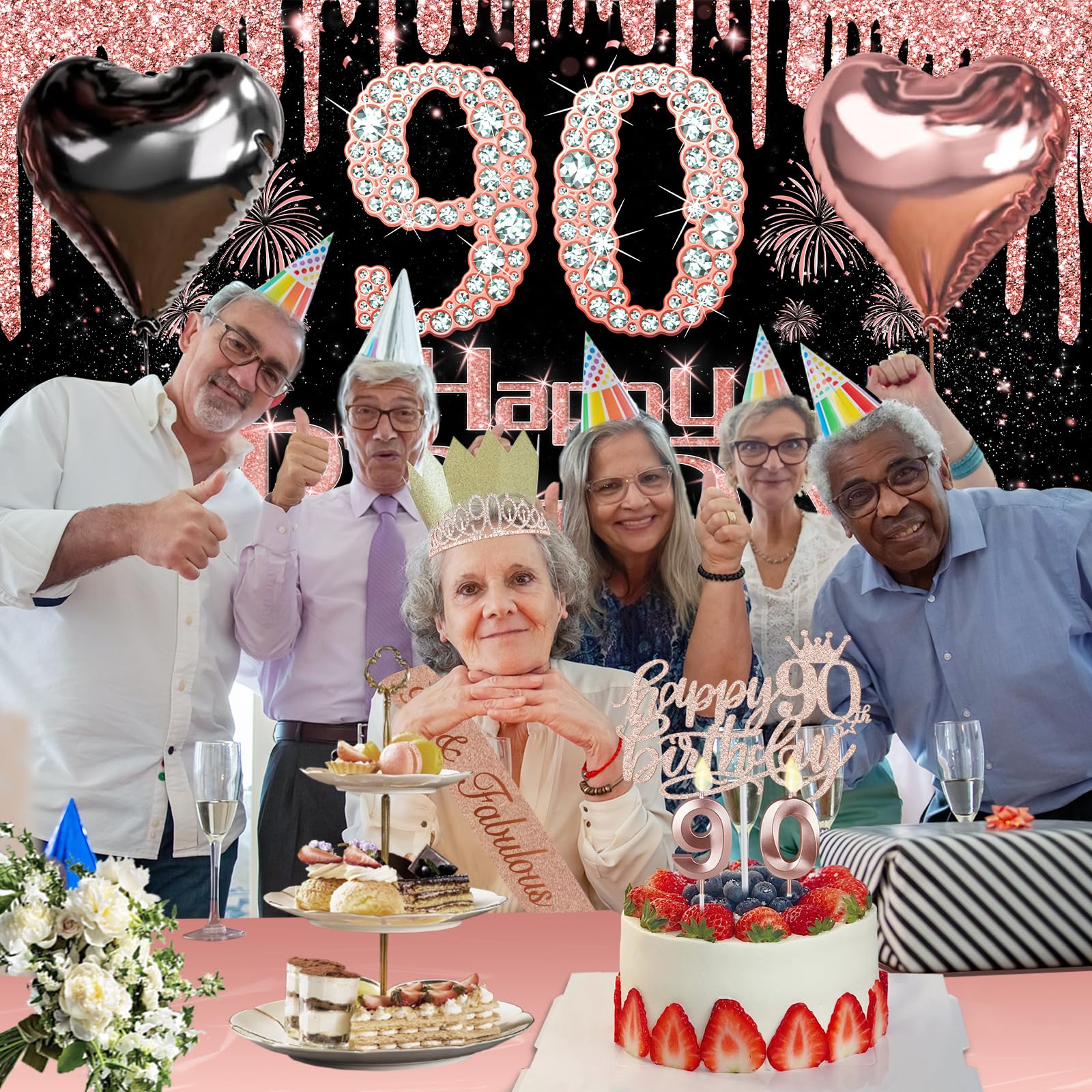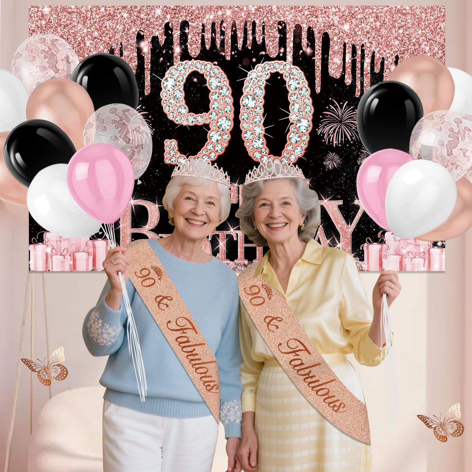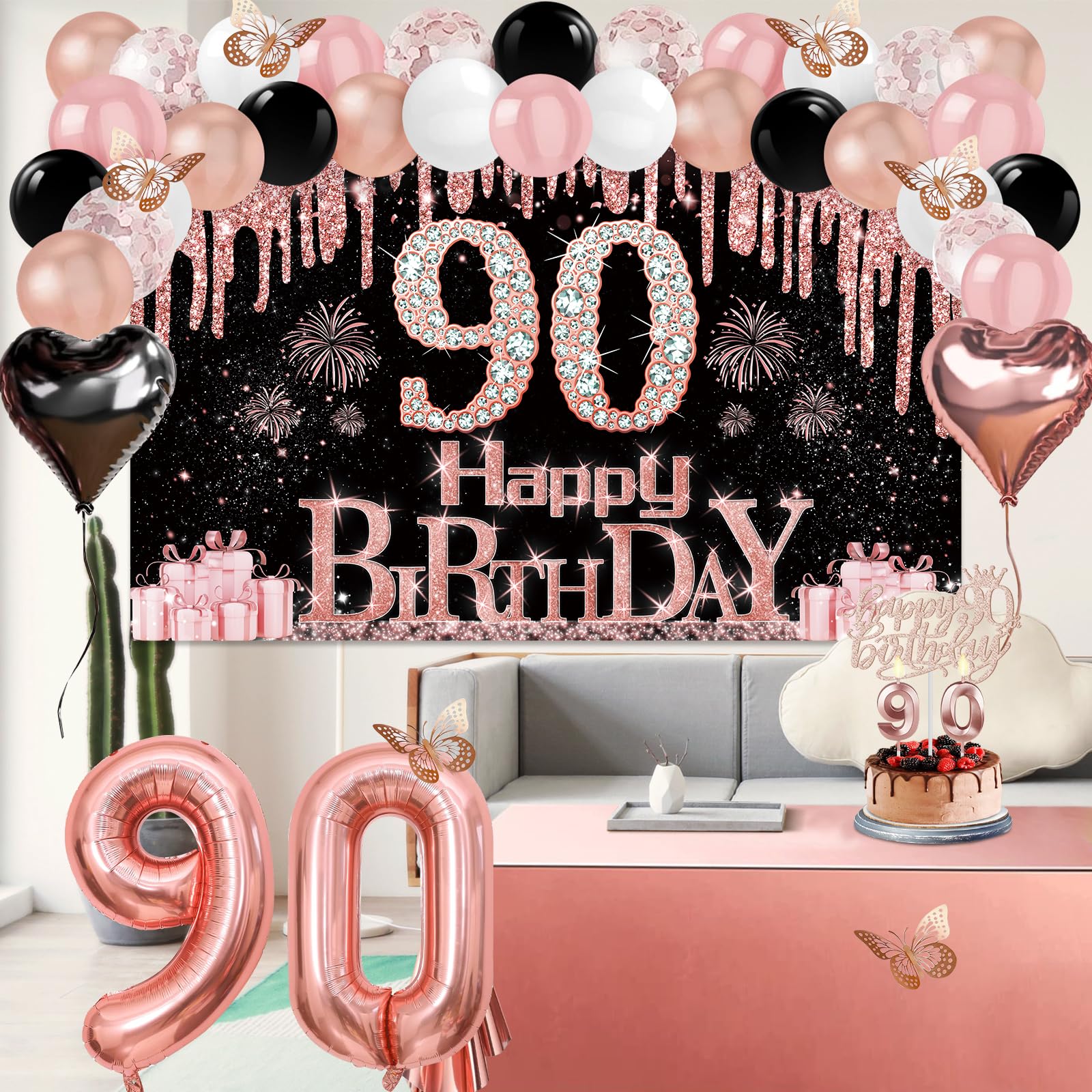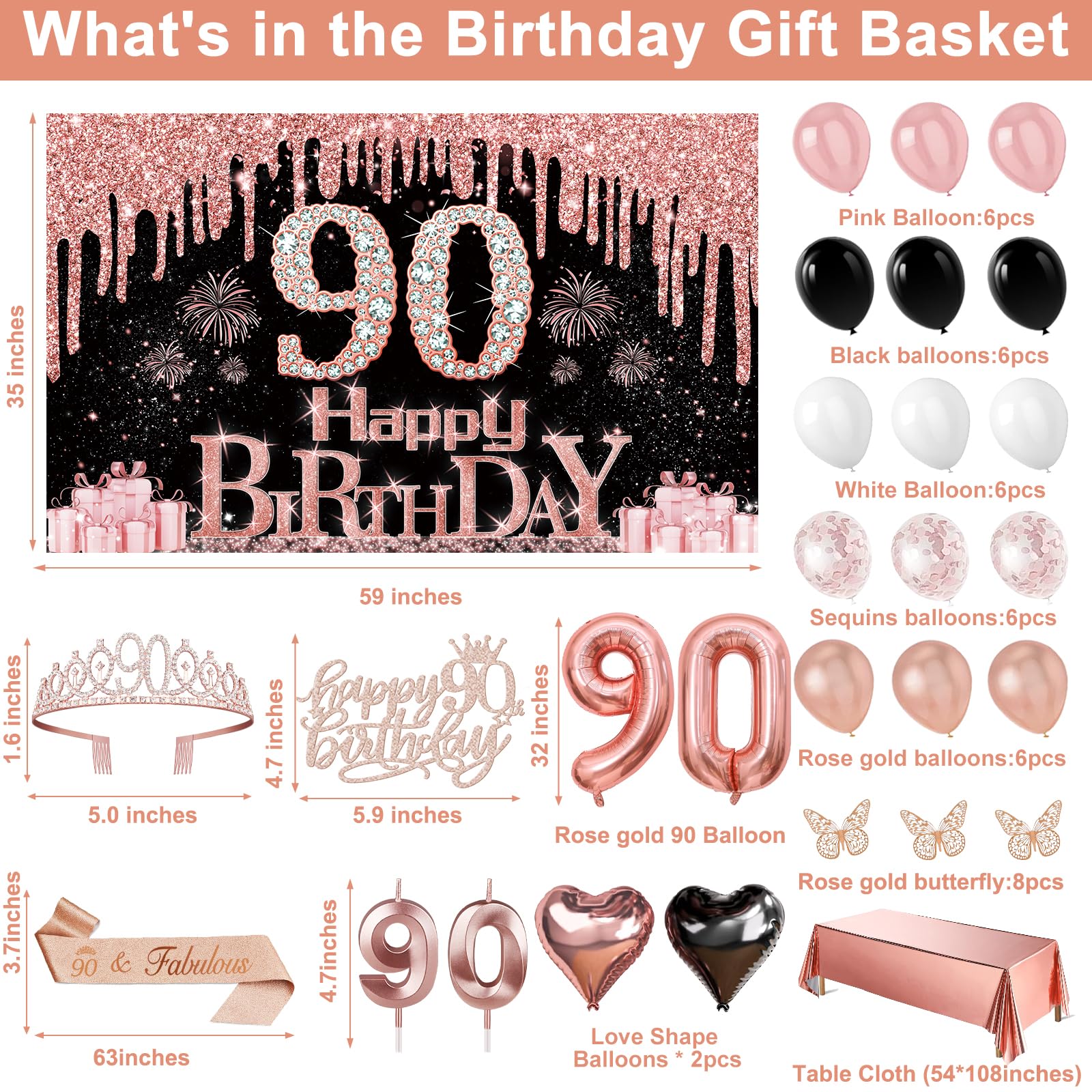 90th Birthday Decorations: Package coming with 90th Birthday Banner *1pc, 90th Birthday Tiara *1pc, 90th Birthday Sash *1pc, 90th Birthday Cake Topper *1pc, 90th Birthday Candles *1set, Rose Gold Butterflies *8pcs, Number 90th Birthday Balloons *1set, Love-Shape Balloons *2pcs, Latex Balloons * 30pcs, and Rose Gold Tablecloth *1pc. This complete 49pcs 90th birthday party decoration pack is the best way to meet different decorating needs