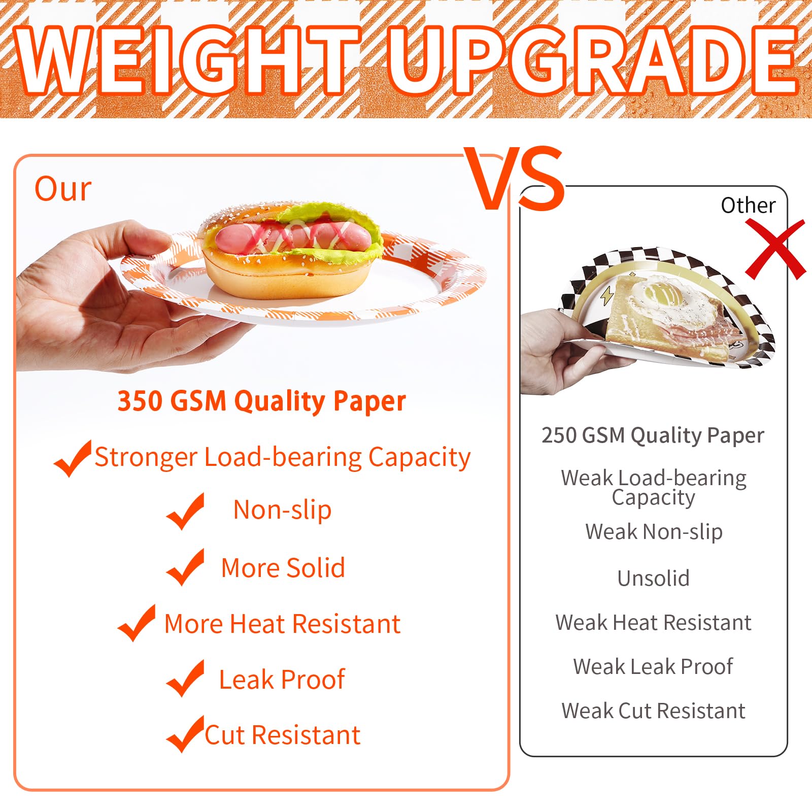 Upgraded Material:Our fall plates and napkins are made of high quality thick paper, not easy to bend or tear. Orange paper plates are upgraded to 350g, more sturdy and durable; napkins are 3 ply, softer and thicker. Reliable orange party plates ensure you enjoy your party smoothly and hassle-free! Tip: Do not microwave the plates