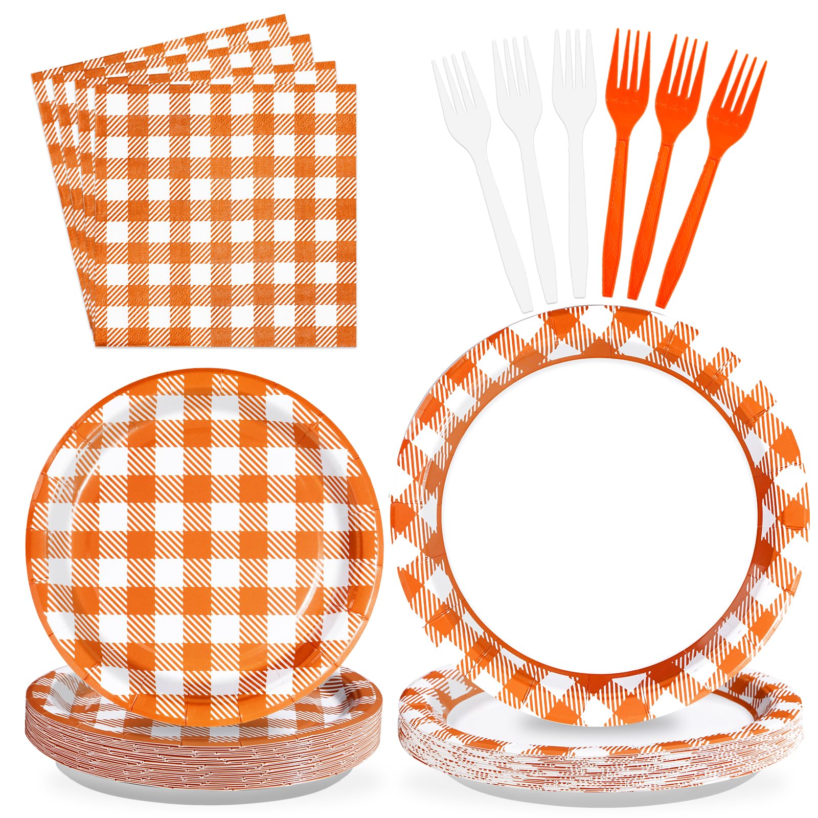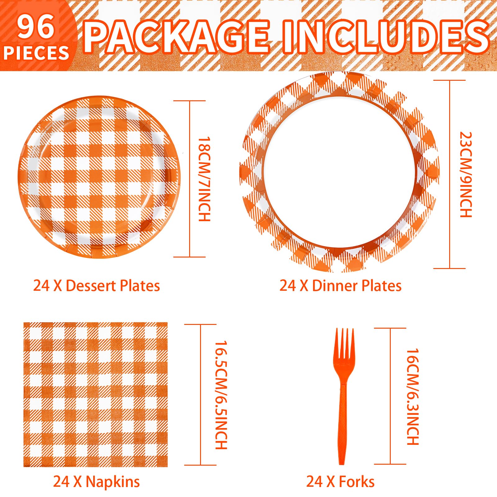 Ample quantity:You will get 96 pcs orange gingham flatware set, including 24 9" orange paper plates, 24 7" orange paper plates, 24 orange gingham napkins and 24 orange white two-color forks, which can easily accommodate up to 24 guests, enough to satisfy your BBQ gathering or picnic