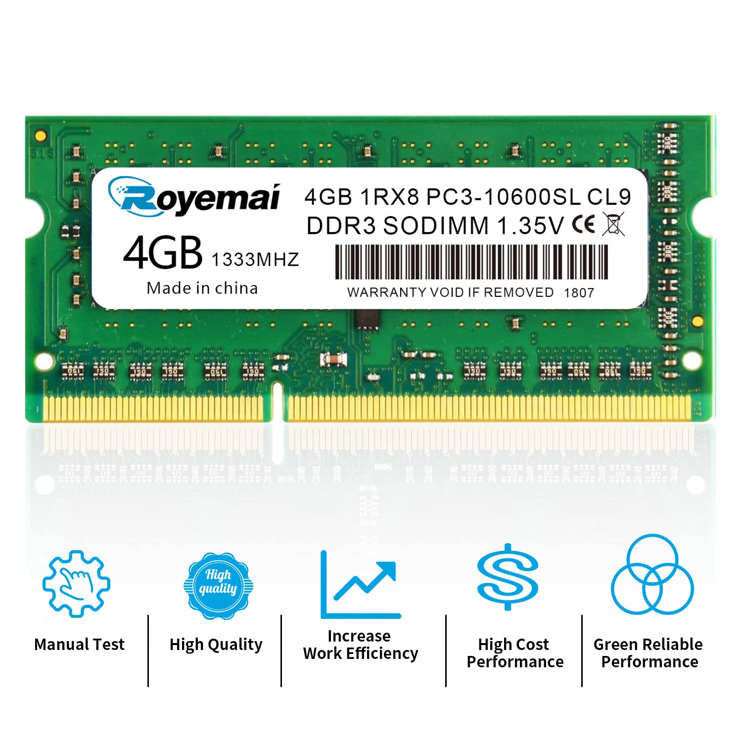 Please Kindly Note: In case the RAM cannot fit your computer, please ensure the parameters before you purchase, such as the RAM model, RAM slot and maximum memory of your computer. High Stability High-quality originals, strict process. All chips from large brands, through strict testing and screening testing. Advanced electroplating process is applied on the connecting finger will improve corrosion resistance and electrical conductivity. After Long-time burn in test and temperature tolerance test aiming at major system platform, it approves that ROYEMAI memory owns high stability and performance. Faster and Smoother ROYEMAI RAM is designed to help your system run faster and smoother, one of the easiest ways to improve your system's performance. Load programs faster, increase responsiveness, run data-intensive applications easily and increase your laptop's multitasking capabilities. After install larger memory, computer will respond noticeably faster, particularly with lots of windows open. High Compatibility To make sure it’ll be compatible with Intel, AMD System well, ROYEMAI RAM has been through compatibility testing with all popular brands of motherboards. Test results show that memory is able to offer superior performance and high stability required during long time operation for any brand computer. Common Fault Diagnosis 1. Turn on computer, no display ☛ Please try to wipe the connection figure with eraser, don’t use Corrosives, such as ethyl alcohol. 2. Windows often boot into safe mode automatically ☛ Please try to slow the speed of data read in CMOS setting. 3. Computer crash randomly ☛ Please try to slow the speed of data read in CMOS setting. If don’t work, use same frequency RAMS.