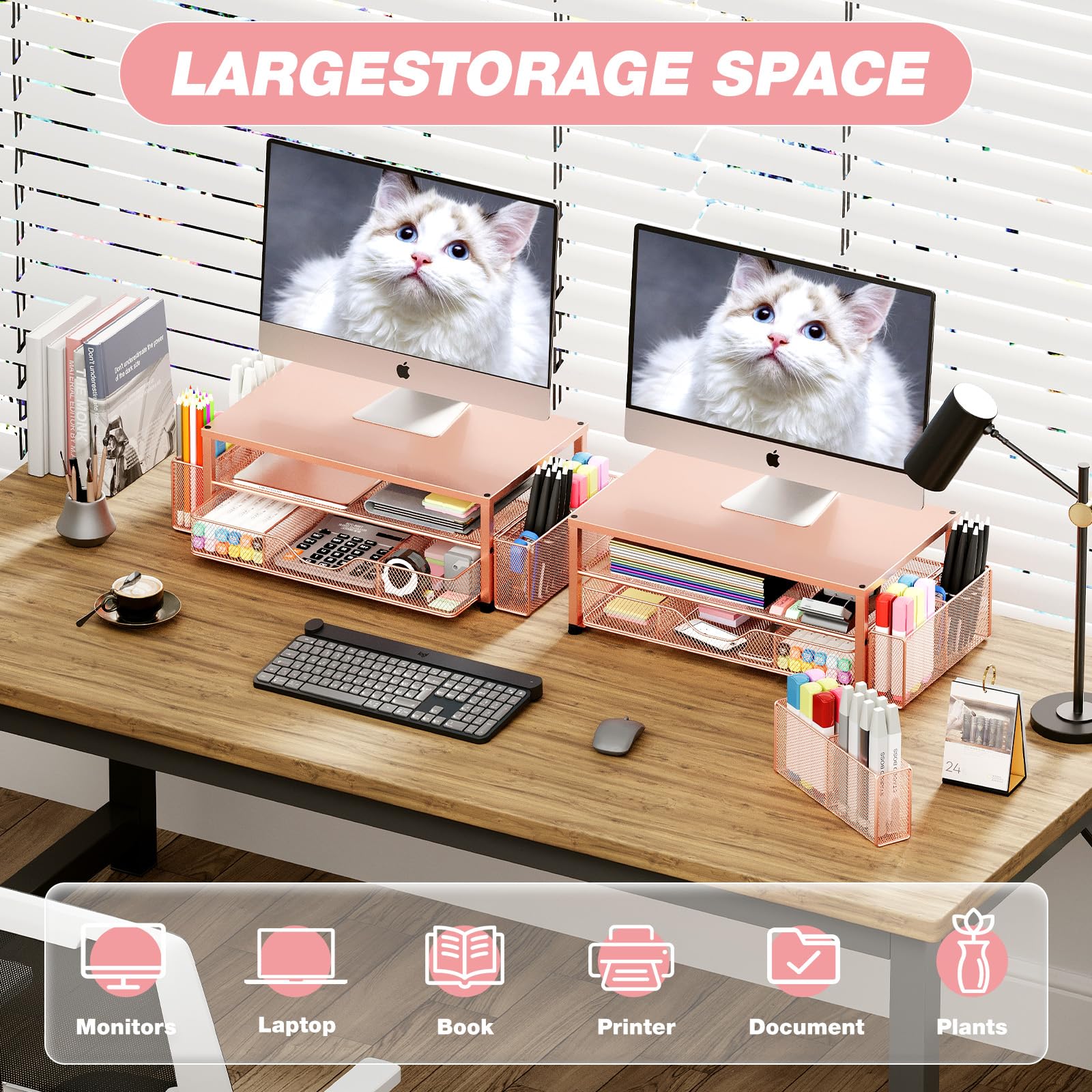 Save Space:This 2-Tier monitor stand with drawer and 2 hanging pen holders provides ample storage space to keep your office supplies and office desk accessories neatly organized and easily accessible, keeping your workspace tidy and improving your sense of well-being