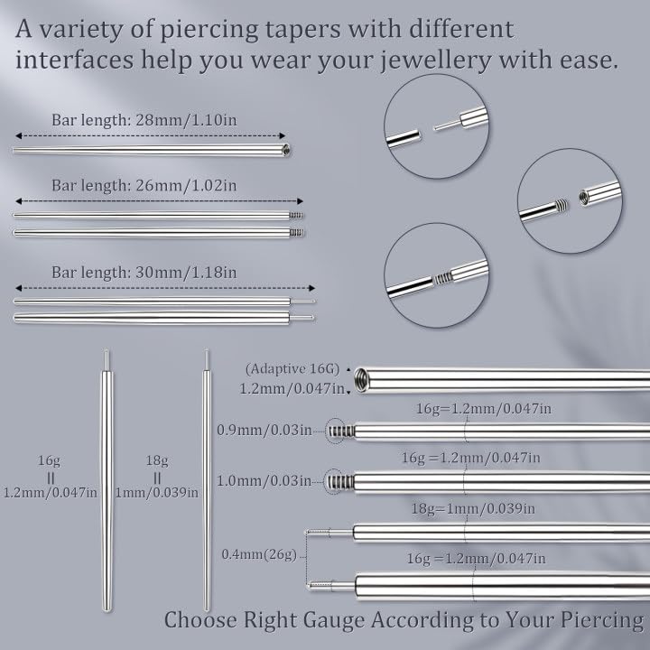 Piercing Threader Tool Gauge Size—16G(1.2mm) / 18G(1.0mm). Please check and choose the size you want.The edges of the stretching piercing kit are smoothly polished, do not hurting skin. A variety of piercing tools are suitable for different puncture wearing.