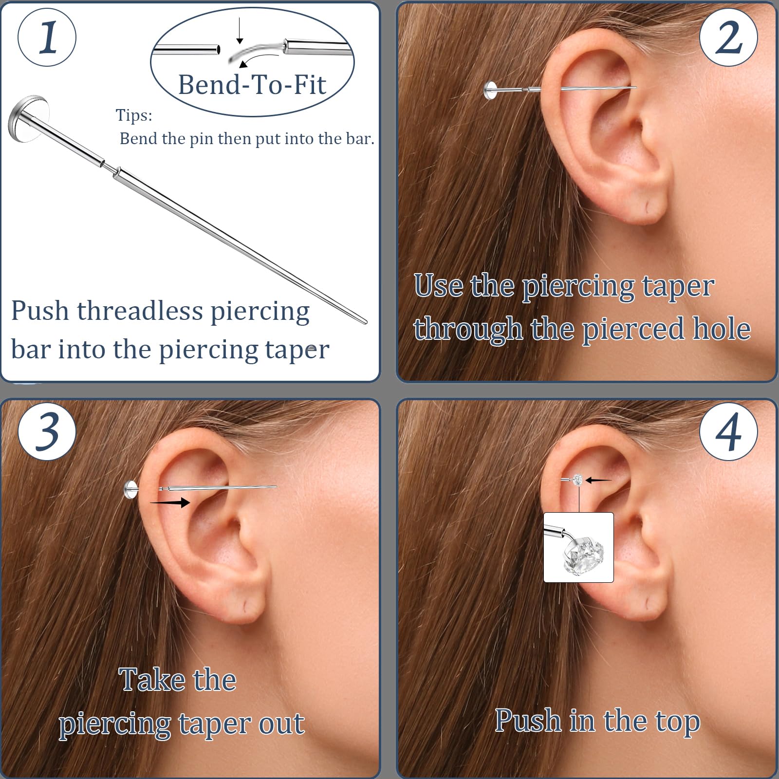 Using Instructions—1.Put a half part of piercing taper into piercing hole. 2.Push piercing threader tool bar into the pin of the taper, then push through totally piercing hole slowly and softly. 3.Take the taper out of the hole and let the jewelry bar stay. 4.Put on the piercing top or bottom.