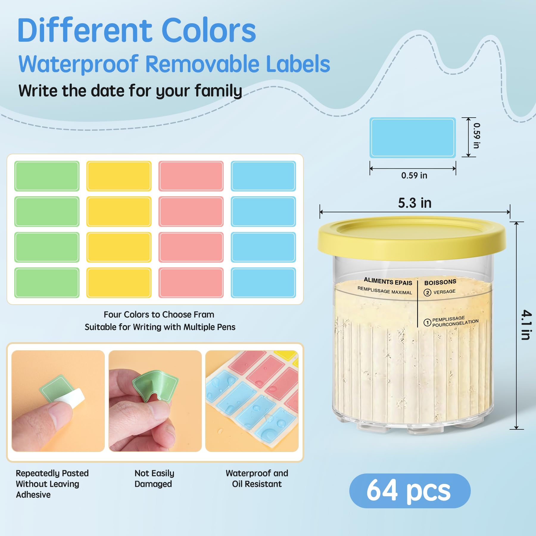 COMPLETE MATCHING SET: This set comes with 4 pints, 4 lids, 4 spoons, and 1 metal scoop, 64pcs assorted colors waterproof removable labels can be writen flavor names/dates with pen and remove residue-free - ideal for allergy warnings or recipe experiments. Labels withstand freezer condensation without smudging.