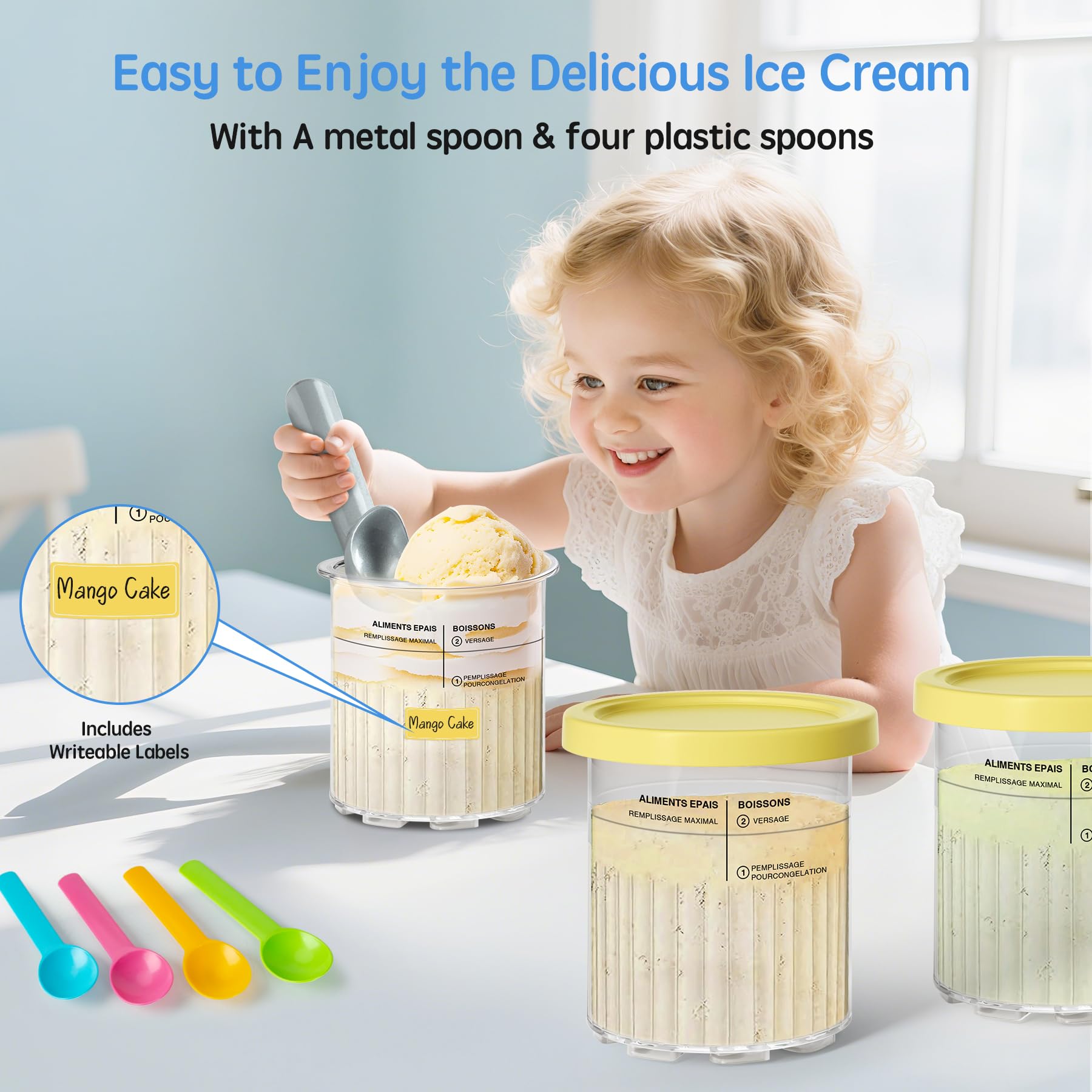 PERFECT FIT MODEL: Compatible with Ninja NC500/NC501 Creami Deluxe 11-in-1 XL Ice Cream Makers. 24 OZ transparent pints with 4 yellow lids - perfect for creating multiple ice cream varieties simultaneously, while making different flavors of ice cream for family & friends.