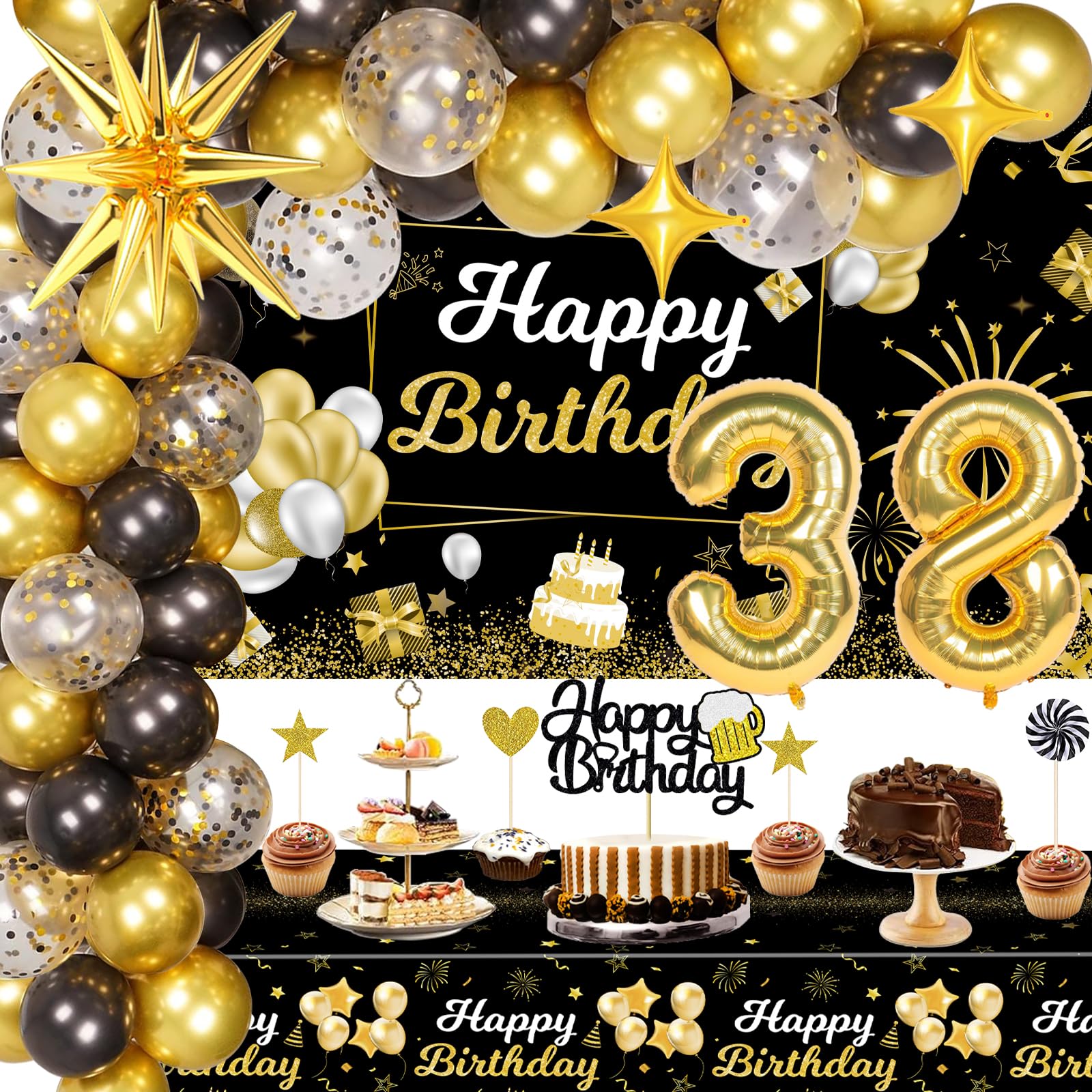 Gold 38th Birthday Decorations: Our 38th birthday decorations with backdrop banner, tablecloth, balloons arch are definitely a perfect 38th birthday gift for him. Black and Gold theme decorations are suitable for men’s birthdays party.