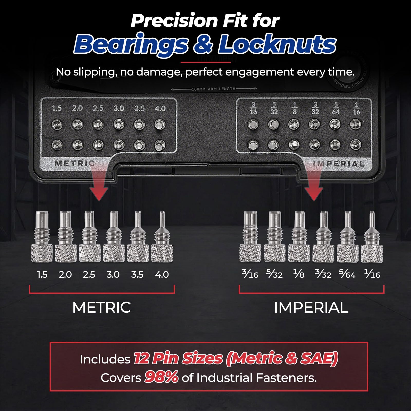 【Precision Fit for Bearings and Locknuts】Includes multiple metric and SAE pin sizes,6 metric:1.5/2.0/2.5/3.0/3.5/4.0mm + 6 SAE: 1/16", 3/32", 5/64", 1/8", 5/32", 3/16" cover 98% of industrial fasteners. offering precise engagement for pulleys, lock rings, and hidden fasteners without slipping or damaging the surface.