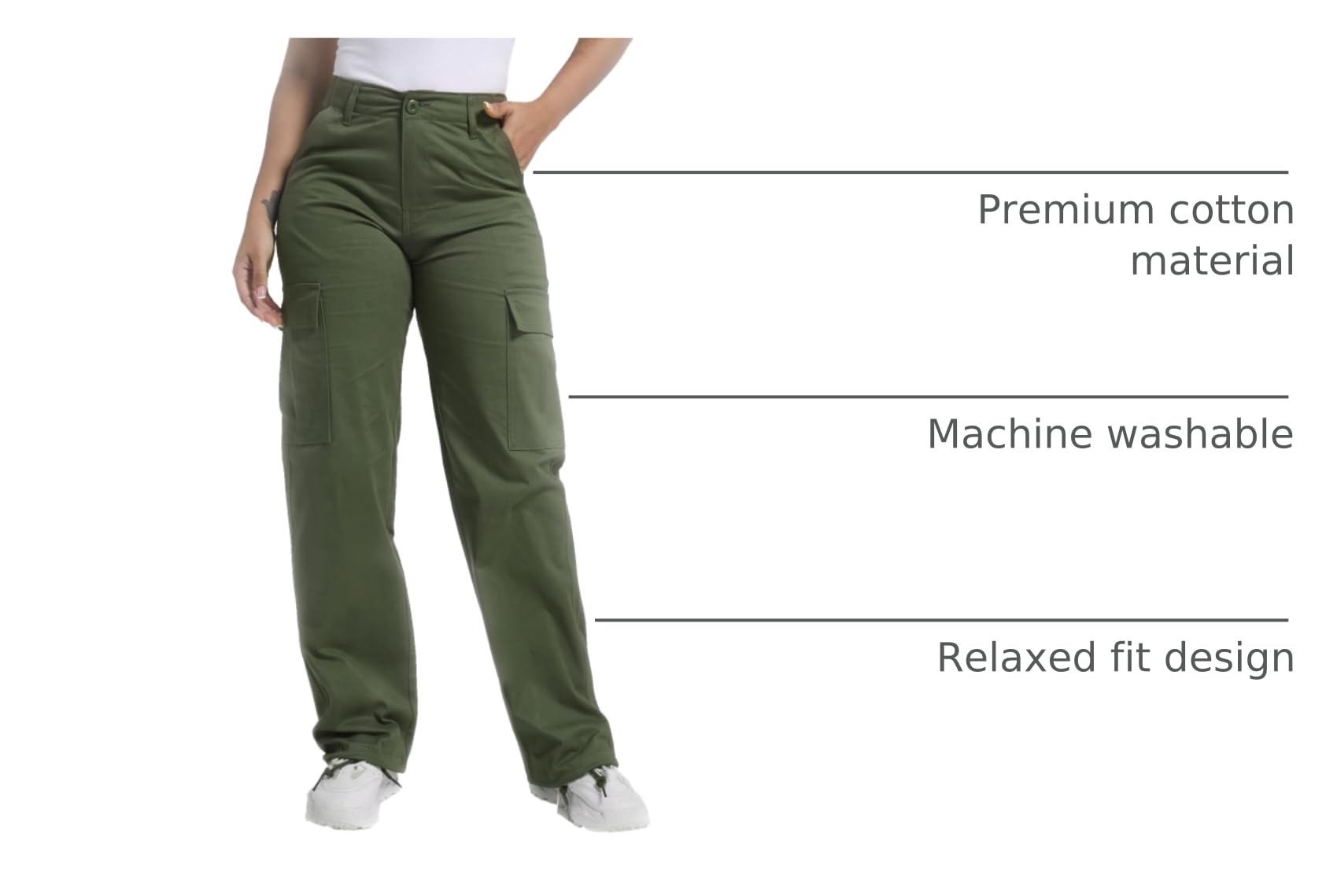 Description Women's Cargo Pants, the ultimate fusion of style, comfort, and functionality tailored for your everyday adventures. Crafted from premium quality cotton, these pants offer a relaxed fit, ensuring unparalleled comfort whether you're out on the trails or running errands in the city. Features: Relaxed Fit: Designed for maximum comfort, our cargo pants feature a relaxed fit silhouette that allows for easy movement and flexibility, making them ideal for any activity. Premium Cotton Construction: Made from high-quality cotton fabric, these pants are breathable, soft to the touch, and gentle on your skin, keeping you comfortable all day long. Versatile Style: Whether you're hiking in the great outdoors or enjoying a casual day out, these cargo pants boast a versatile design that effortlessly transitions from outdoor adventures to everyday wear. Ample Storage: Equipped with six functional pockets, including spacious cargo pockets, these pants provide ample storage space for your essentials such as keys, phone, wallet, and more, keeping your belongings secure and within reach. Durable Construction: Built to withstand the demands of your active lifestyle, these pants are crafted with durable stitching and reinforced seams, ensuring long-lasting wear and tear resistance. Whether you're hitting the trails or simply running errands around town, our Women's Cargo Pants are the perfect blend of style and functionality.