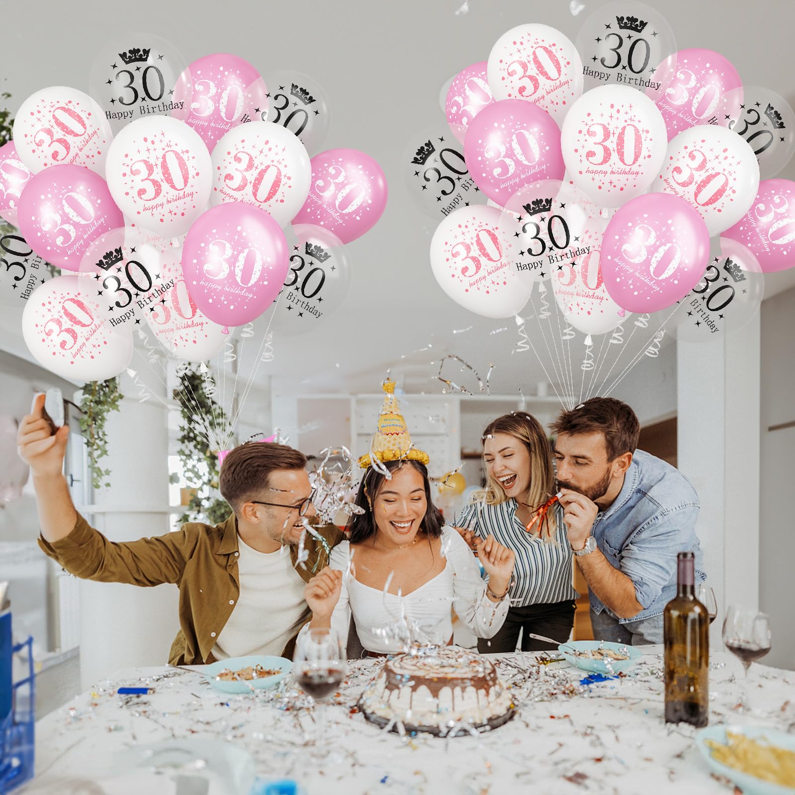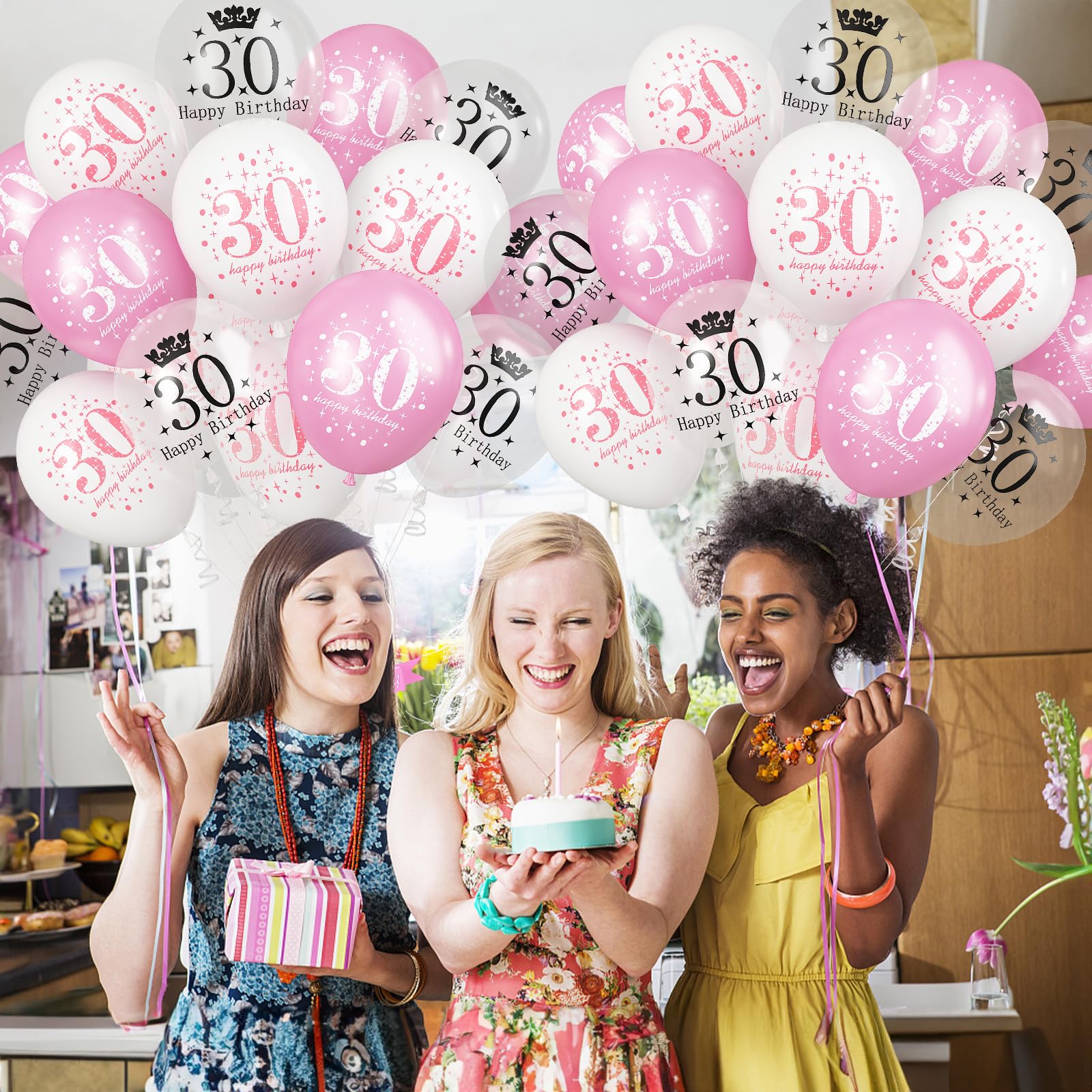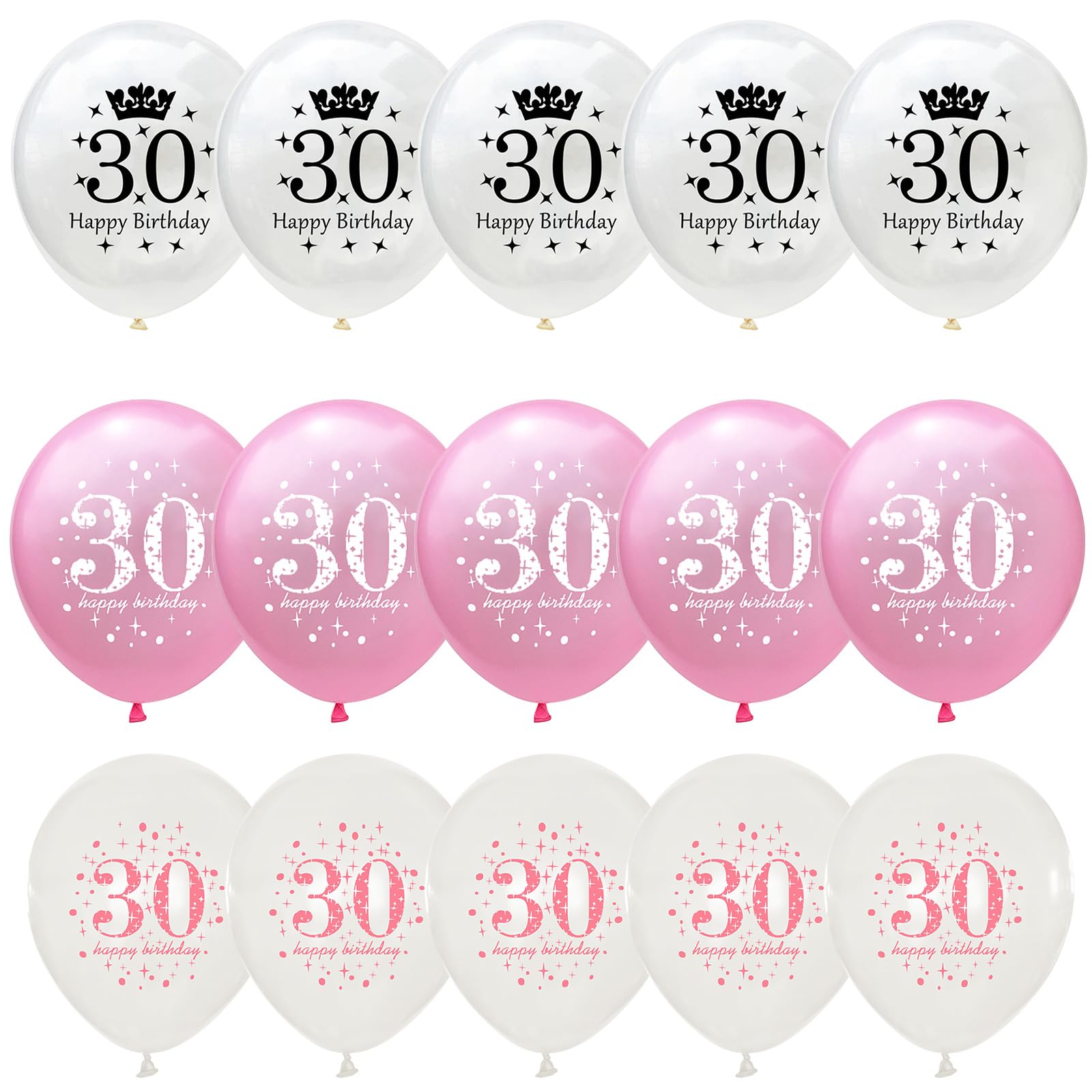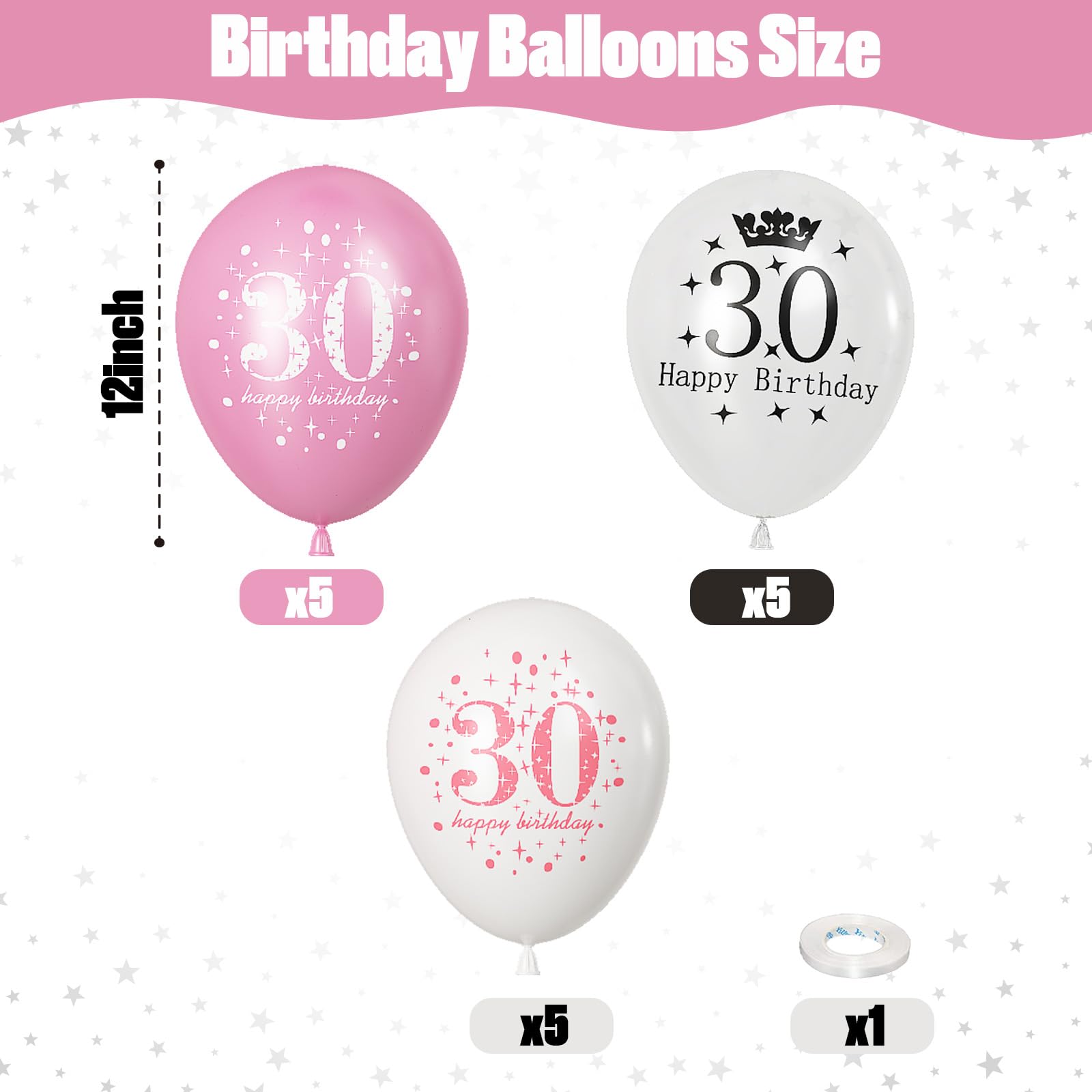 🎂 30th Birthday Balloons - You will get total 15 pieces 12 inch pink white happy 30th birthday latex balloons, inclulde 5 pcs pink print balloons, 5 pcs white print balloons, 5 pcs transparent print balloons, come with a balloon ribbon. Perfect for her women 30th birthday party decorations supplies.