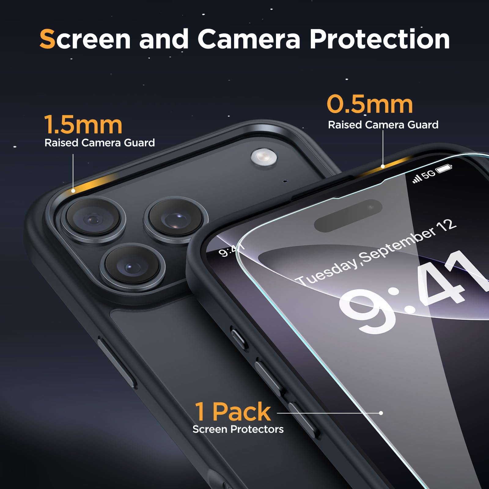 [Rugged Camera and Screen Protection]: This phone case for 17 Pro comes with a high-quality tempered glass screen protectors included in the package. The camera frame is raised by 1.5mm to safeguard the camera lens, preventing dust accumulation and preserving the camera's original performance. Additionally, the screen protectors effectively shield the screen from scratches, ensuring comprehensive protection for your phone.