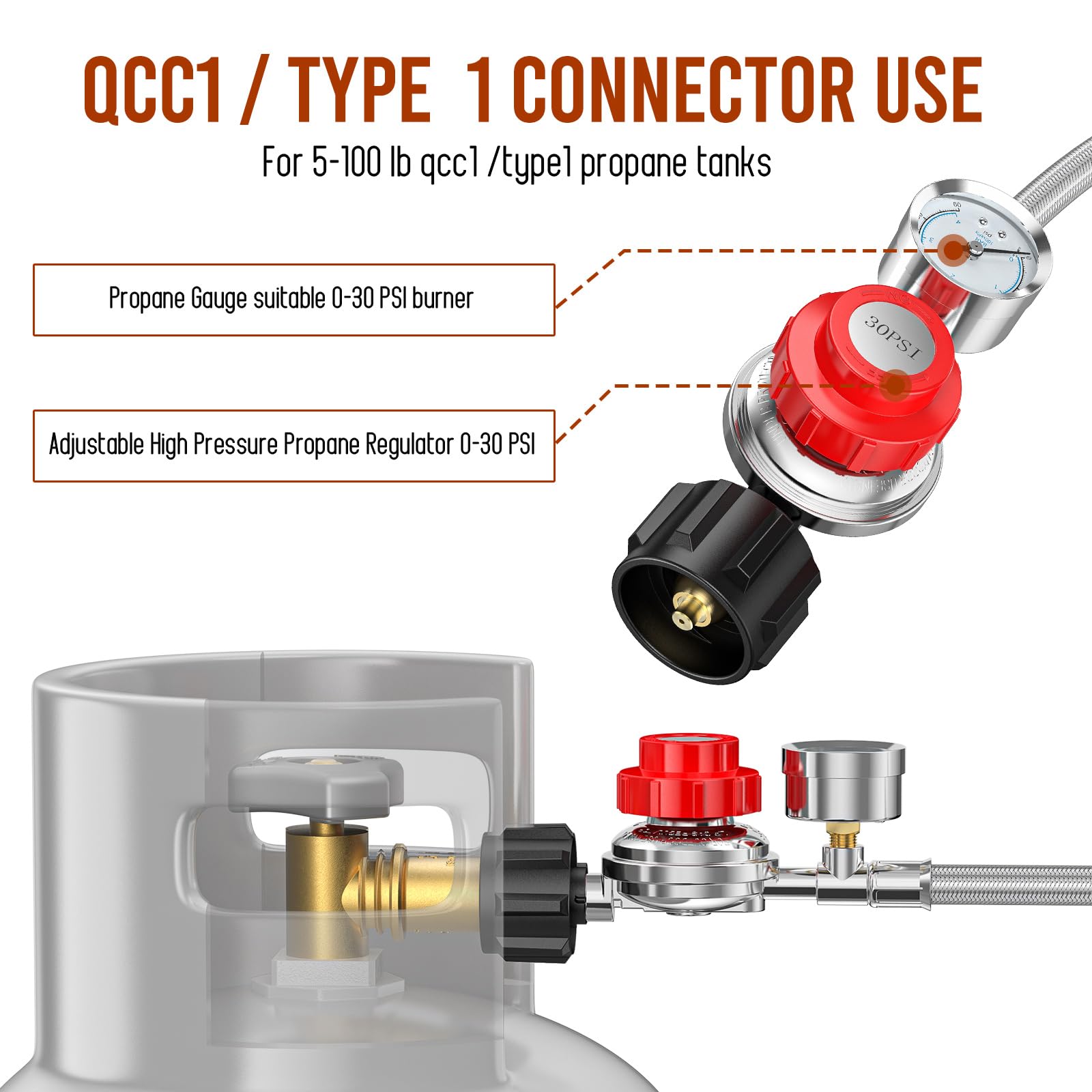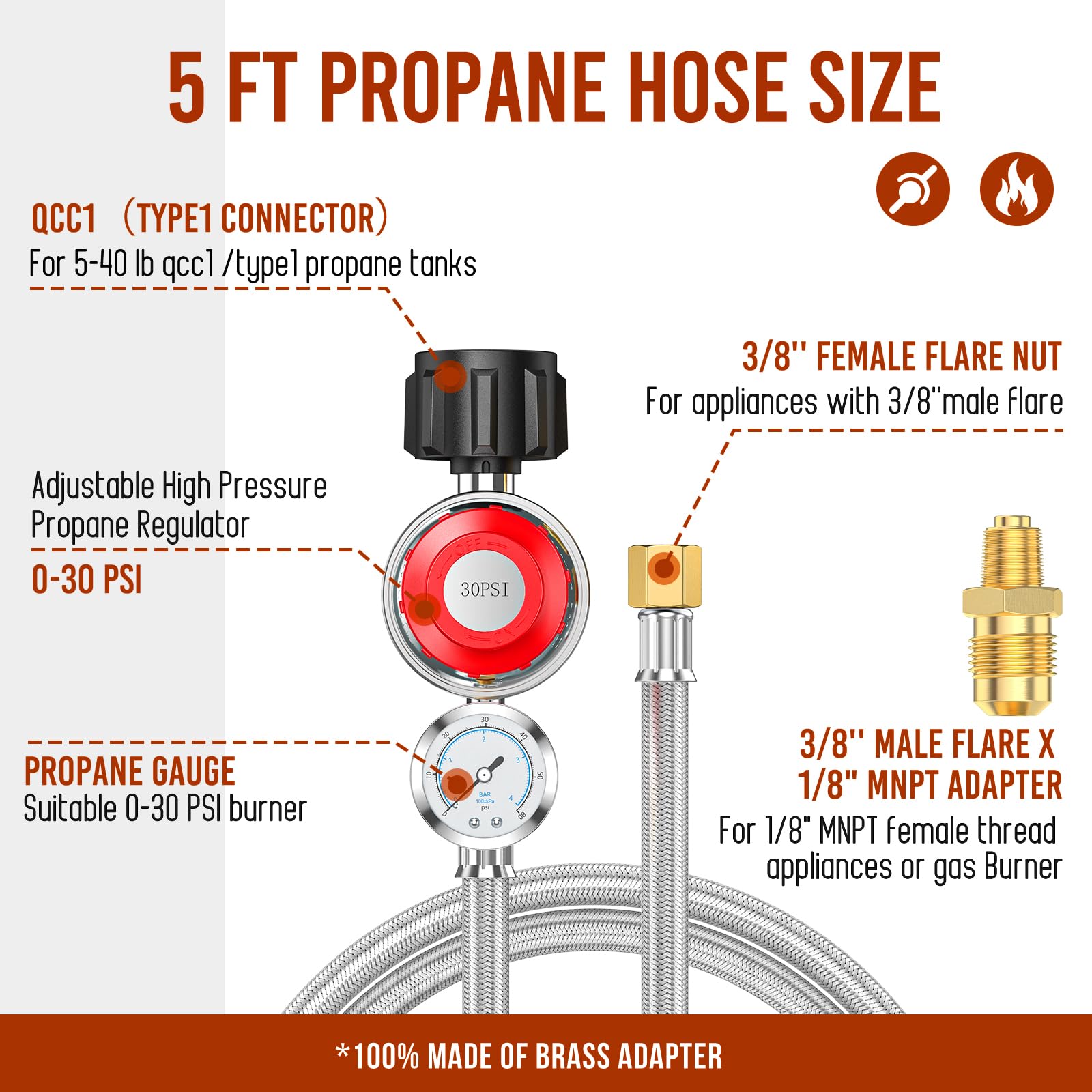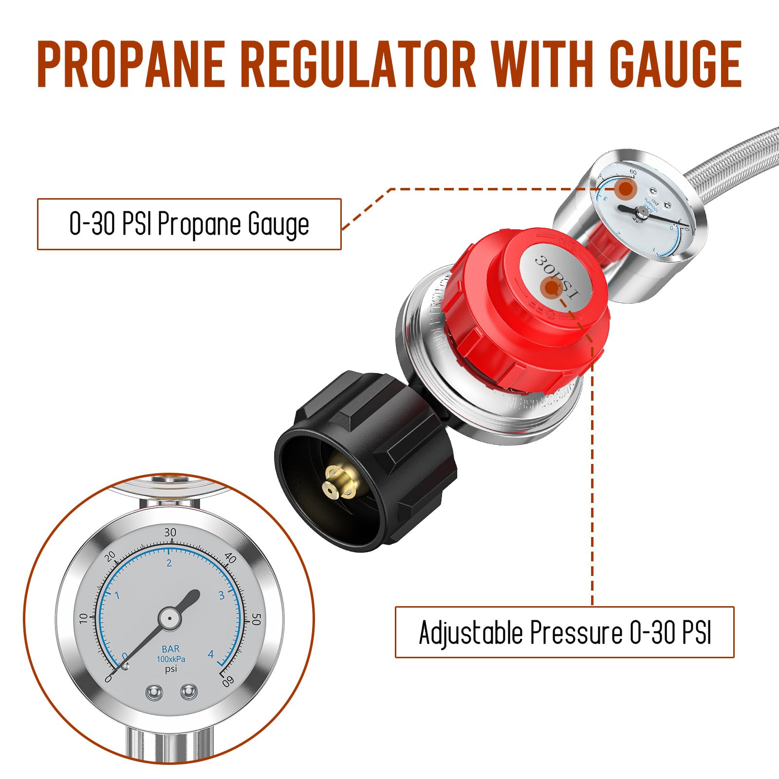Adjustable Pressure of Gas Flow: The propane hose can connect 5-40lb propane tank. This Regulator Hose 0-30 PSI adjustable output is must have item for your propane burners Gas Pressure Gauge allow you precisely control the heat output level and keep your outdoor cooker or any grill in optimal operating condition.