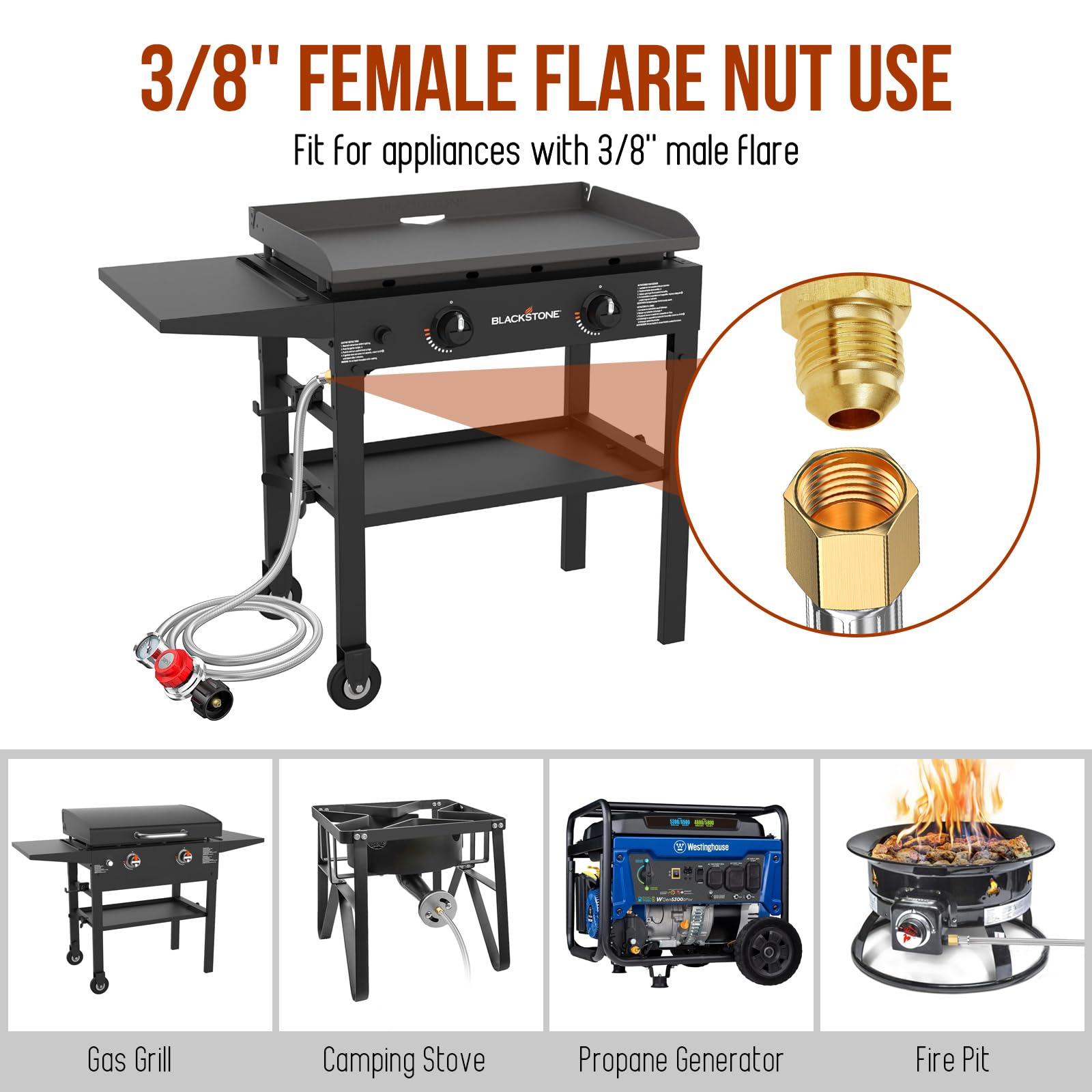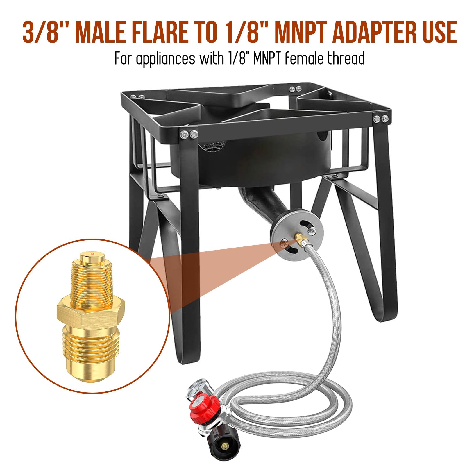 Compatibility: The QCC1 to 3/8 inch female flare propane hose, with 3/8'' male flare to 1/8" MNPT adapter, it is compatible with your grills, turkey fryers, fish fryers, burners, outdoor cookers & stoves, smokers, heaters, fire pits, propane forges and more appliances with 3/8" or 1/8" male flare.