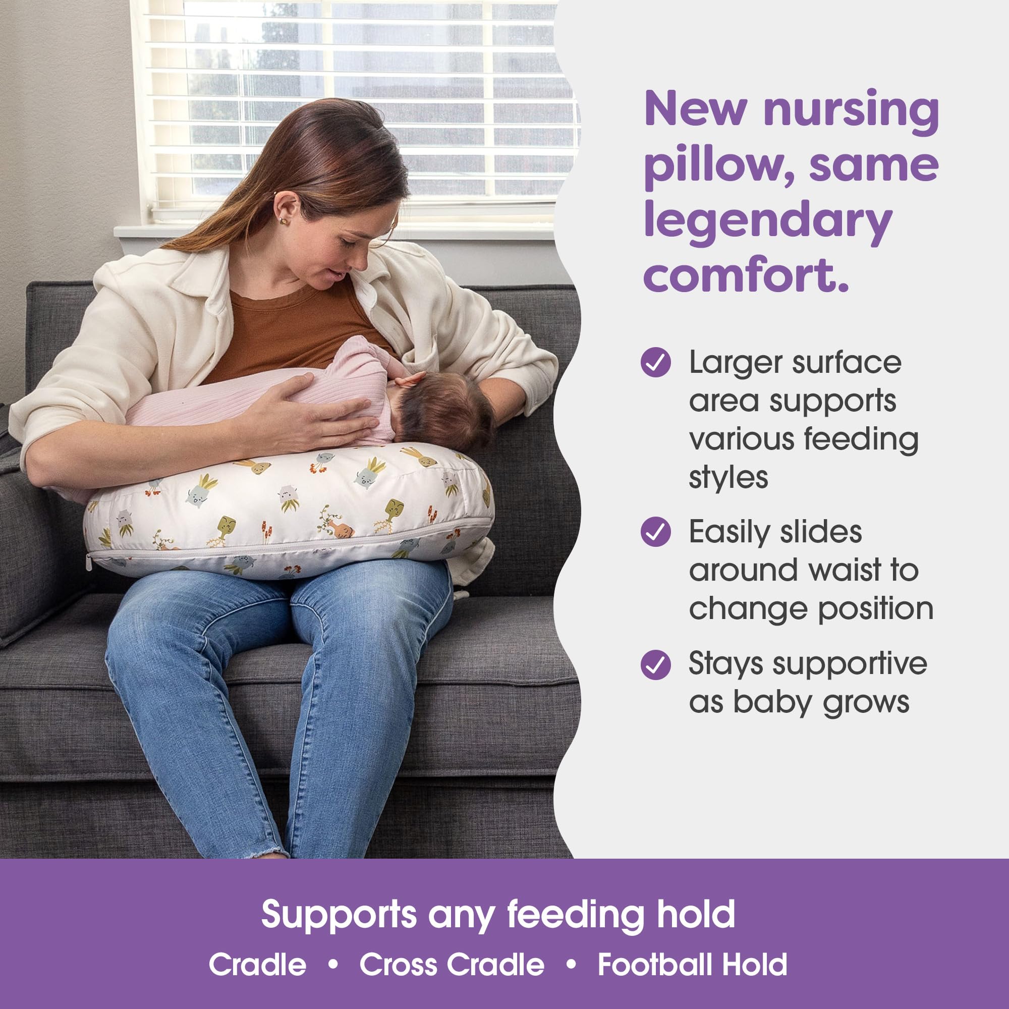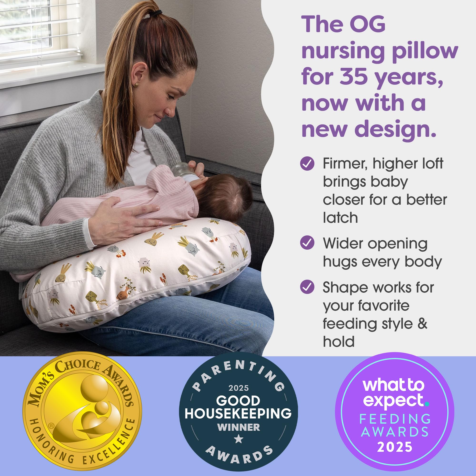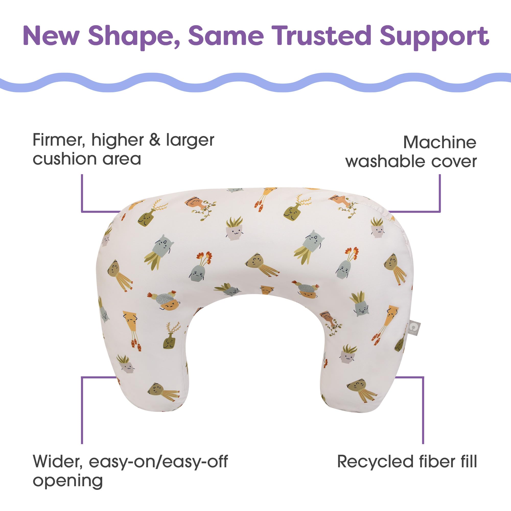 Introducing the Updated Boppy Nursing Pillow, your comfy, snuggly sidekick for feeding moments. This redesigned cutie, dreamed up by clever moms, gives your arms and back a break while keeping baby at the perfect angle for breastfeeding and bottle feeding. Did you know the average nursing mom clocks over 35 hours a week feeding? Talk about a full-time job. But fear not, our Redesigned Boppy Nursing Pillow is here to save the day (and night), just as our Original Boppy Nursing Pillow has done for 35 years. With its updated, versatile design, you can cradle, cross cradle, or football hold with ease. This pillow’s got your back (literally) with its larger, firmer shape that hugs every body type just right, keeping baby snug and positioned just right. It’s small enough to fit in your rocking chair or glider but big enough to deliver all the support you need. No wonder it’s been a registry must-have and a favorite among moms, dads, caregivers and lactation consultants alike for over three decades. The easy-on, easy-off, beltless design has a wider opening and means you can pop it on with one hand—because what mom or dad has two free hands? Plus, its removable cover is machine washable for those inevitable messes. Filled with hypoallergenic, recycled fiber, it’s as carefree as it is cozy. Got a laundry day? No worries. We’ve got extra covers so you can always have a fresh one ready. Just remember, this pillow is for supervised awake-time only—no snoozing allowed! Trust Boppy to keep you and your baby comfy, happy, and oh-so-confident. Let’s make feeding time the best time.