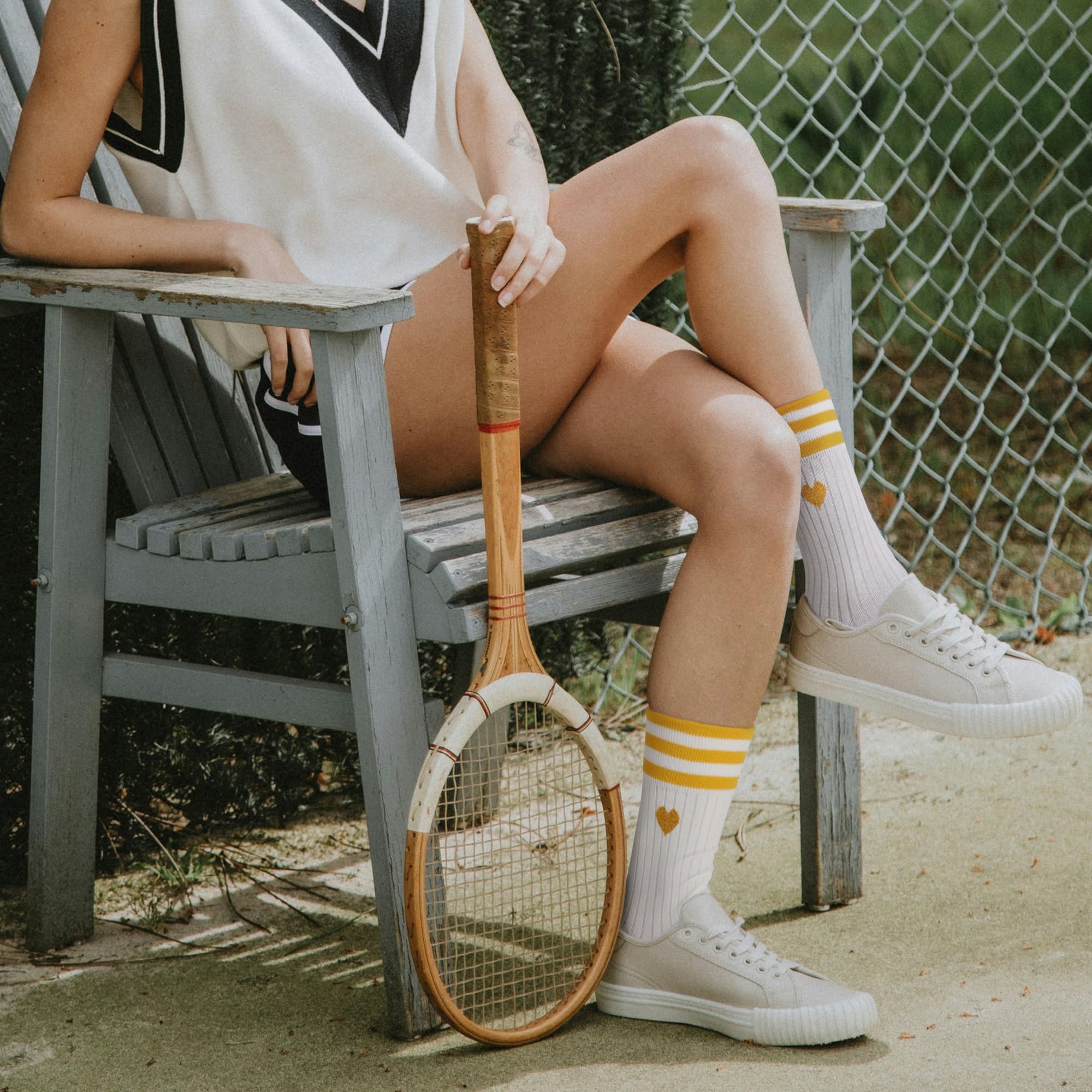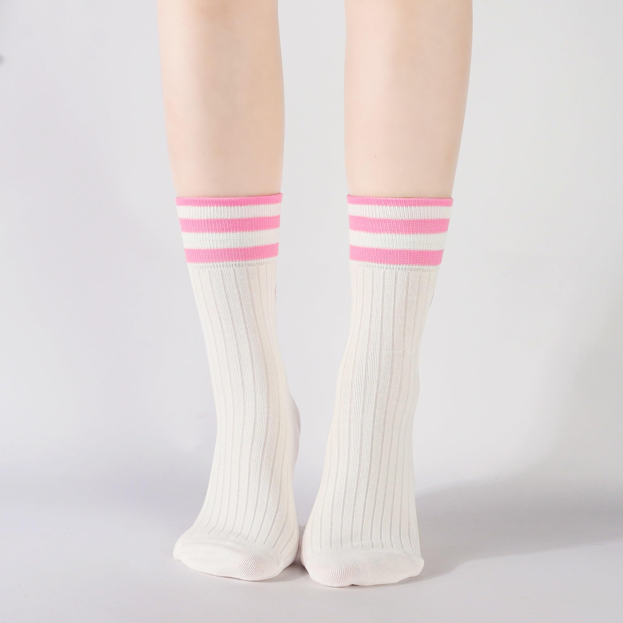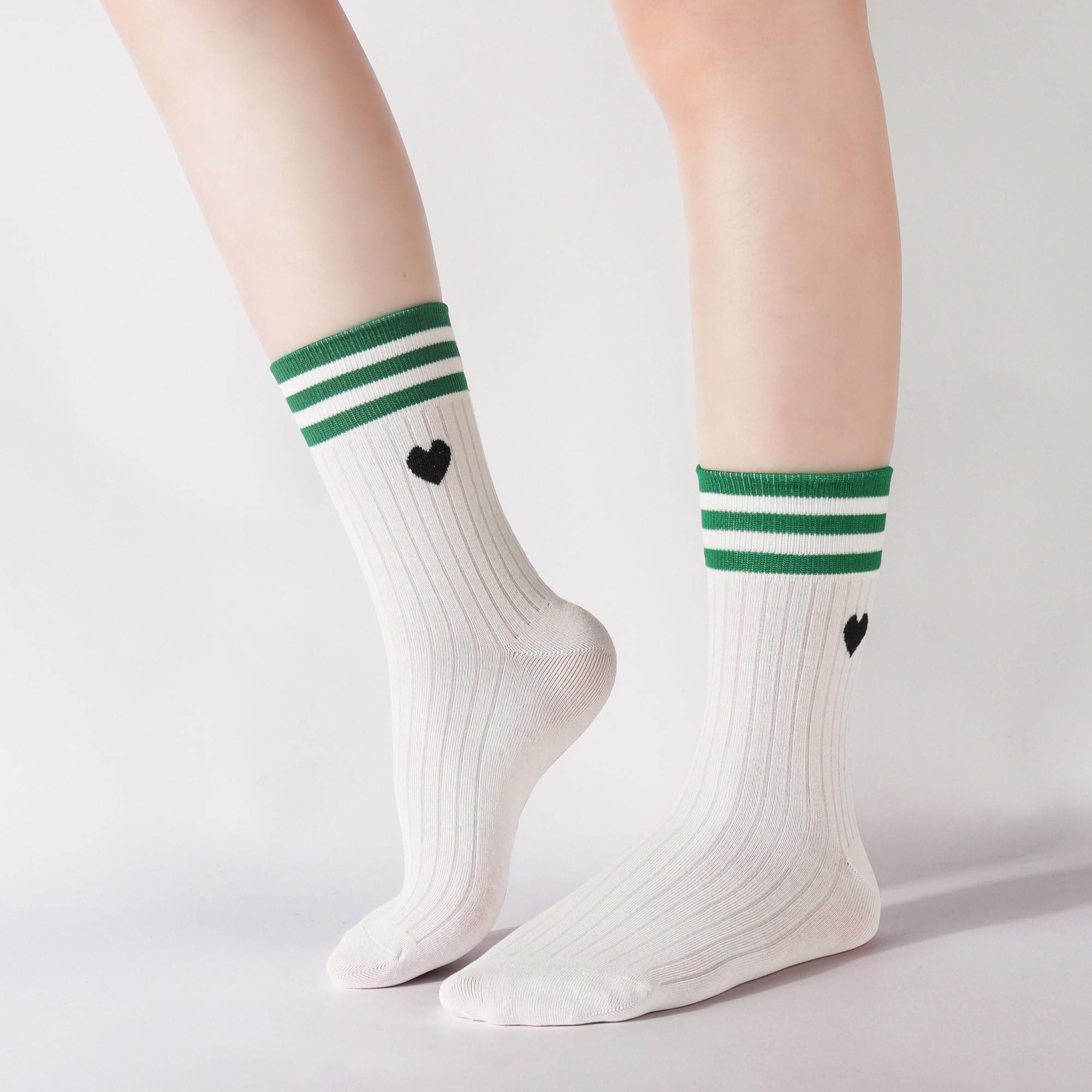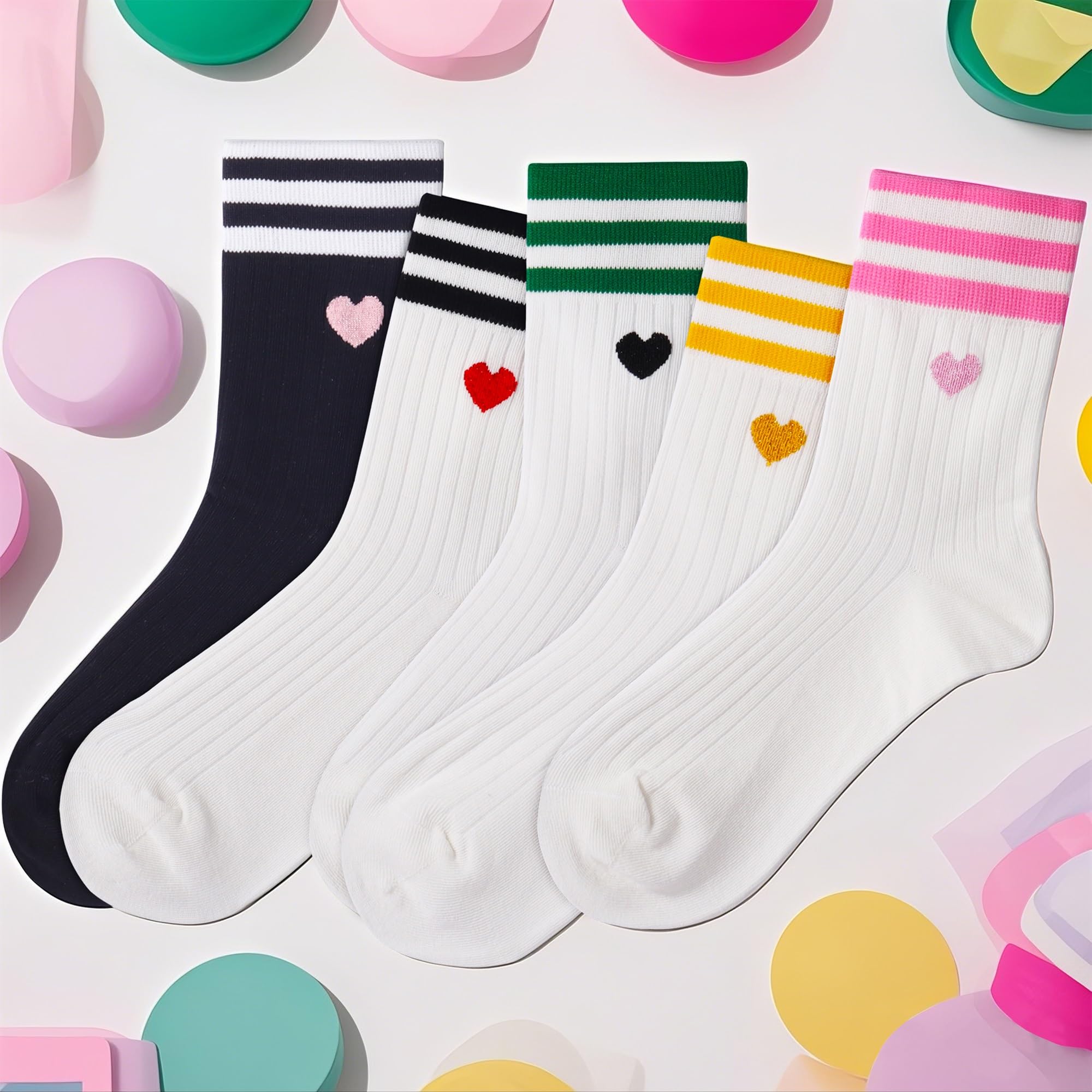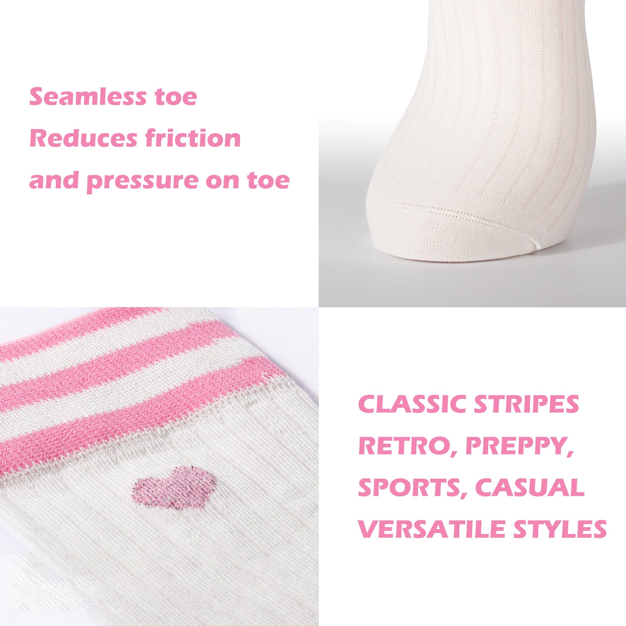 Cute Design: Each pair of white socks features a decorative ribbed cuff in black, white, yellow, pink, and green stripes, adding a vibrant touch. The socks also have a textured vertical rib pattern, giving them a simple yet stylish look. A glittery heart on the side of each sock adds a playful element to the overall design.