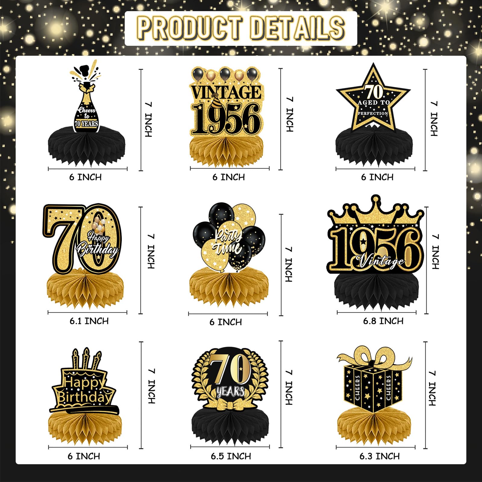 Package: You will receive 9 pieces of black and gold party table decorations, including special year numbers "70", stars, champagne, cakes and other birthday exclusive symbols.