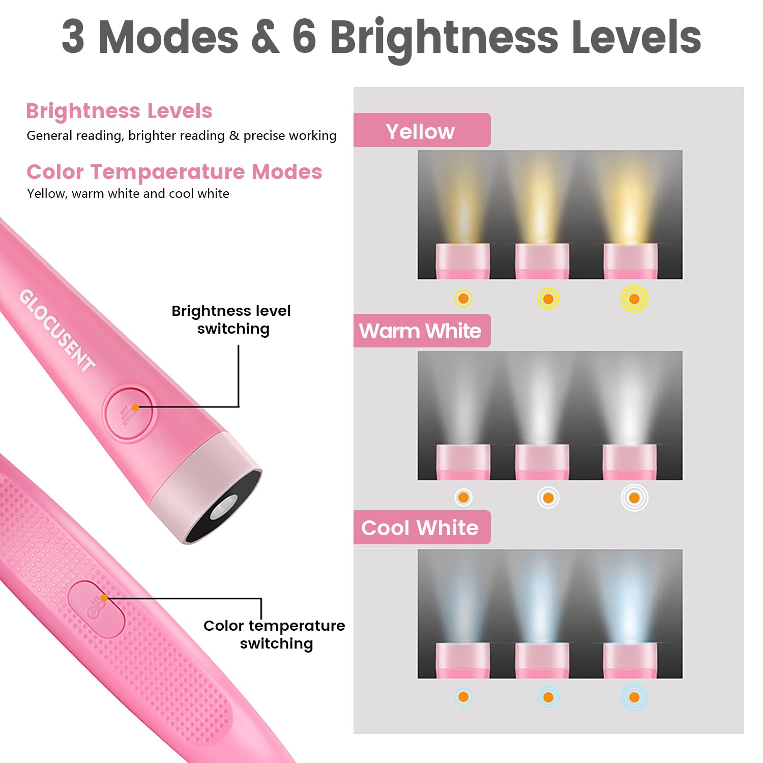 [3 Color & 6 Brightness Adjustable] This Glocusent reading light owns 3 useful color temperature modes: yellow(3000K), warm white(4000K) and cool white(6000K). Each neck light head owns an independent switch for 3 brightness levels dimmable. The perfect neck light for crocheting and reading light for bed, knitting, camping, or repairing etc.