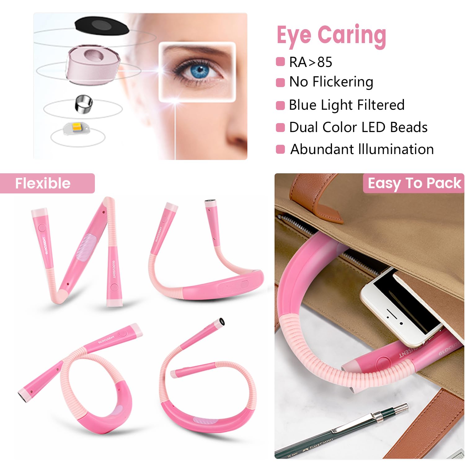 [Eye Caring & Ergonomic Design] Blue light filter and no flickering design by the advanced LED beads of the Glocusent reading light. Compared with other reading lights for books in bed, you feel no more eye strain with the Glocusent book light. The arms of the reading light around your neck are supple and adjustable so you can get the angle most comfortable for you. This around the neck reading light is ergonomically designed, it is an exceptional handsfree neck lamp for reading!