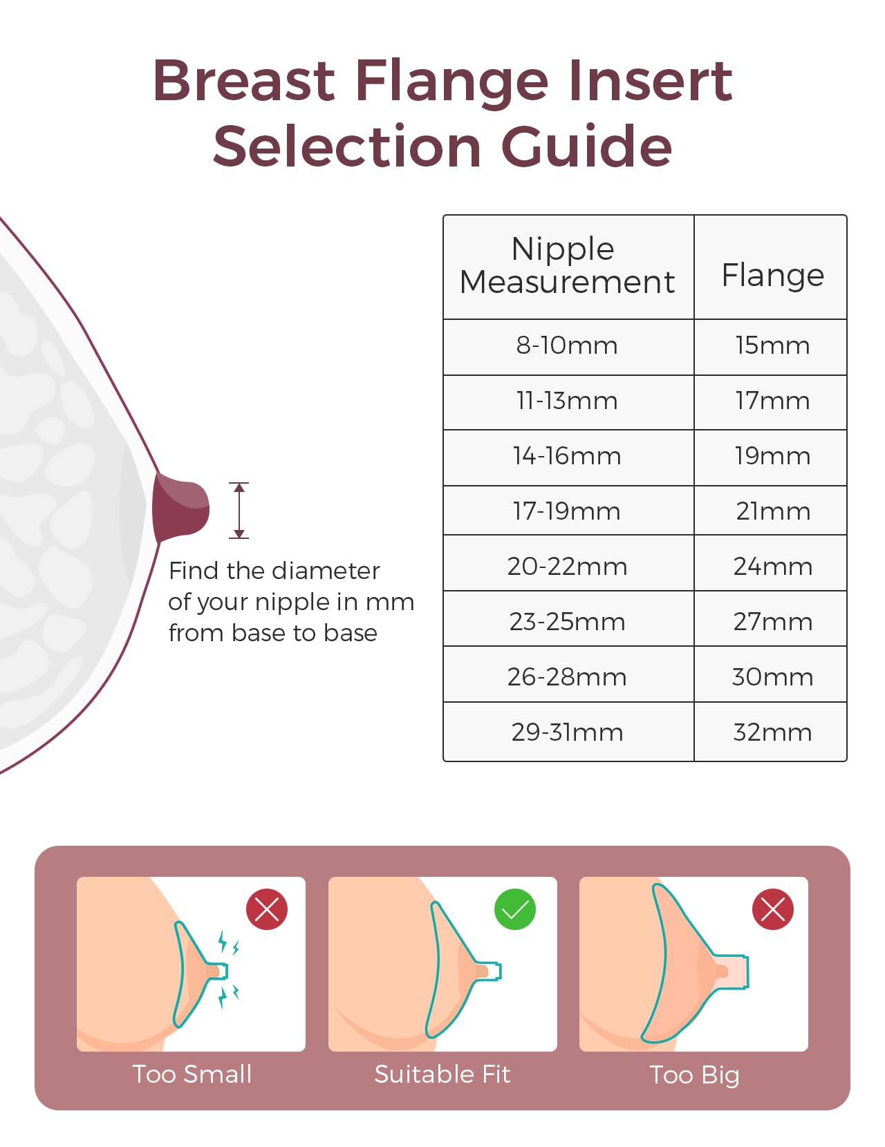 Find Your Perfect Fit: Choosing the correct flange size is essential for comfort and efficiency. If you experience nipple swelling, rubbing, or squeezing during pumping, you may need a different size. Measure regularly and change inserts as needed.