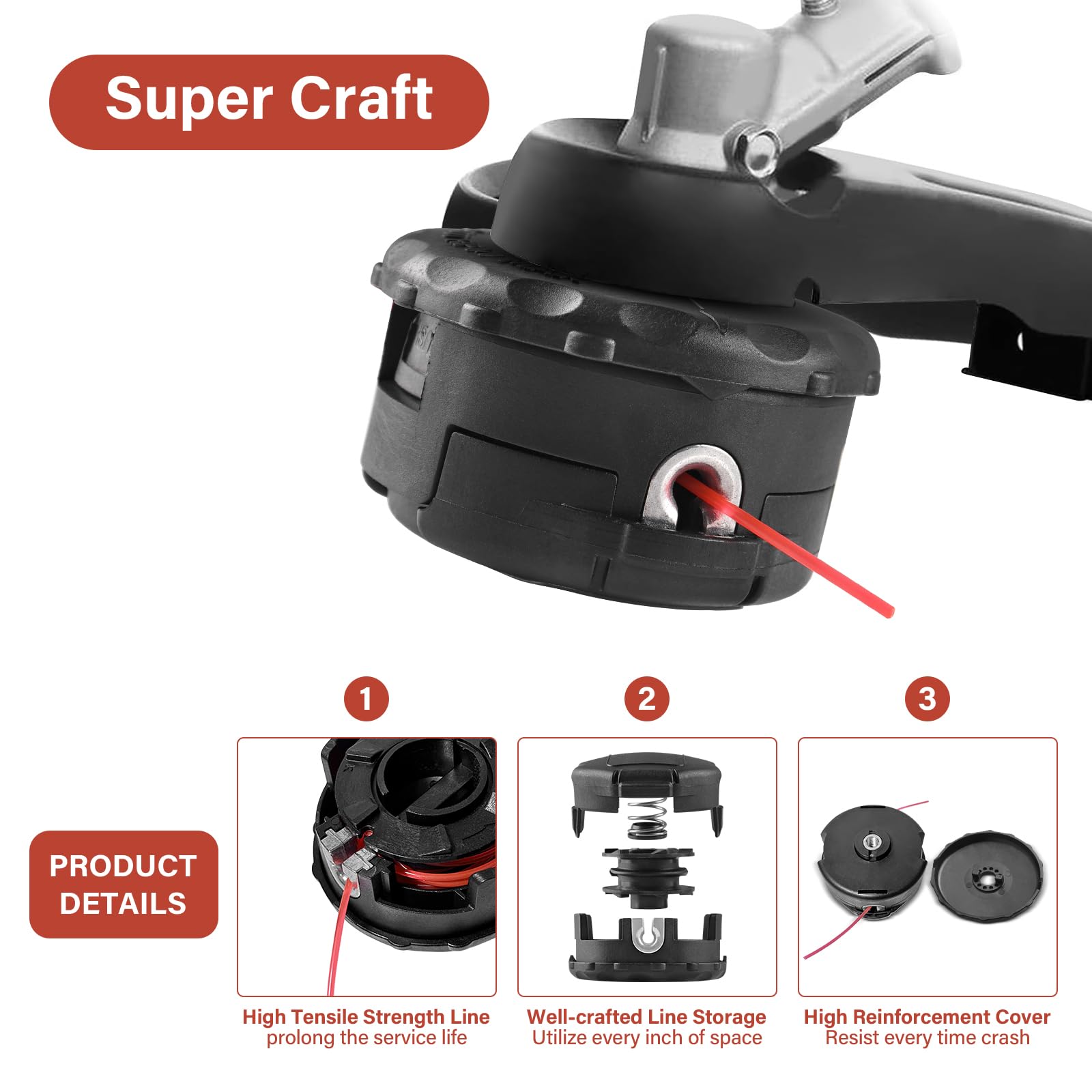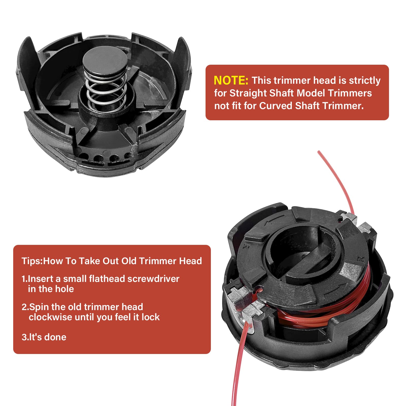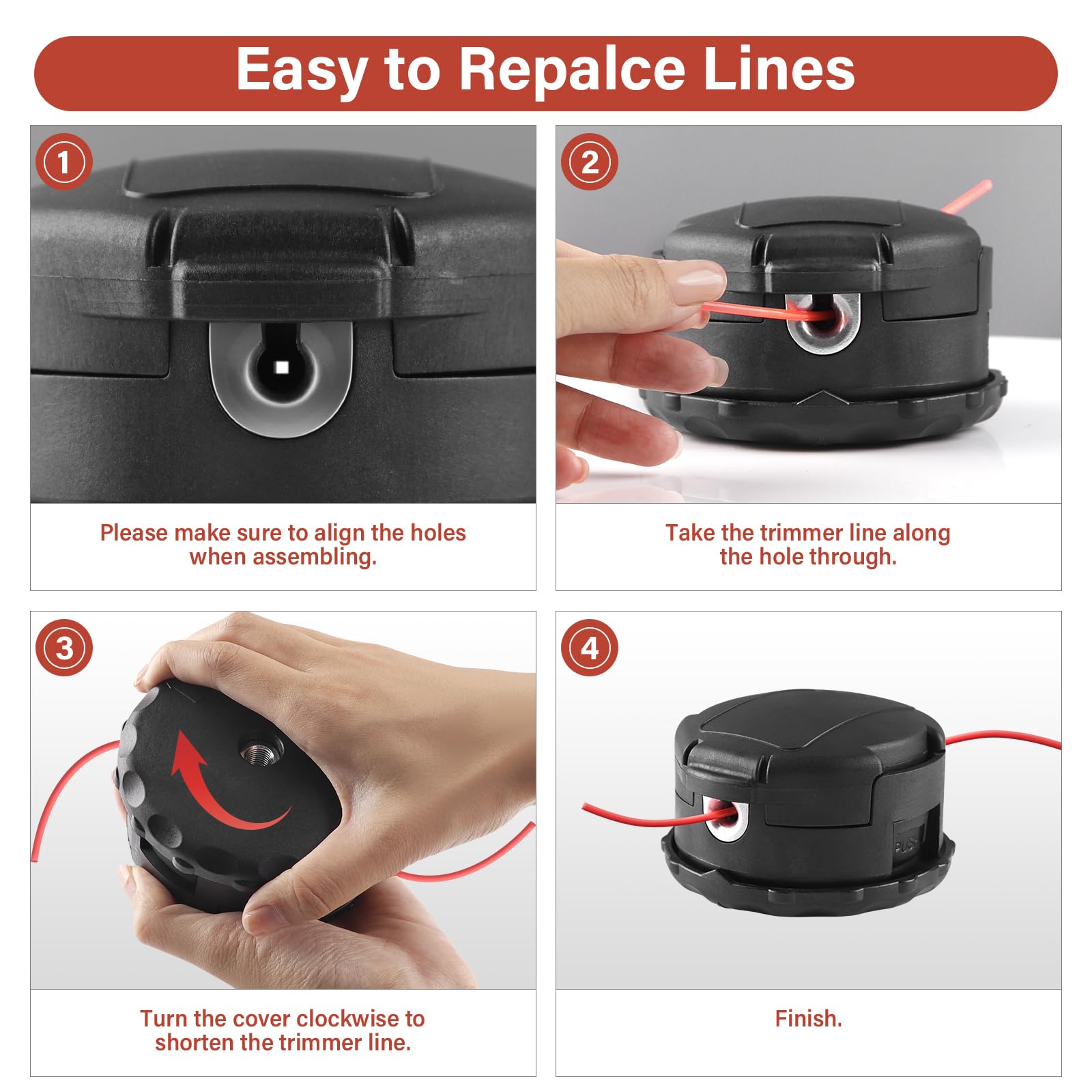 Without Disassembly - Our trimmer head makes it easy to replace the lines without disassembly. First, make sure to align the holes when assembling. Then, take the trimmer line along the hole through. Finally, turn the cover clockwise to shorten the lines.