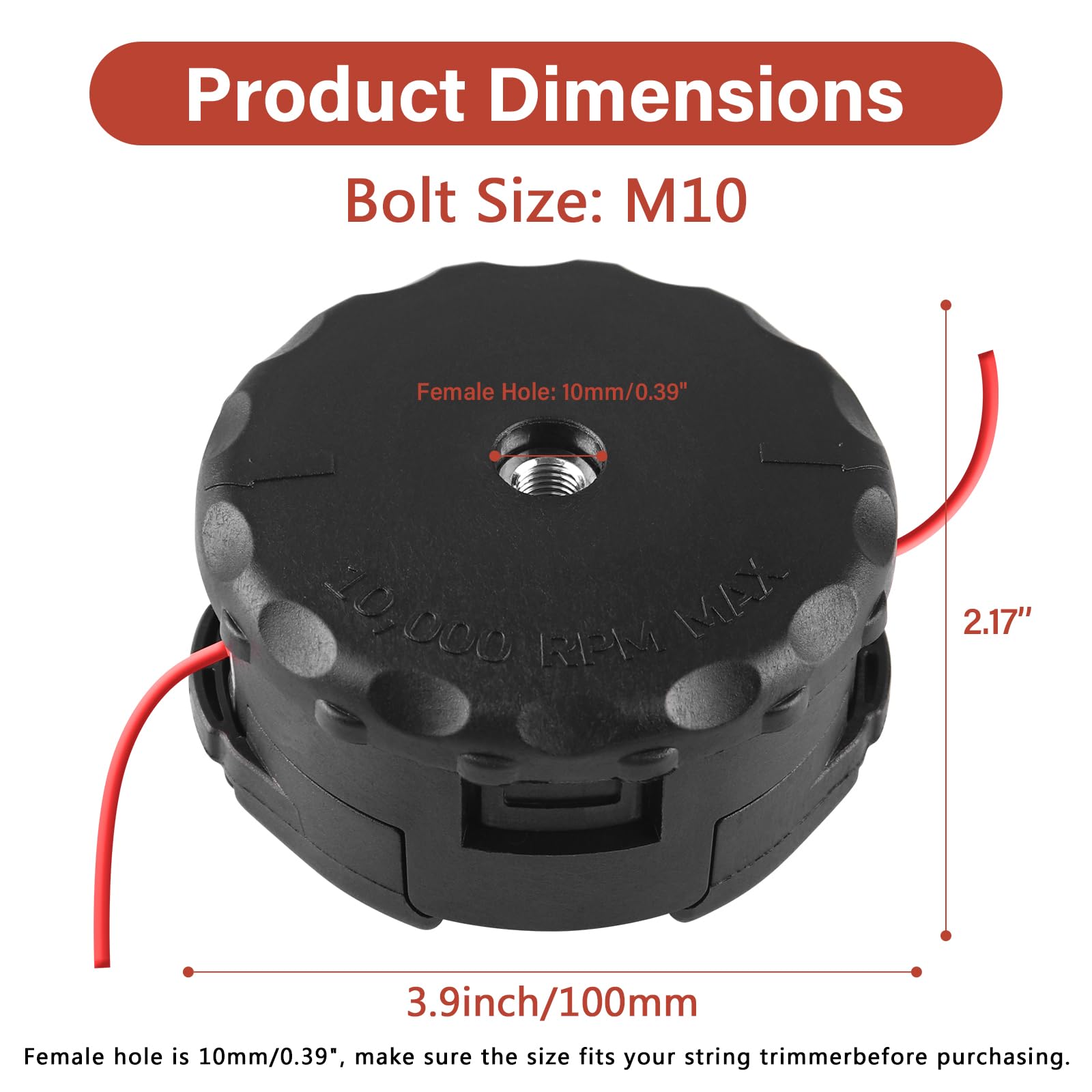 Upgraded Line Storage Capacity - The female hole is 10mm/0.39'', make sure the size fits your string trimmer before purchasing. This weed eater trimmer head has a large-capacity line storage. Line wheel height: 0.59''. Line wheel width: 0.2''. It's suitable for most sizes of trimmer lines, such as 0.080'', 0.095'', 0.105'', and 0.130''. (Trimmer lines included, length: 6.56ft.