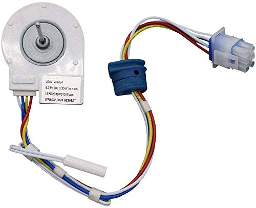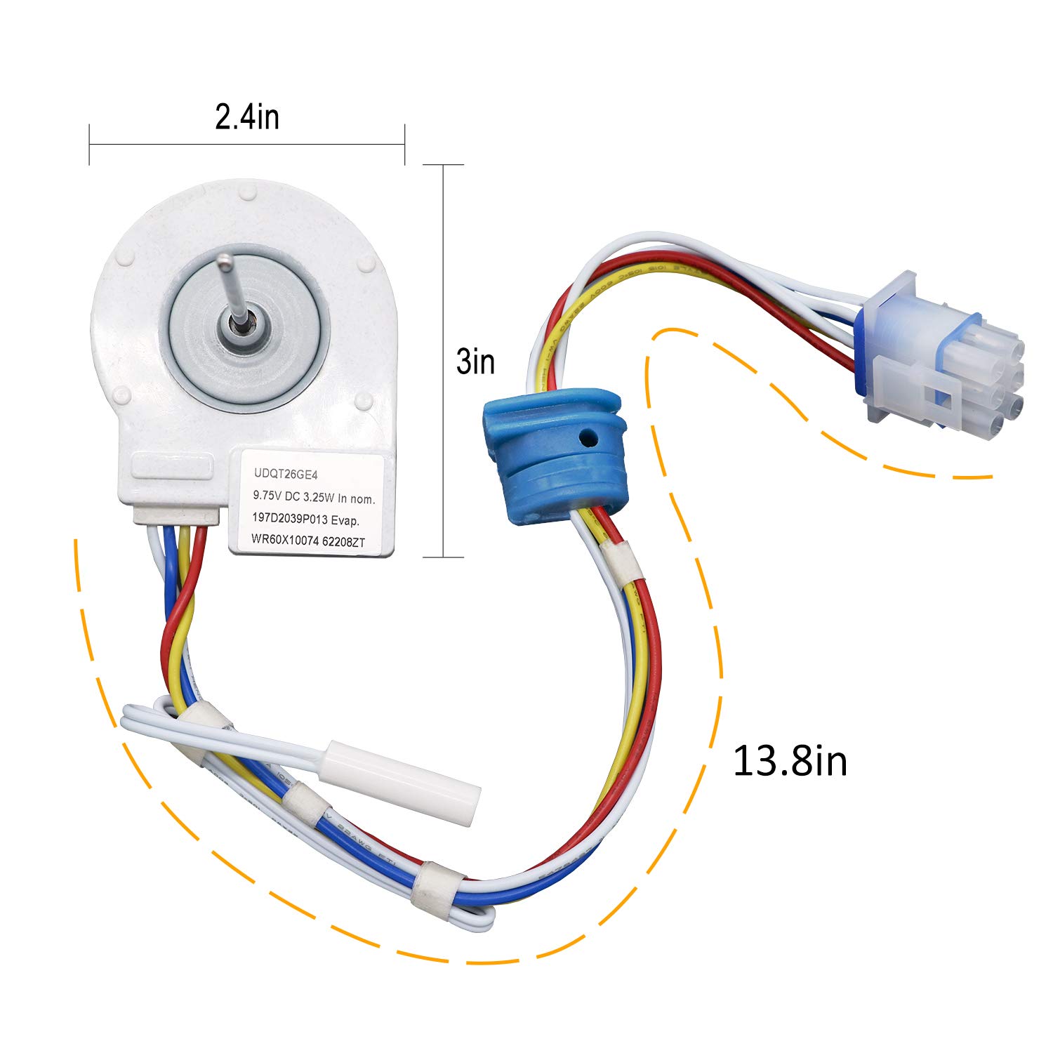 PART MODEL:WR60X10307 WR60X10074 refrigerator evaporator fan motor with thermistor in the harness, it circulates air through the fresh food compartment for efficient cooling (9.75V DC 3.25W)