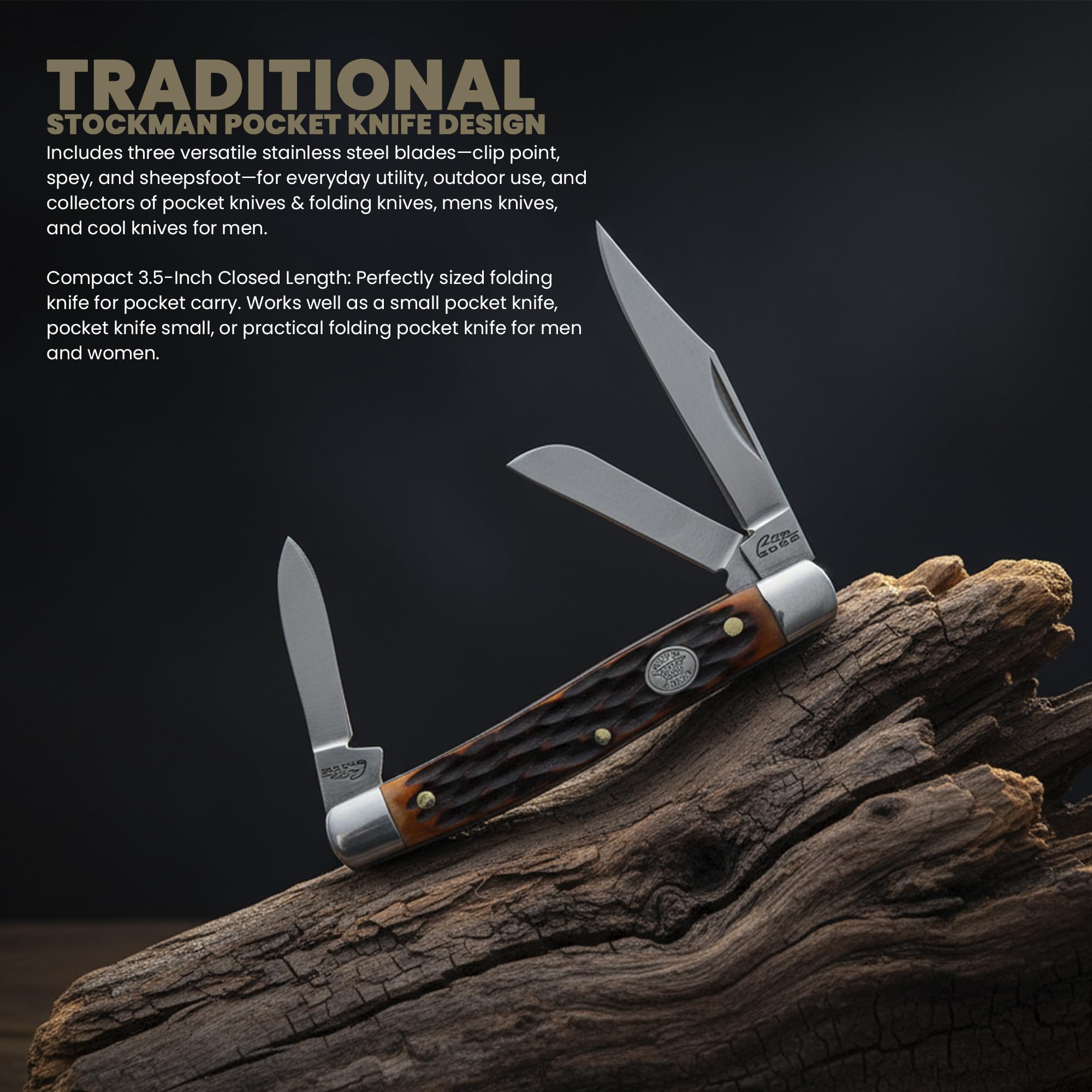 Classic Stockman Pocket Knife Design: Traditional 3-blade stockman folding knife with a compact 2.75" closed length. Ideal for collectors of pocket knives & folding knives, mens knives, and cool knives for men.