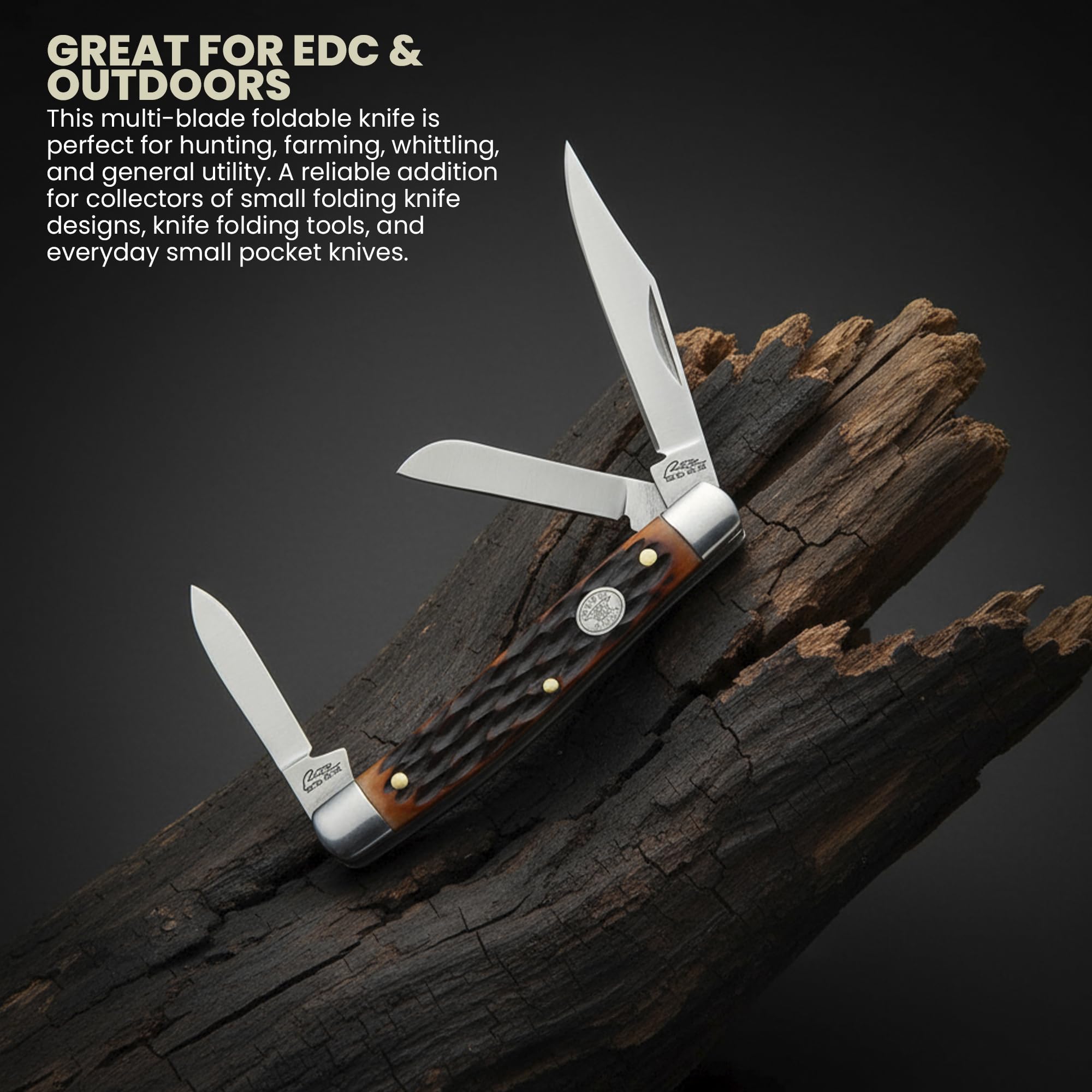 Durable Blades: Three precision-ground stainless steel blades provide long-lasting sharpness for cutting, slicing, and whittling. Perfect for pocket knives for men, pocket knives for women, or a reliable knife for men.