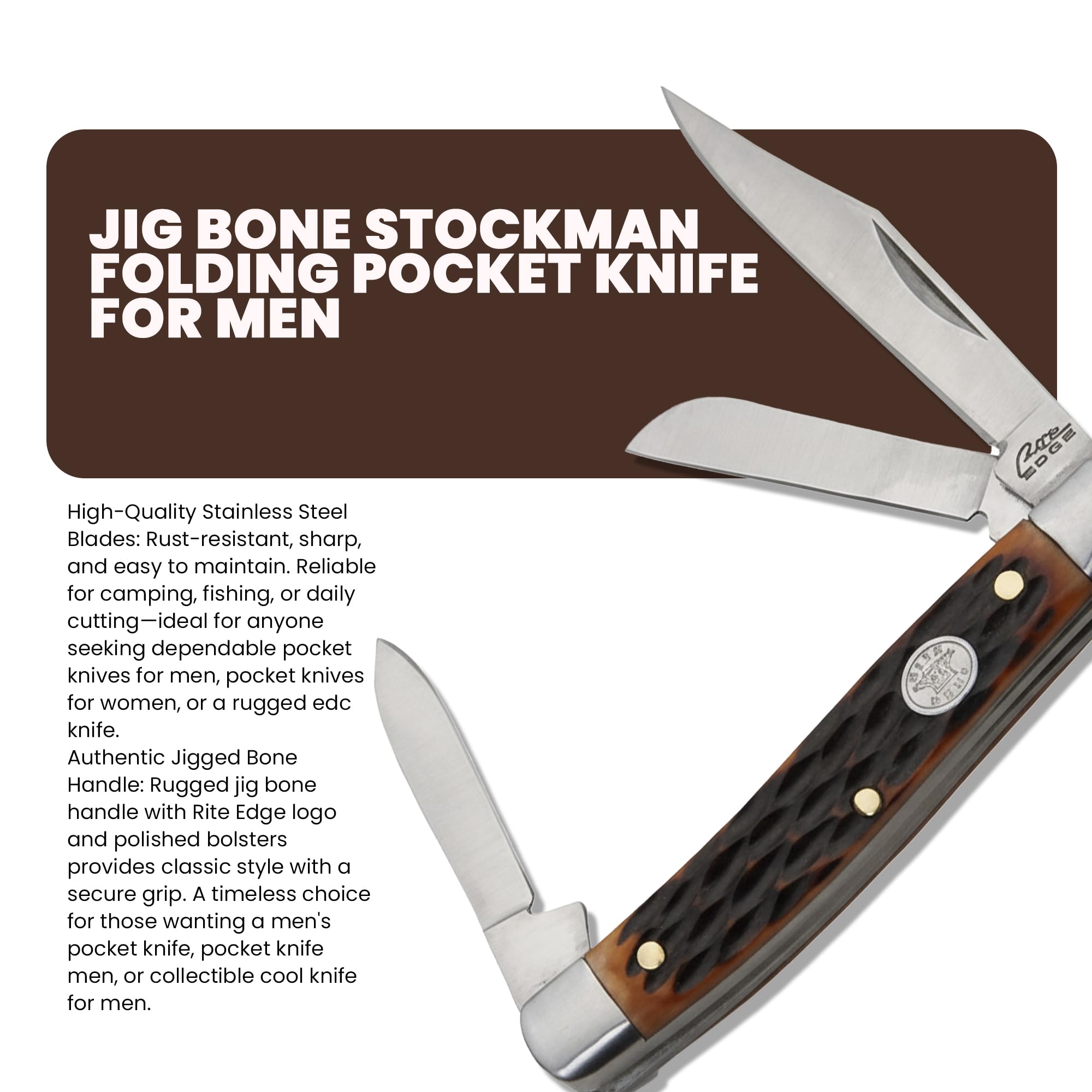 Premium Handle: Jigged bone handle with the Rite Edge logo ensures a vintage look, durability, and comfortable grip. A timeless men's pocket knife, pocket knife men, or cool knife for men.