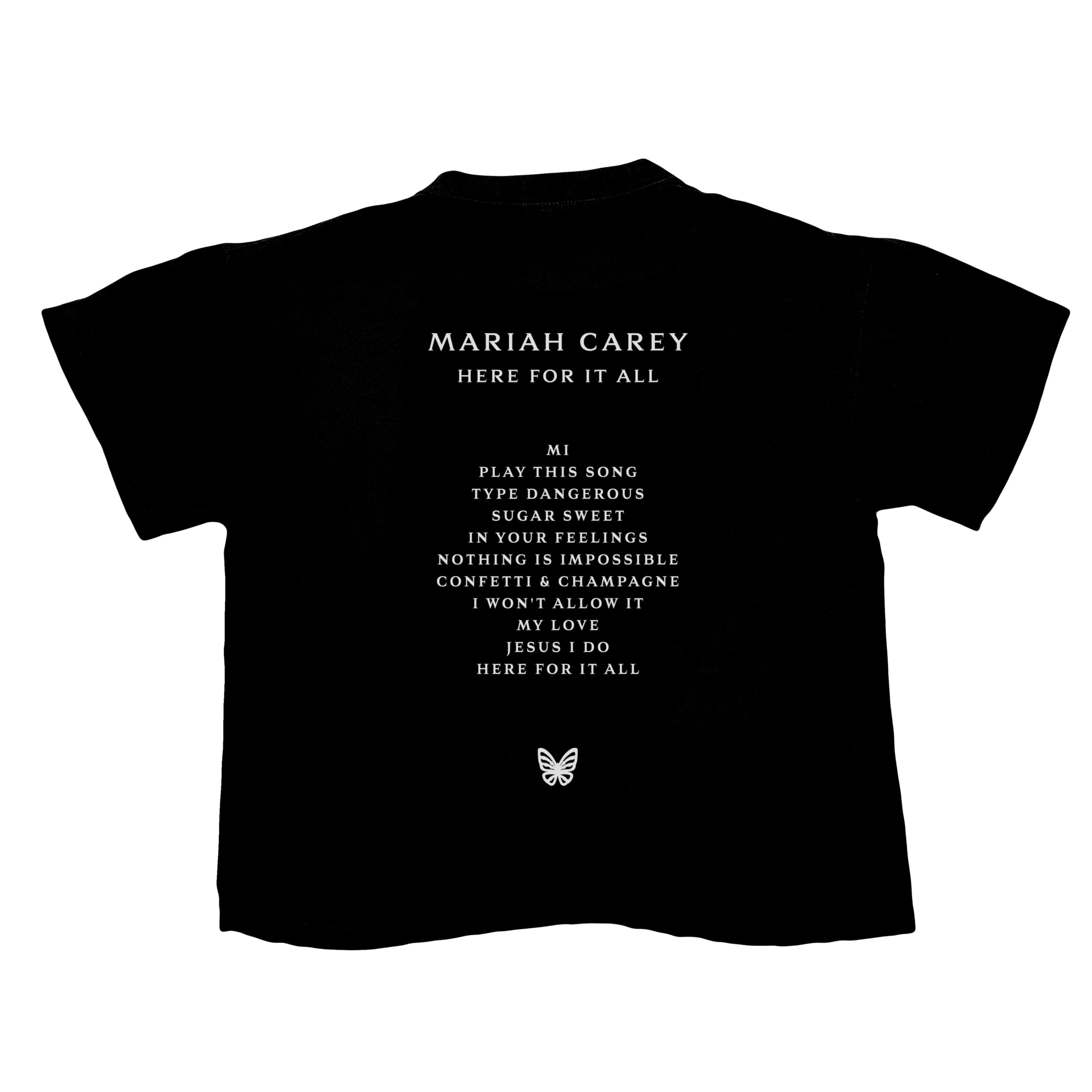 Description Official Mariah Carey Merchandise. This Amazon Exclusive Mariah Carey Here For It All Black Tracklist T-Shirt features a jumbo photo real print of Mariah Carey on the front and screen printed album track list on the back.