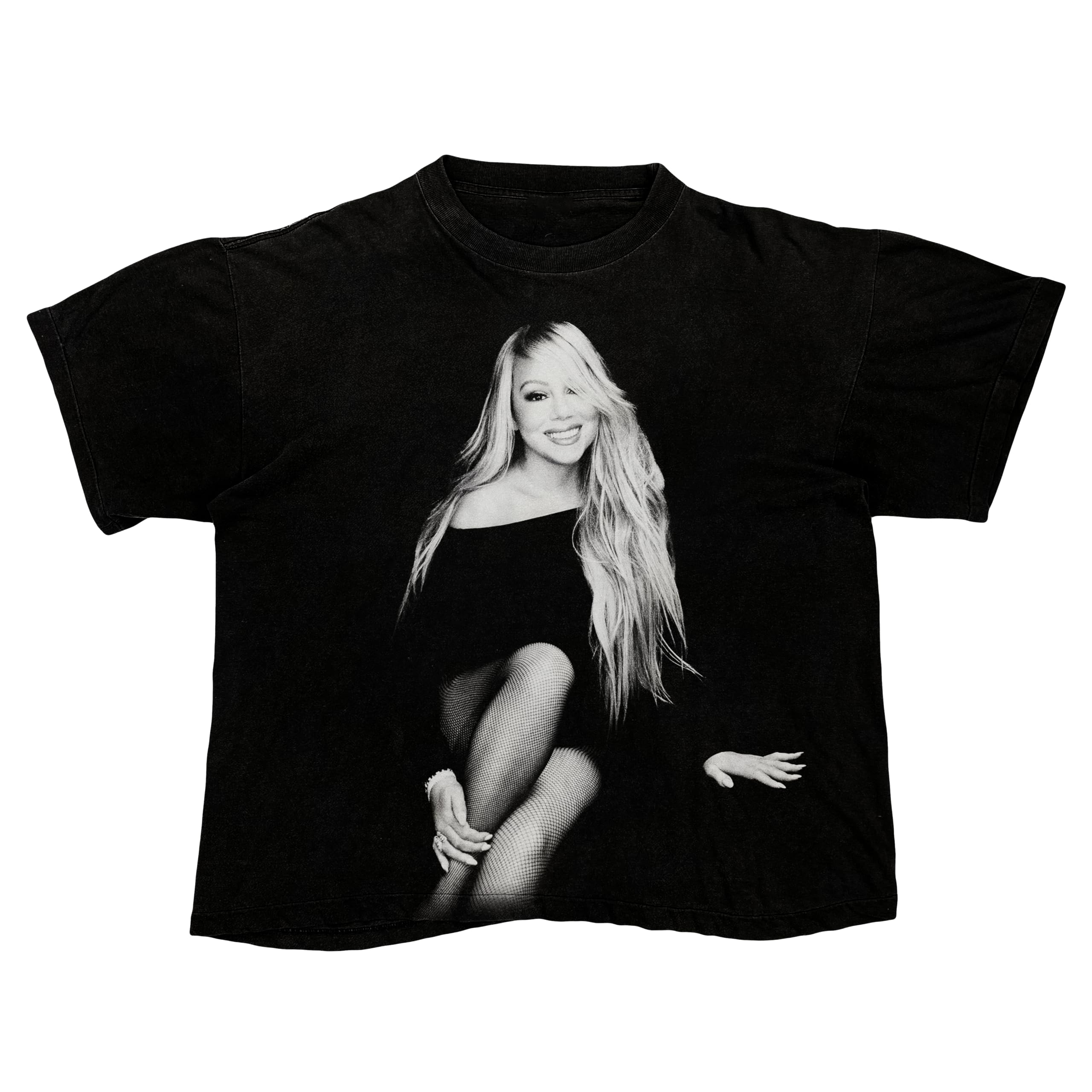 Front - Black short sleeve t-shirt with graphic featuring a jumbo photo real screen print image of Mariah Carey