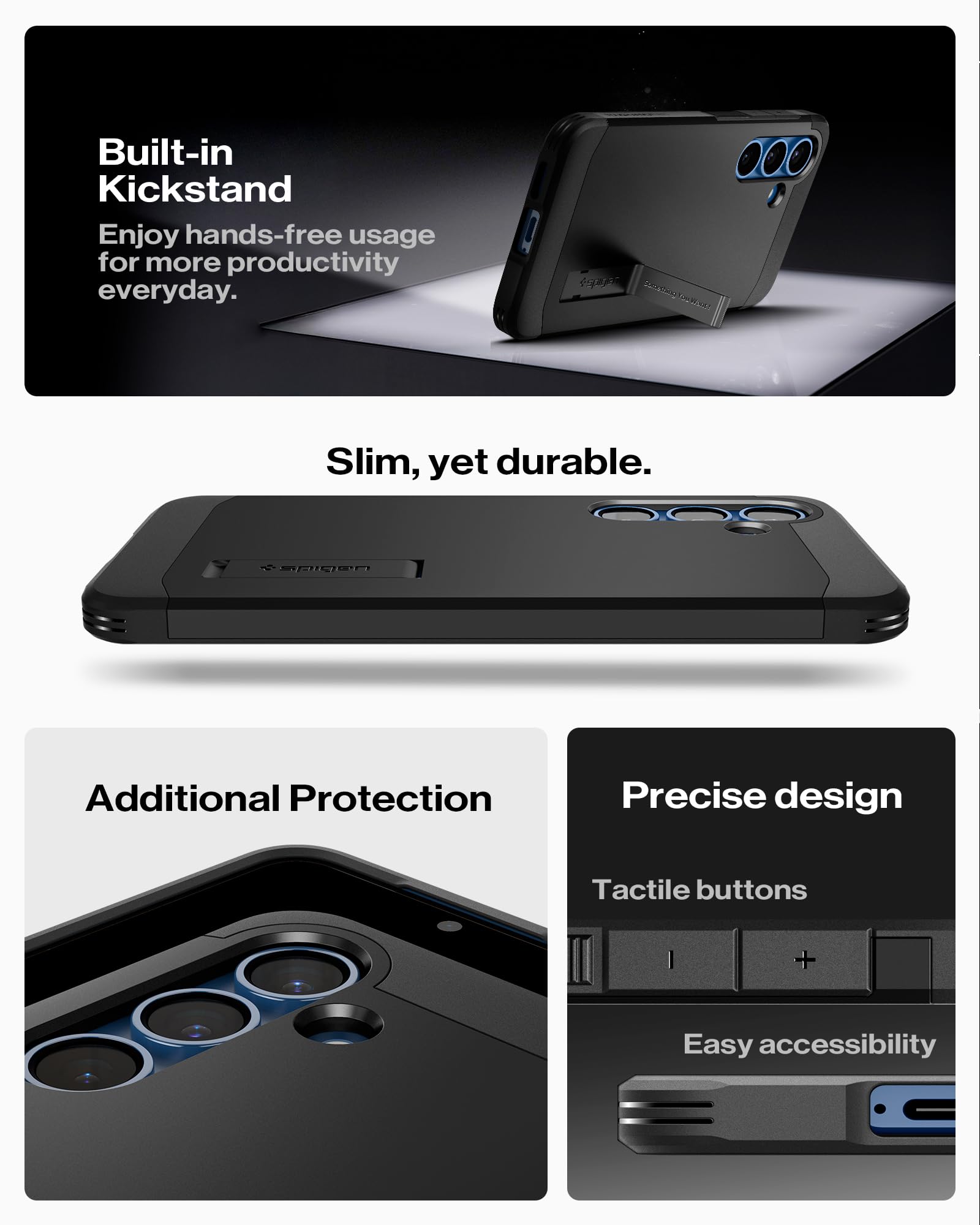 All-new slim and durable case with a built-in kickstand for hands-free viewing—carefully align the edges and snap in your phone, making sure to fit the bottom right corner last for optimal kickstand performance