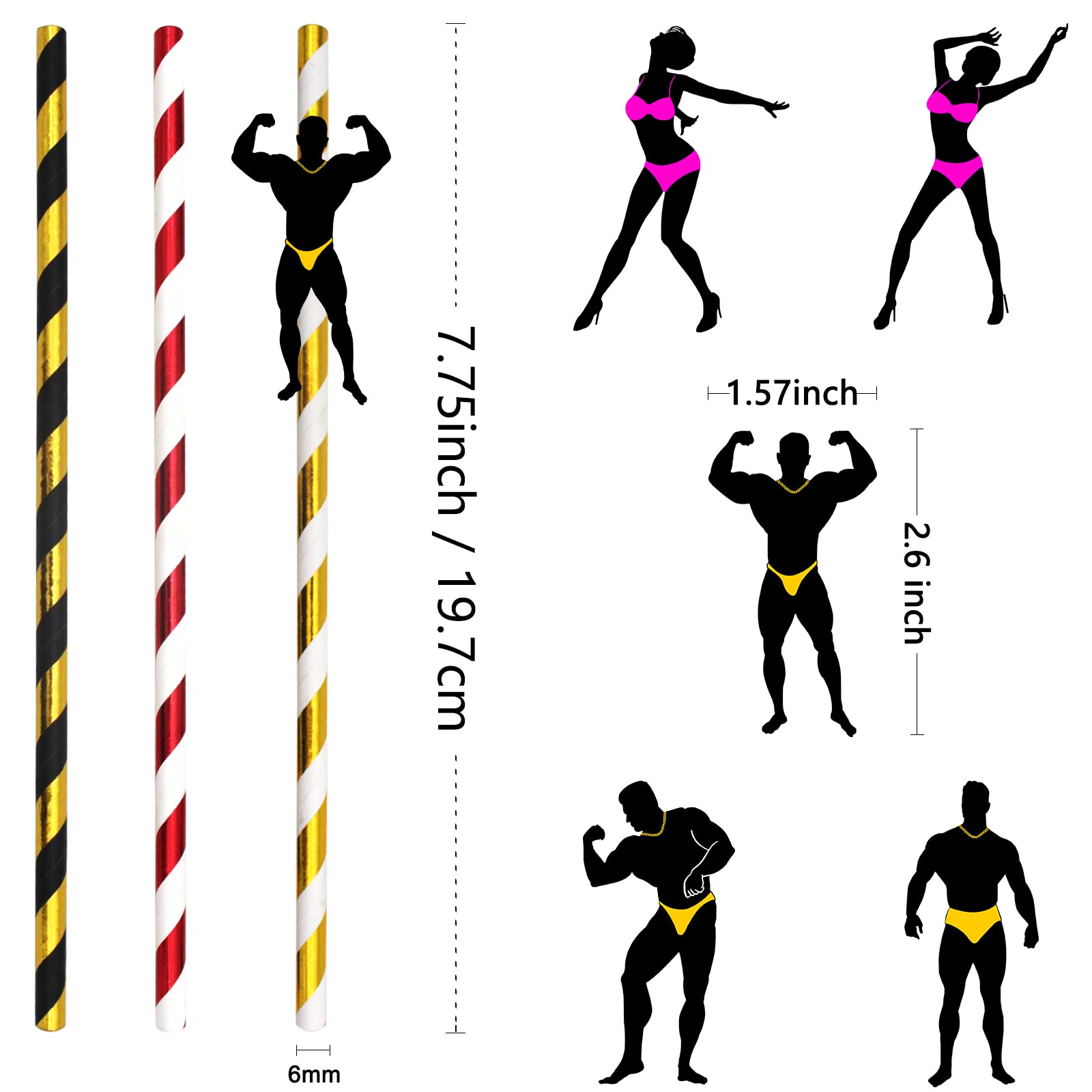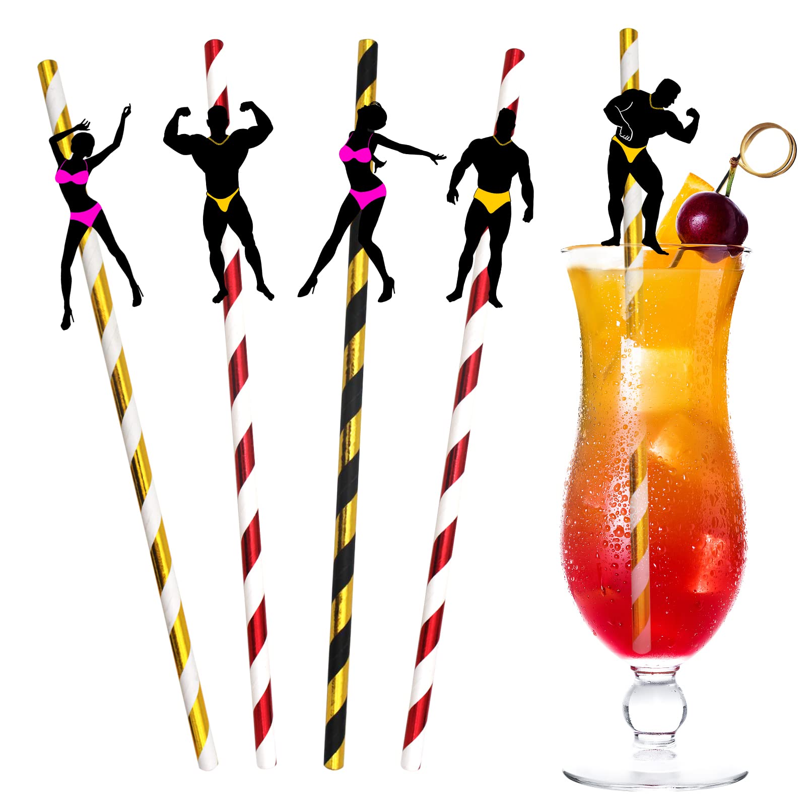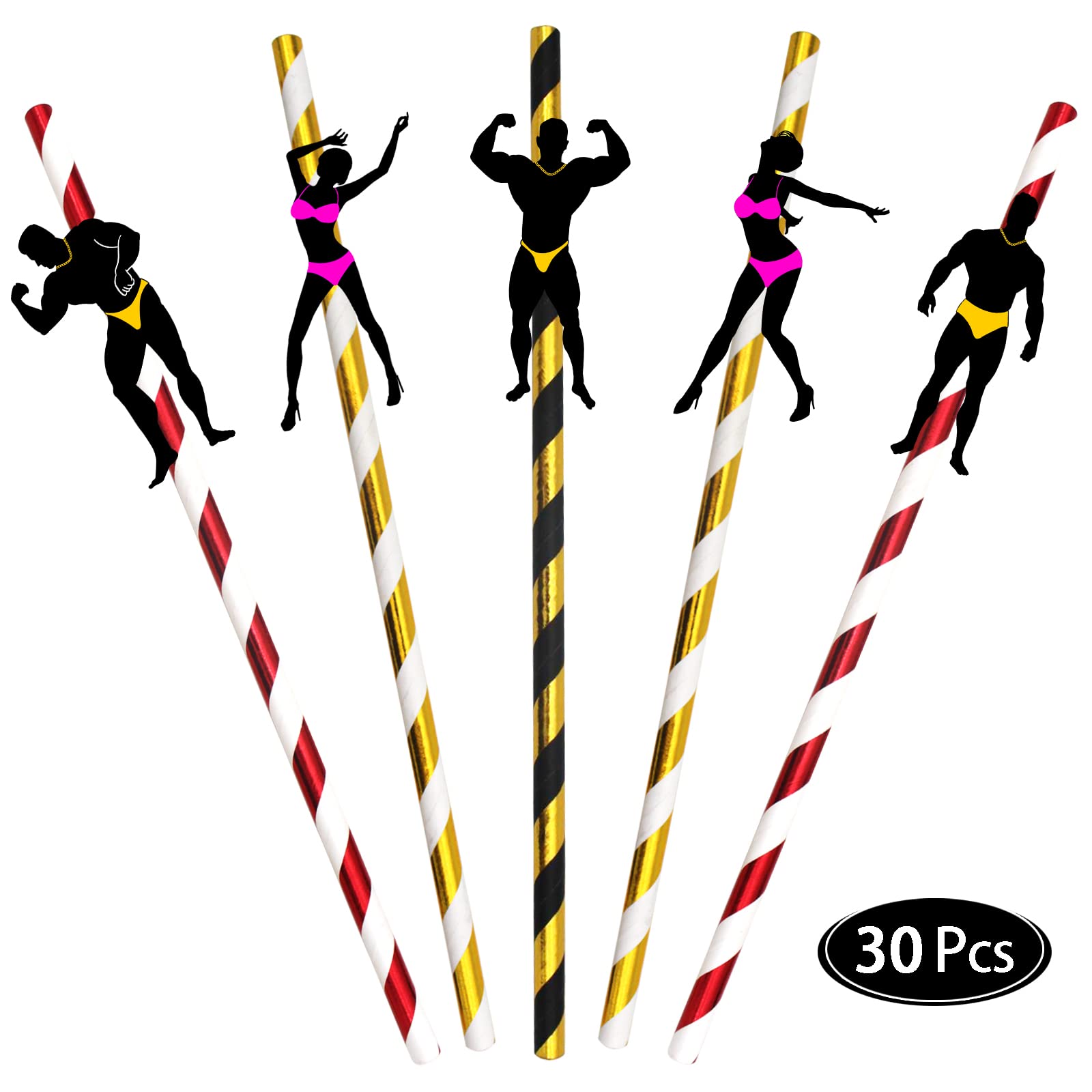 FITNESS HUMAN POSTURE DRINKING STRAWS -You will get 30-pcs funny men pole dancer drinking straws assorted in gold,white,black ,striped design,modern & retro style. Assorted bright colored paper straws make your day or party more happy and bright.