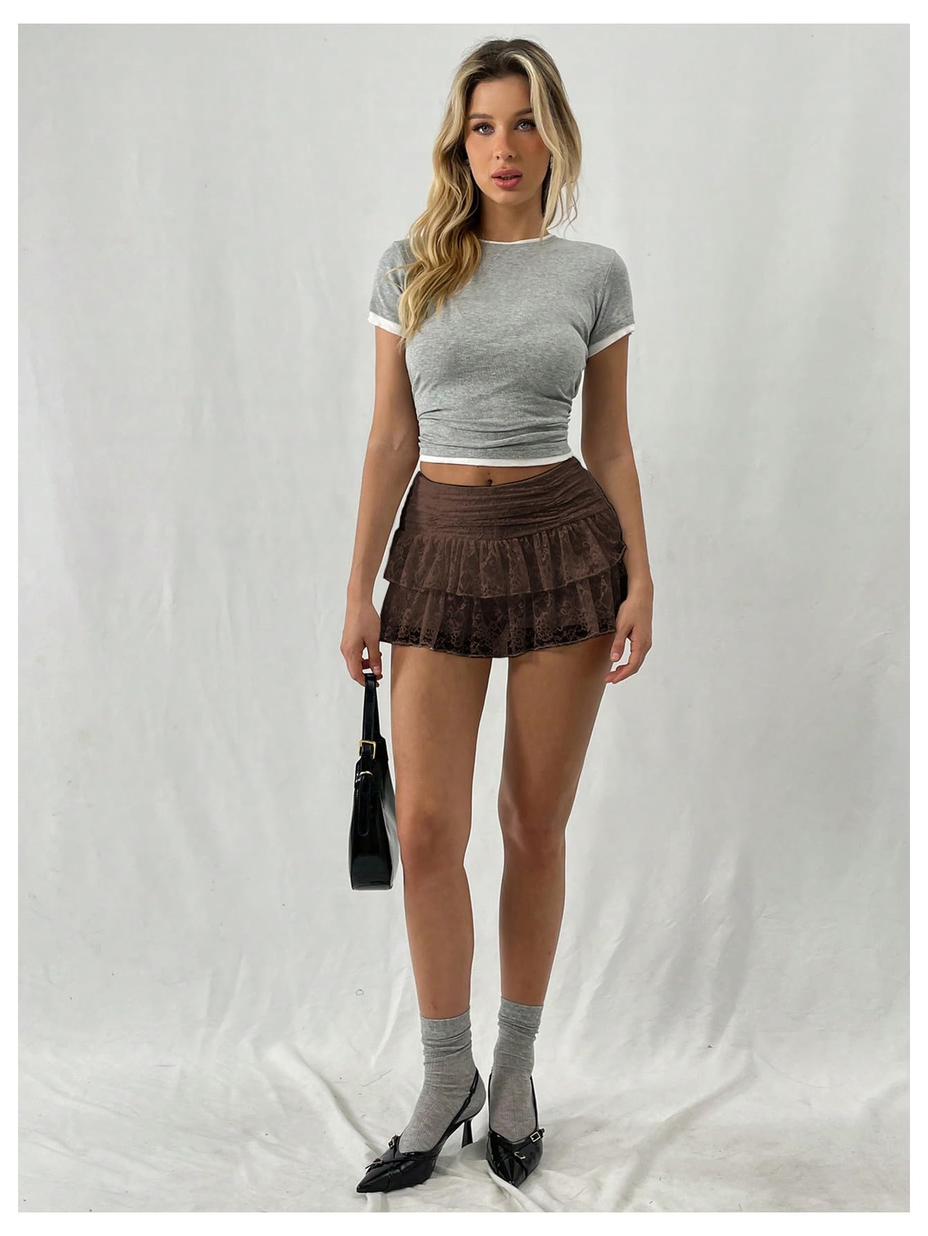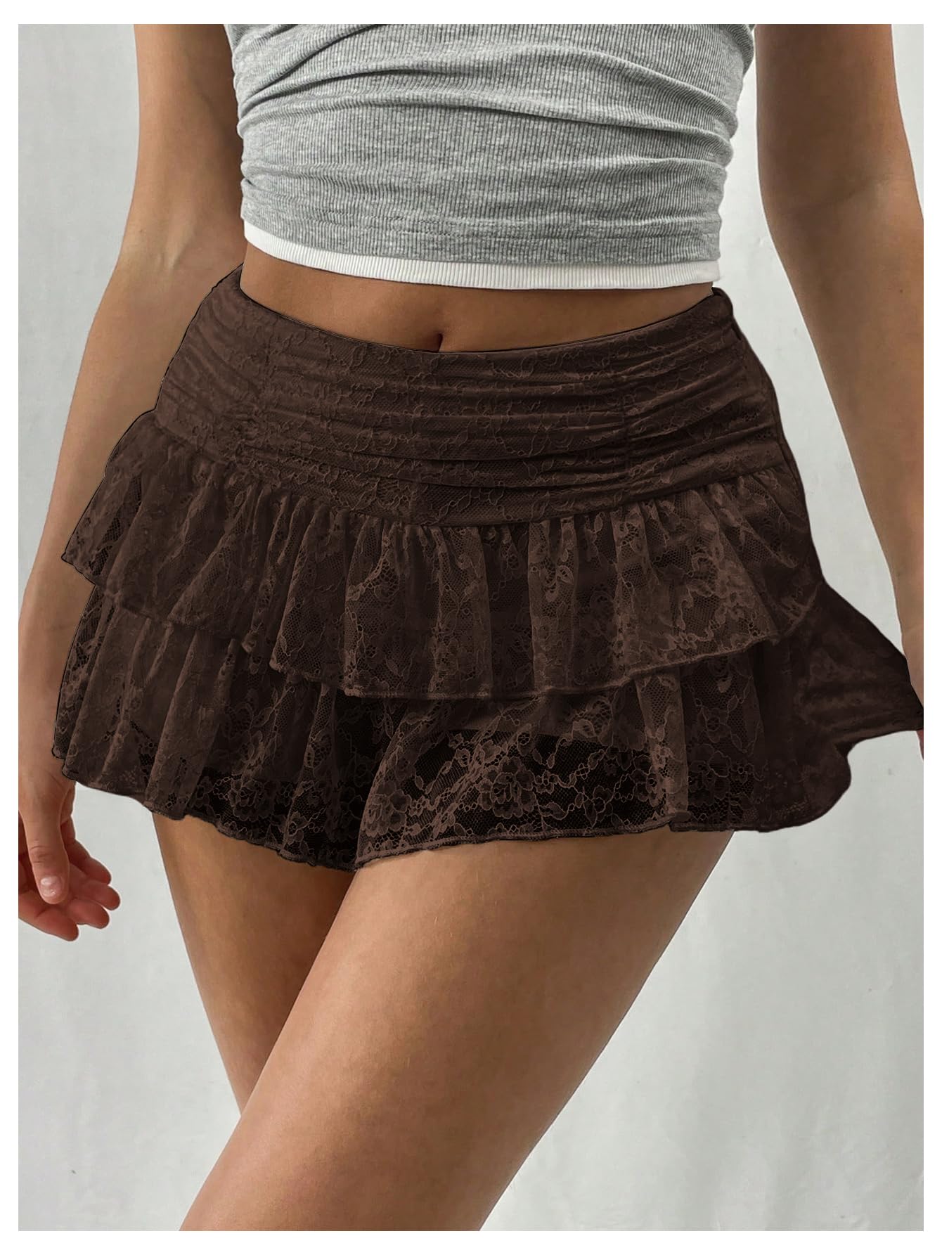 This adorable mini skirt features delicate lace layers, a flattering ruched design, and a feminine A-line silhouette, making it a stylish and versatile addition to your wardrobe